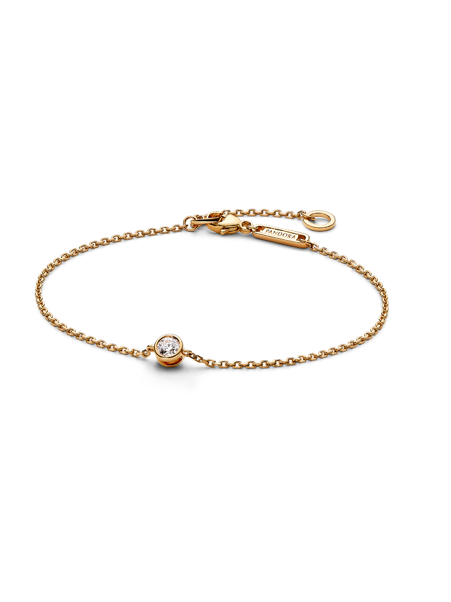 Meet your new essential lab-grown diamond bracelet. The Pandora Era Bezel 14k Gold Lab-grown Diamond Chain Bracelet features a single 0.15 carat lab-grown diamond at its centre, in a 14k gold bezel setting with a sleek, contemporary aesthetic. Cut-outs on the back and sides of the bezel setting let in the light for ultimate sparkle. The lab-grown diamond is fixed to a 14k gold diamond-cut cable chain with faceted links that reflect the light, lending the bracelet a subtle shimmer. Adjustable to two lengths, it's the perfect elevated staple for your everyday looks. Each Pandora Lab-grown diamond is treated with a post-growth color enhancement called annealing.