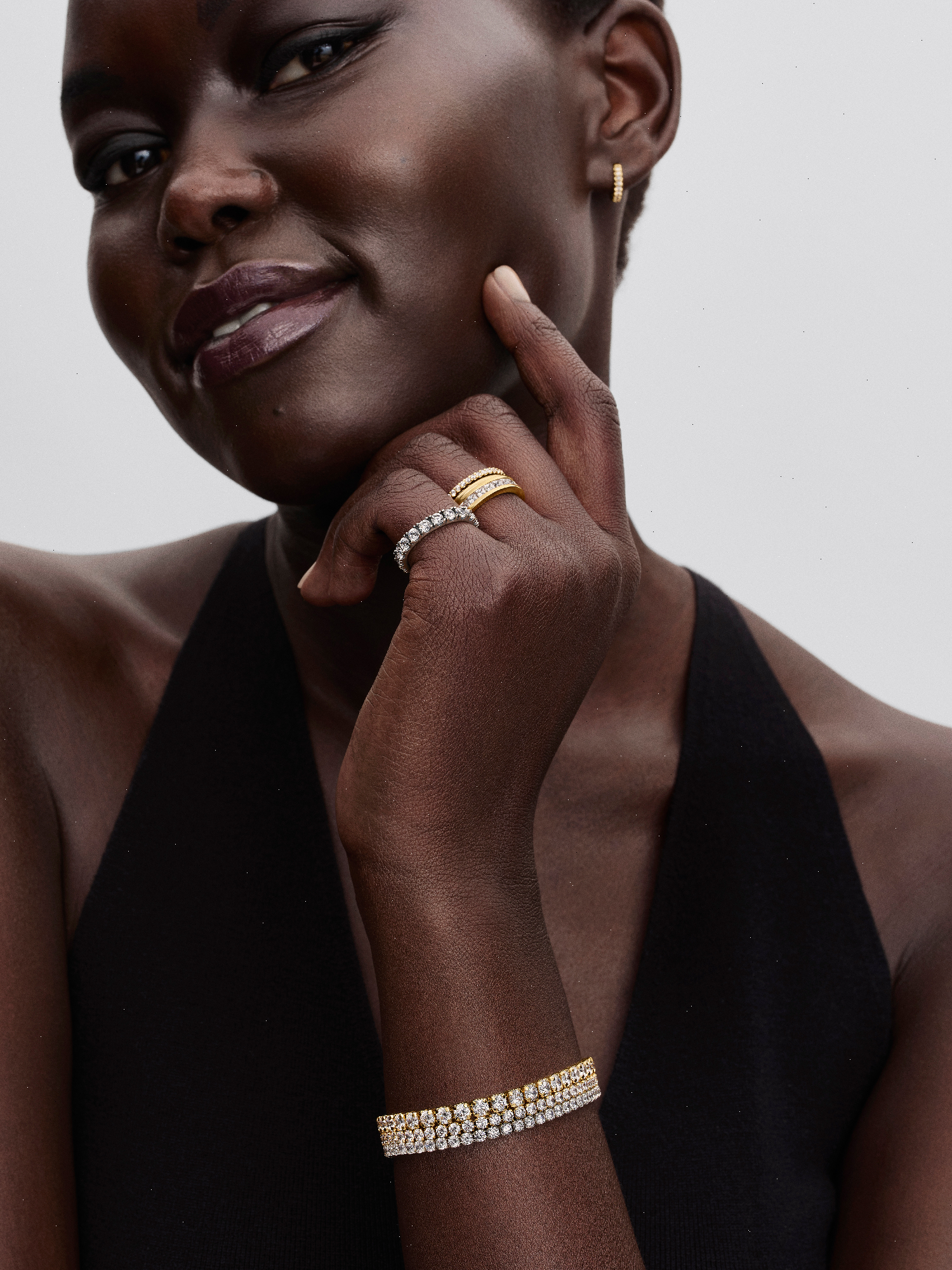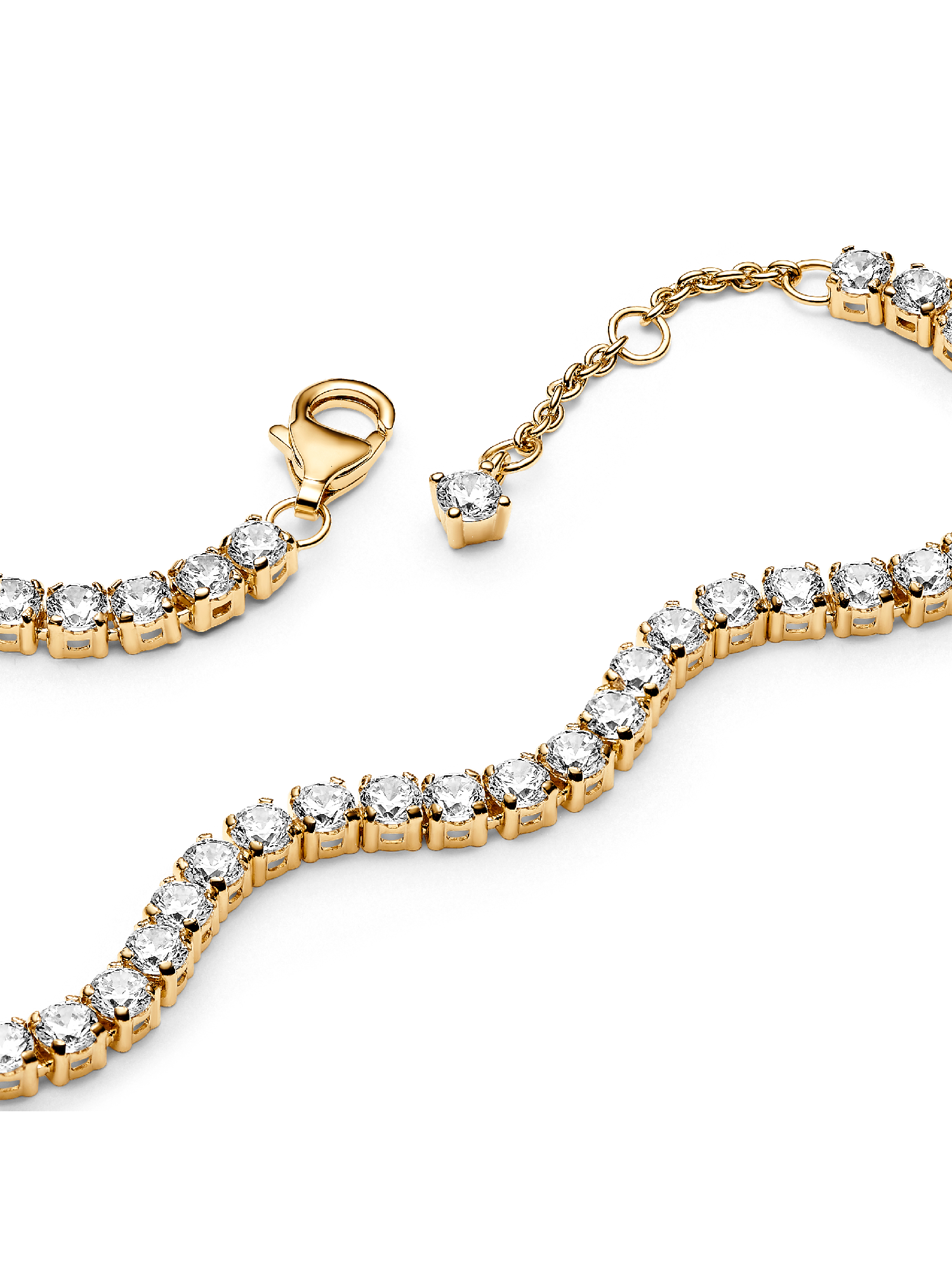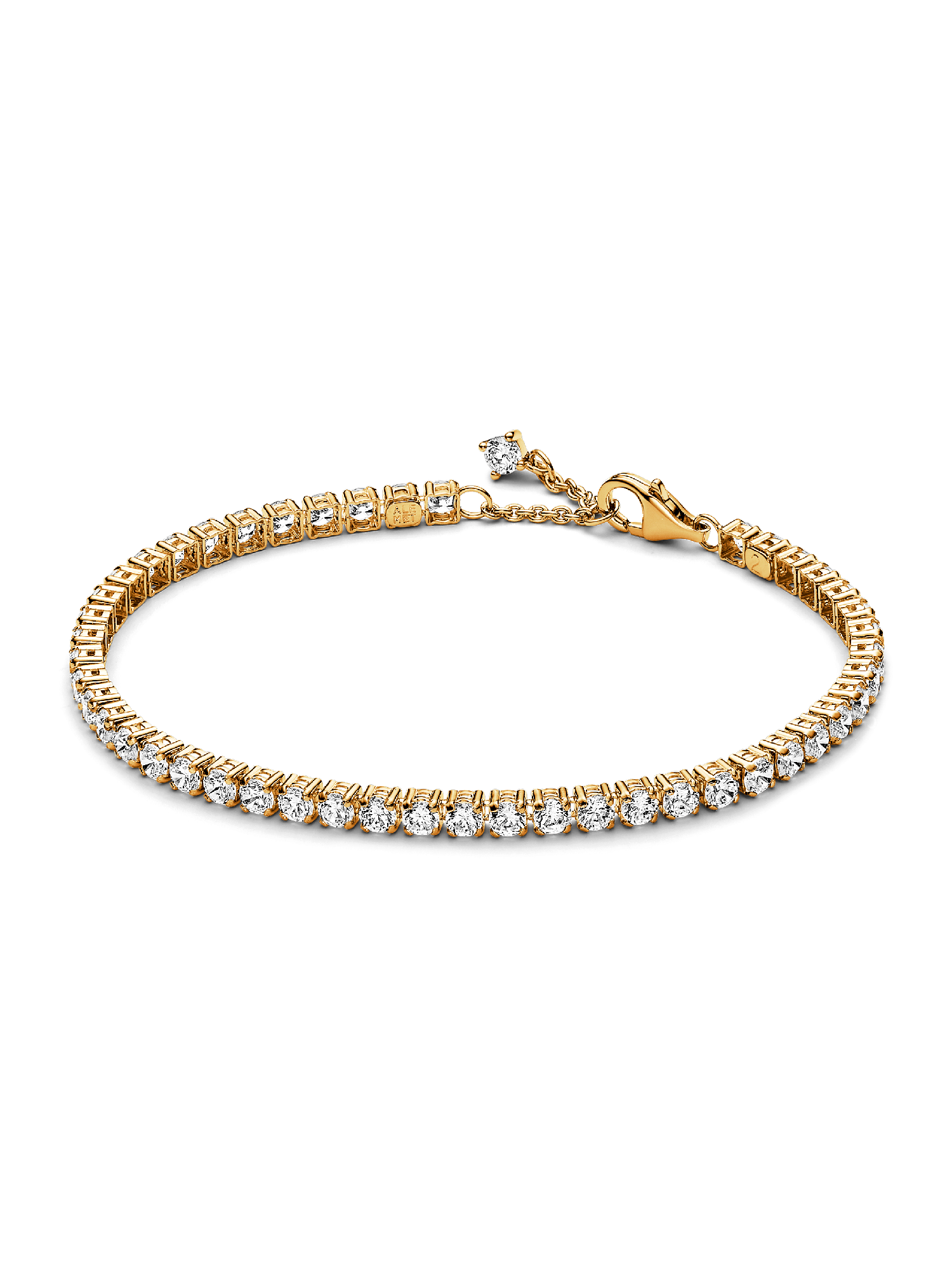 Choose a modern spin on a classic style with the Sparkling Tennis Bracelet. This 14k gold-plated bracelet sparkles with 48 round prong-set stones. Adjustable and dynamic, this cubic zirconia tennis bracelet features one sparkling stone dangling from beside the clasp for the perfect finishing touch. Designed with slightly larger stones than our other tennis bracelet styles, this bracelet is perfect for making a fresh statement when stacked with other bracelets in mixed tones and styles.