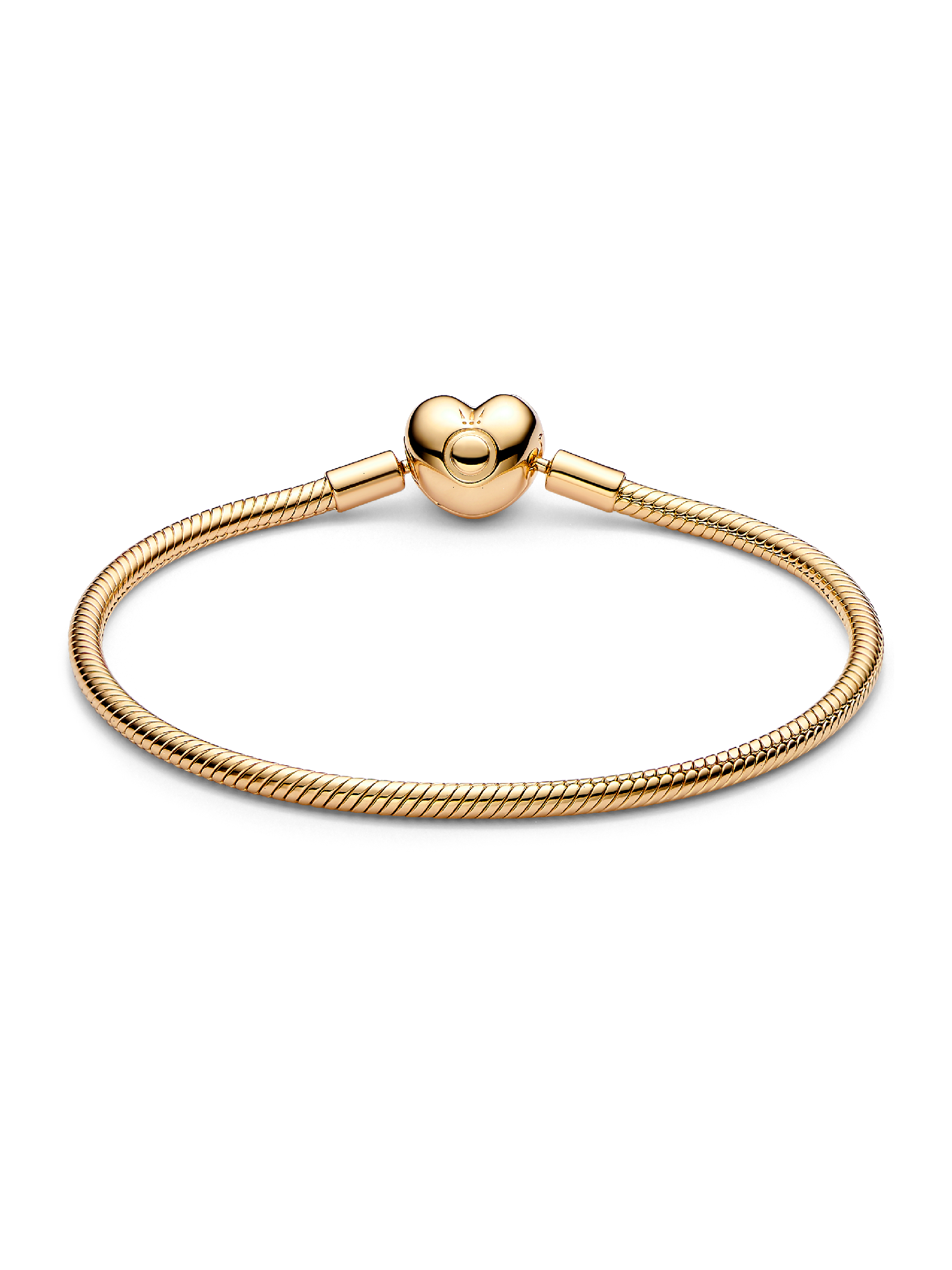Our iconic snake chain bracelet gets a shining update. The heart-shaped clasp of this 14k gold-plated bracelet includes an engraved Pandora logo on one side and the iconic Pandora Crown O on the other.