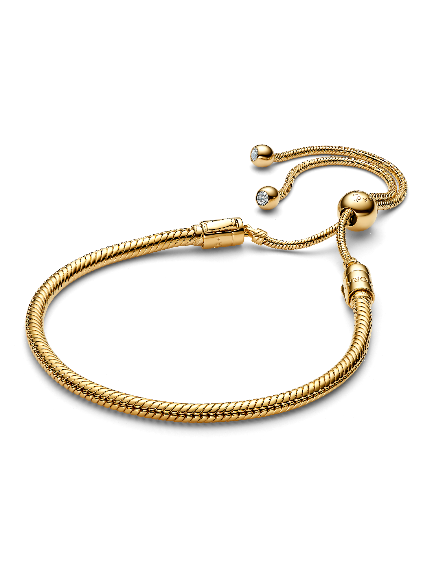 Our Pandora Moments Snake Chain Slider Bracelet is a sophisticated spin on the classic friendship bracelet. Crafted in 14k gold plating, it has two moveable end caps — both set with shimmering stones. An innovative sliding clasp makes it easy to adjust to your size. The perfect present for friends and loved ones, it can be styled by lifting either end cap and adding your favourite charms.