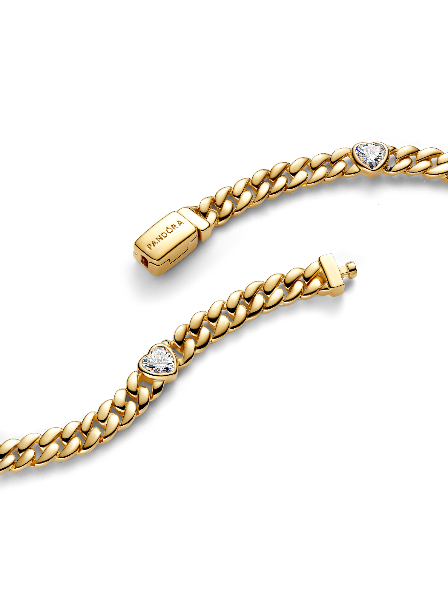 Fall for our Cuban bracelet chain set with heart-shaped stones. Plated to perfection in 14k gold, it represents the beauty of lasting connections.