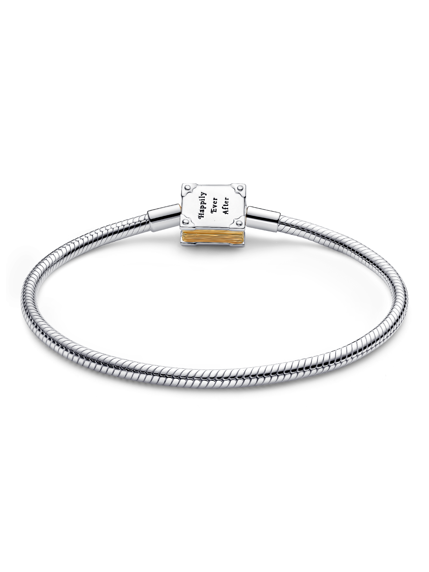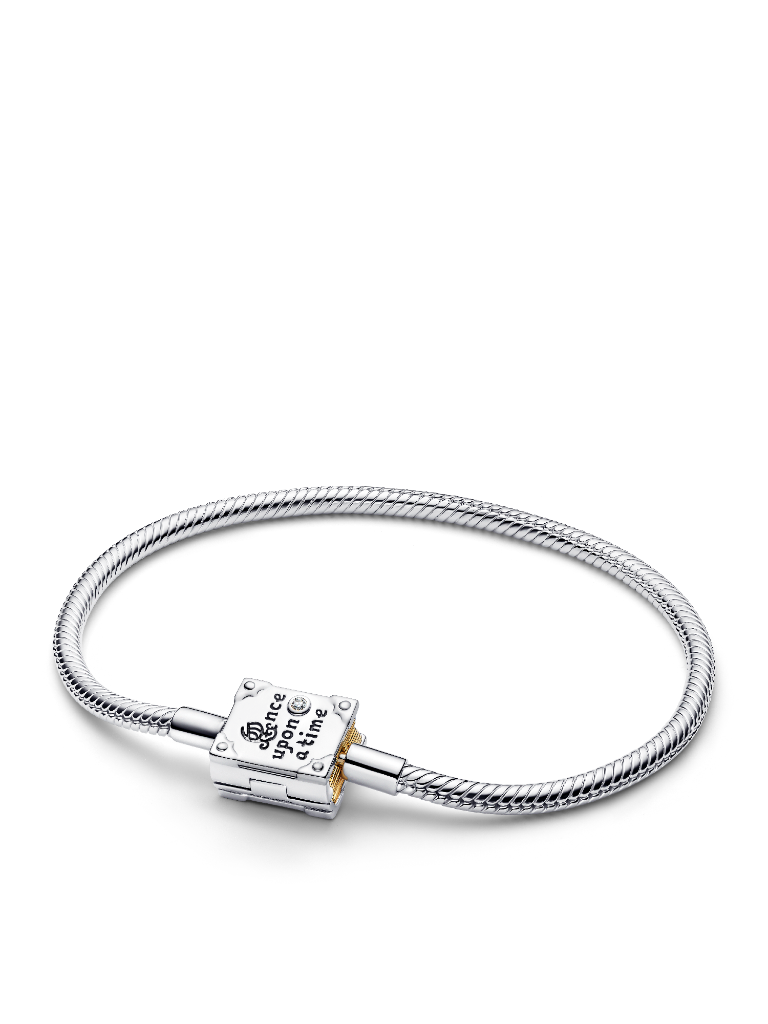 In sterling silver, this Disney x Pandora snake chain bracelet secures with a book clasp. Detailed with engravings on both sides, a lab-grown diamond and 14k-gold plated pages, it magically styles your next chapter.