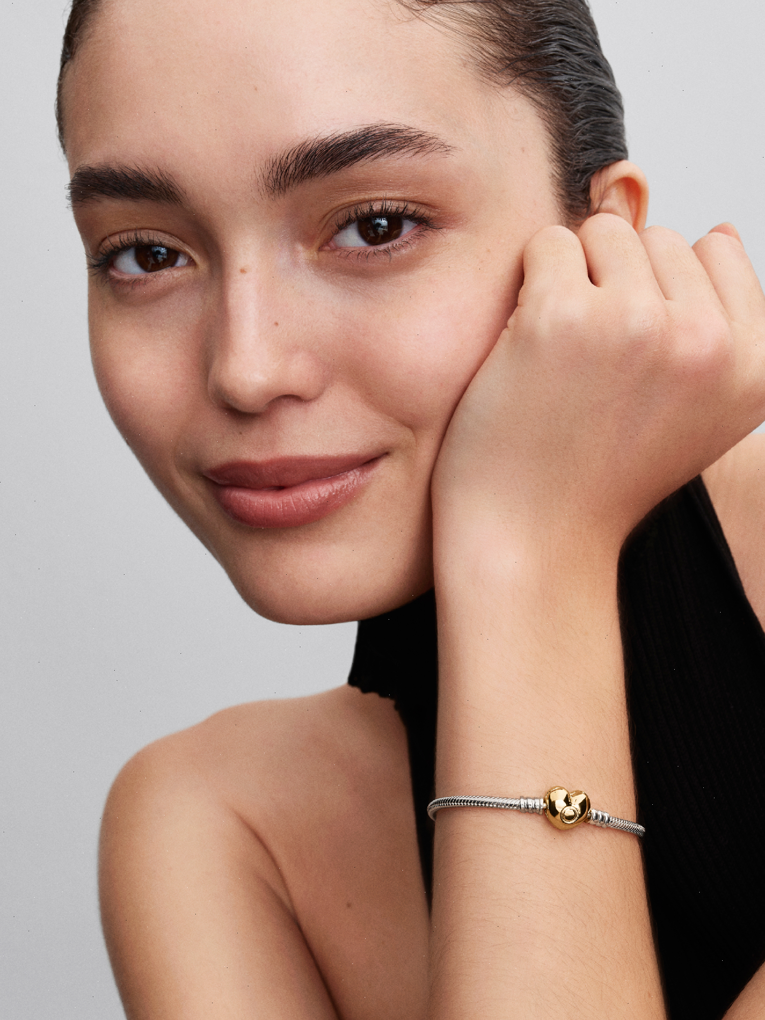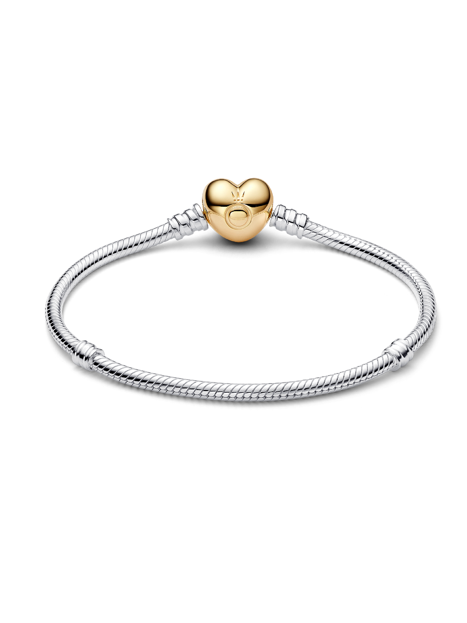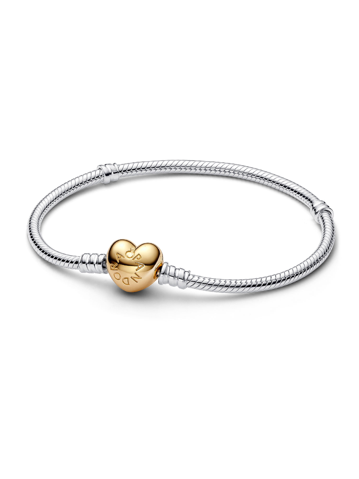 A romantic version of Pandora's bestselling bracelet. Hand-finished with a 14k gold-plated heart-shaped clasp, this sterling silver snake chain bracelet makes a sleek statement on its own – or styled with your favourite charms.