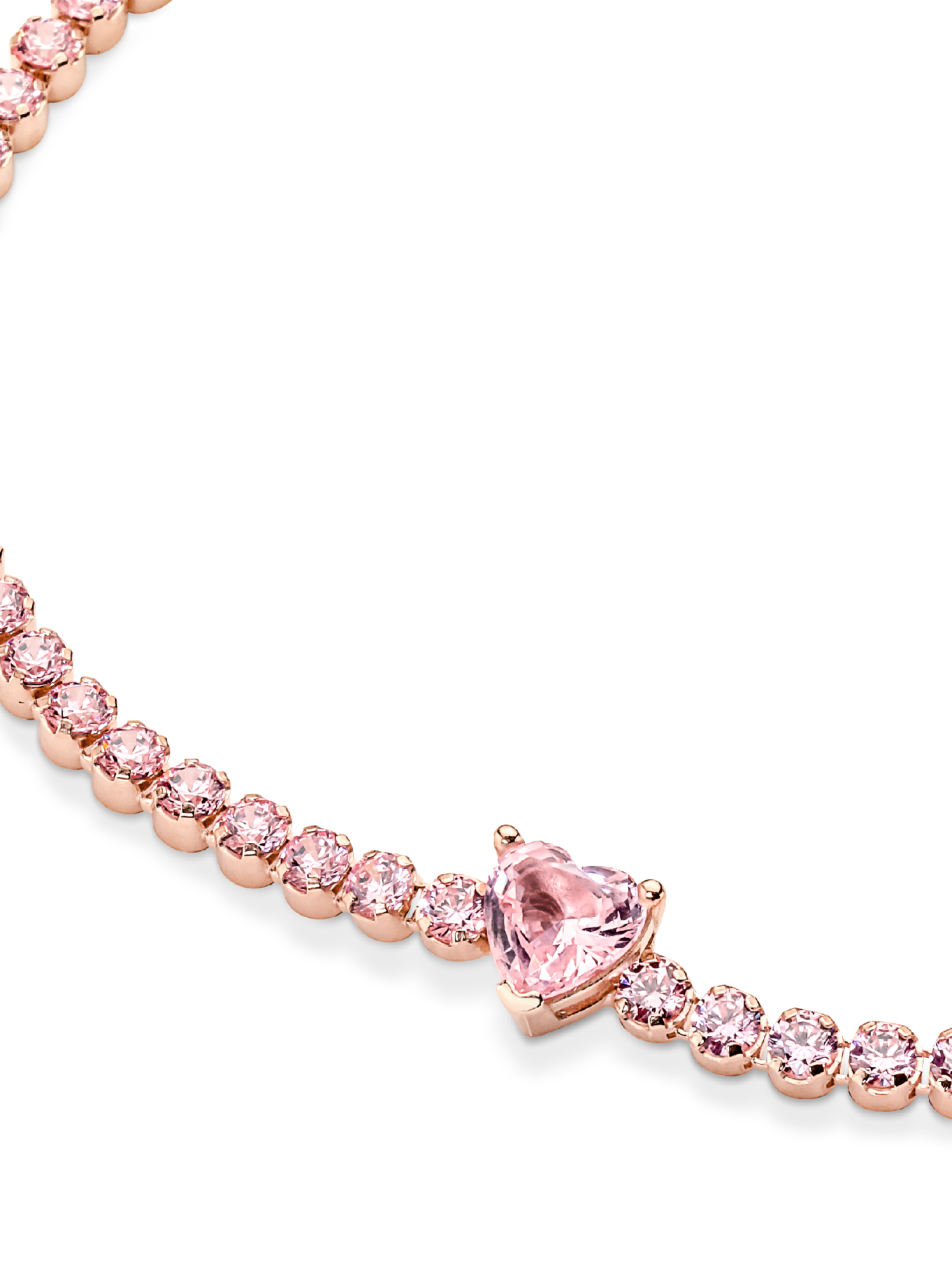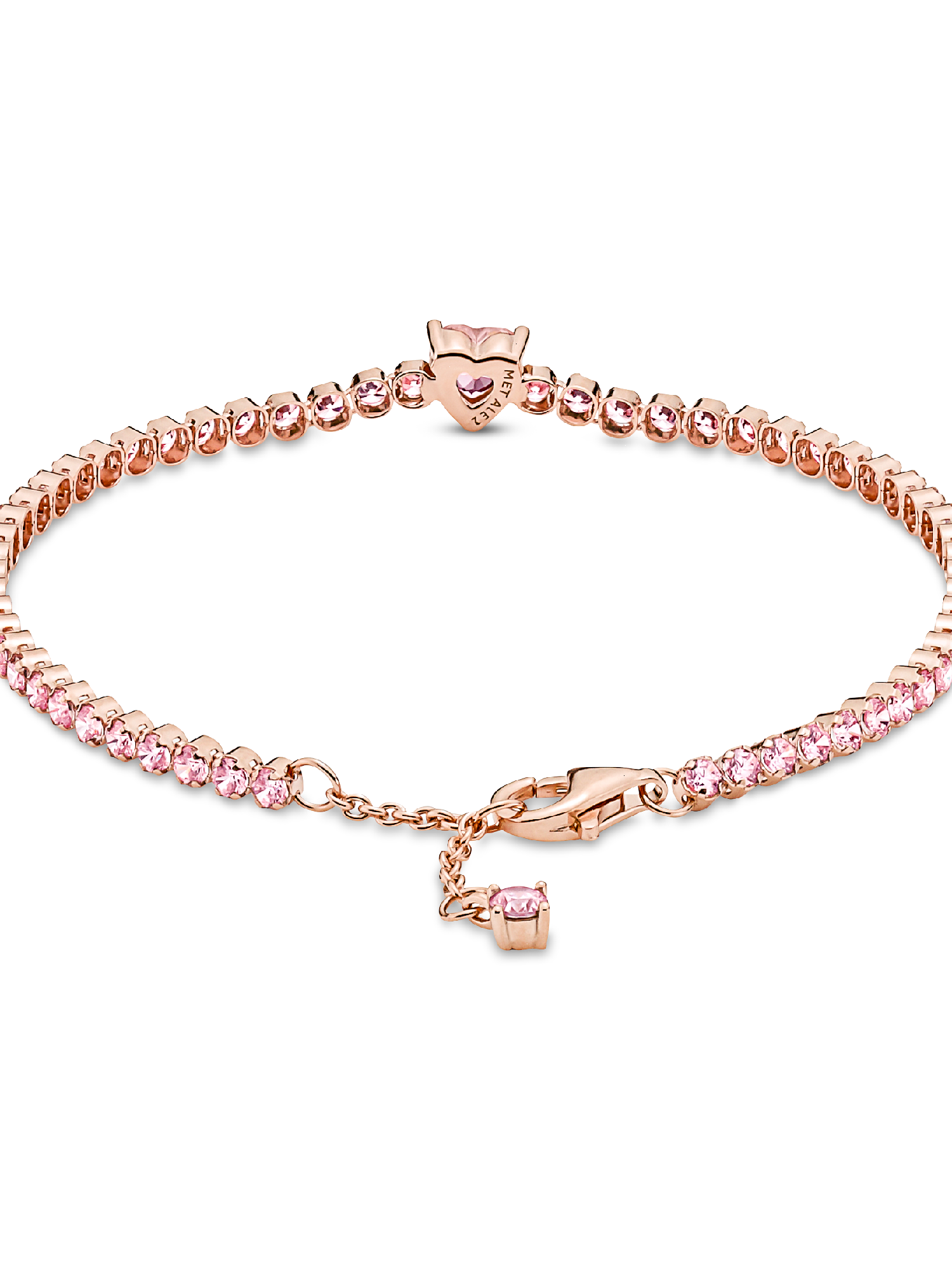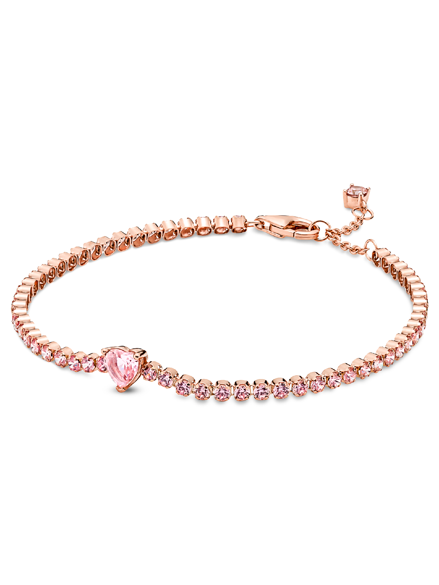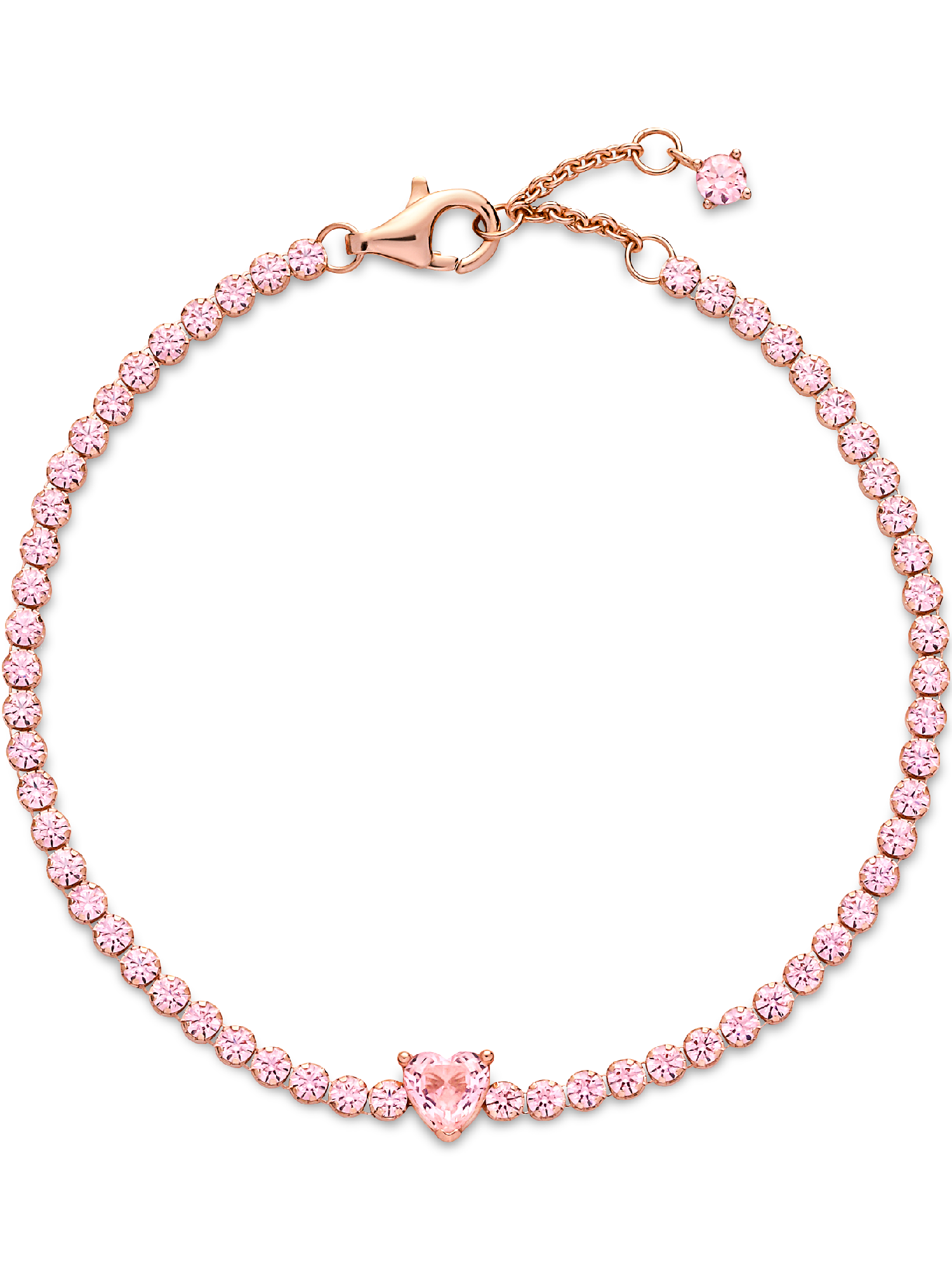 Bring elegance to your outfit with the Sparkling Pavé Tennis Bracelet. Hand-finished in our 14k rose gold-plated unique metal blend, this tennis bracelet is decorated with sparkling orchid pink man-made crystals. A large central heart-shaped stone punctuates a row of evenly sized pavé. The bracelet includes a lobster clasp for safe closure and can be adjusted to three lengths. Style it with other shimmering Pandora Timeless pieces for a classic look that stands out.
