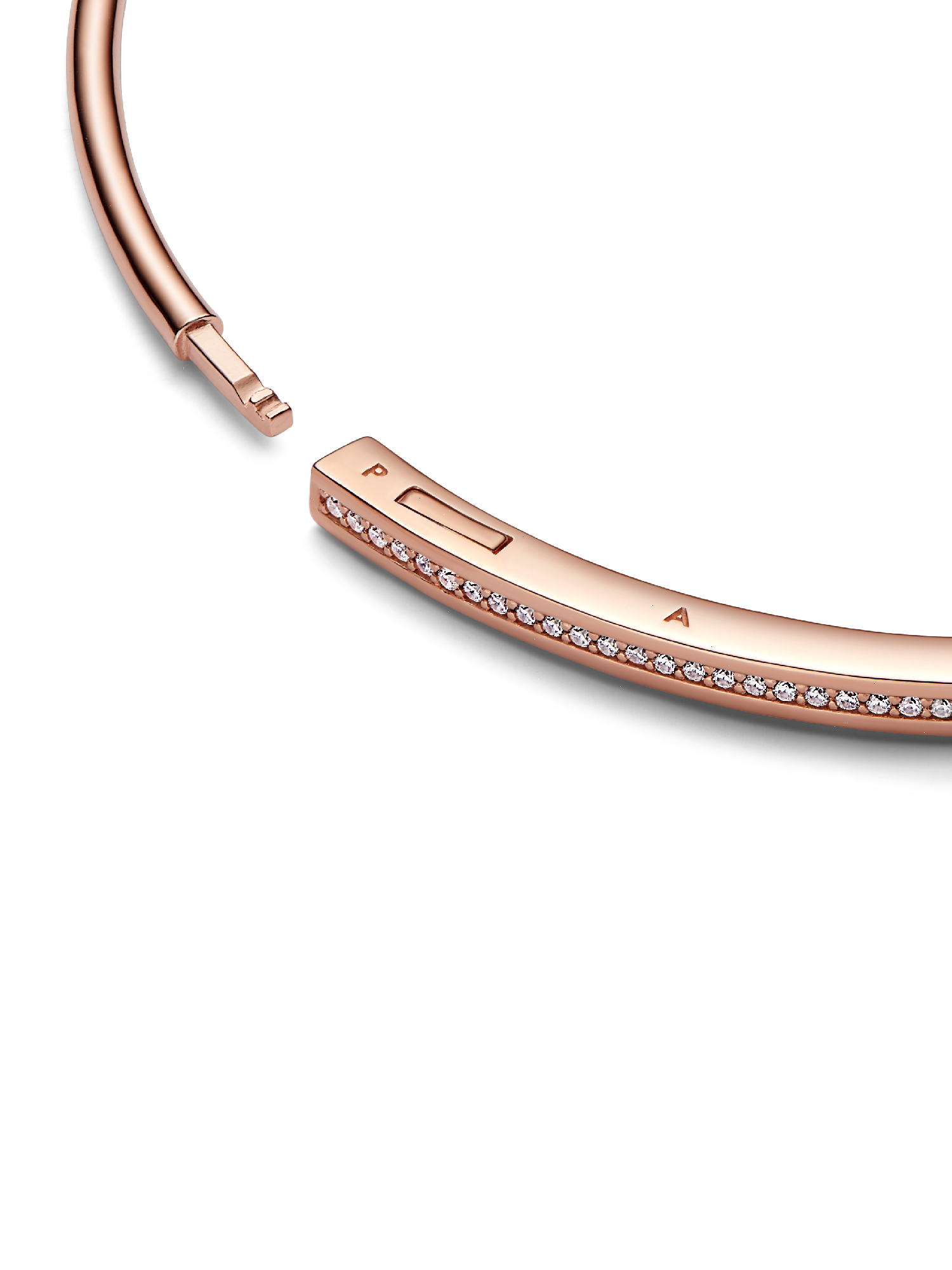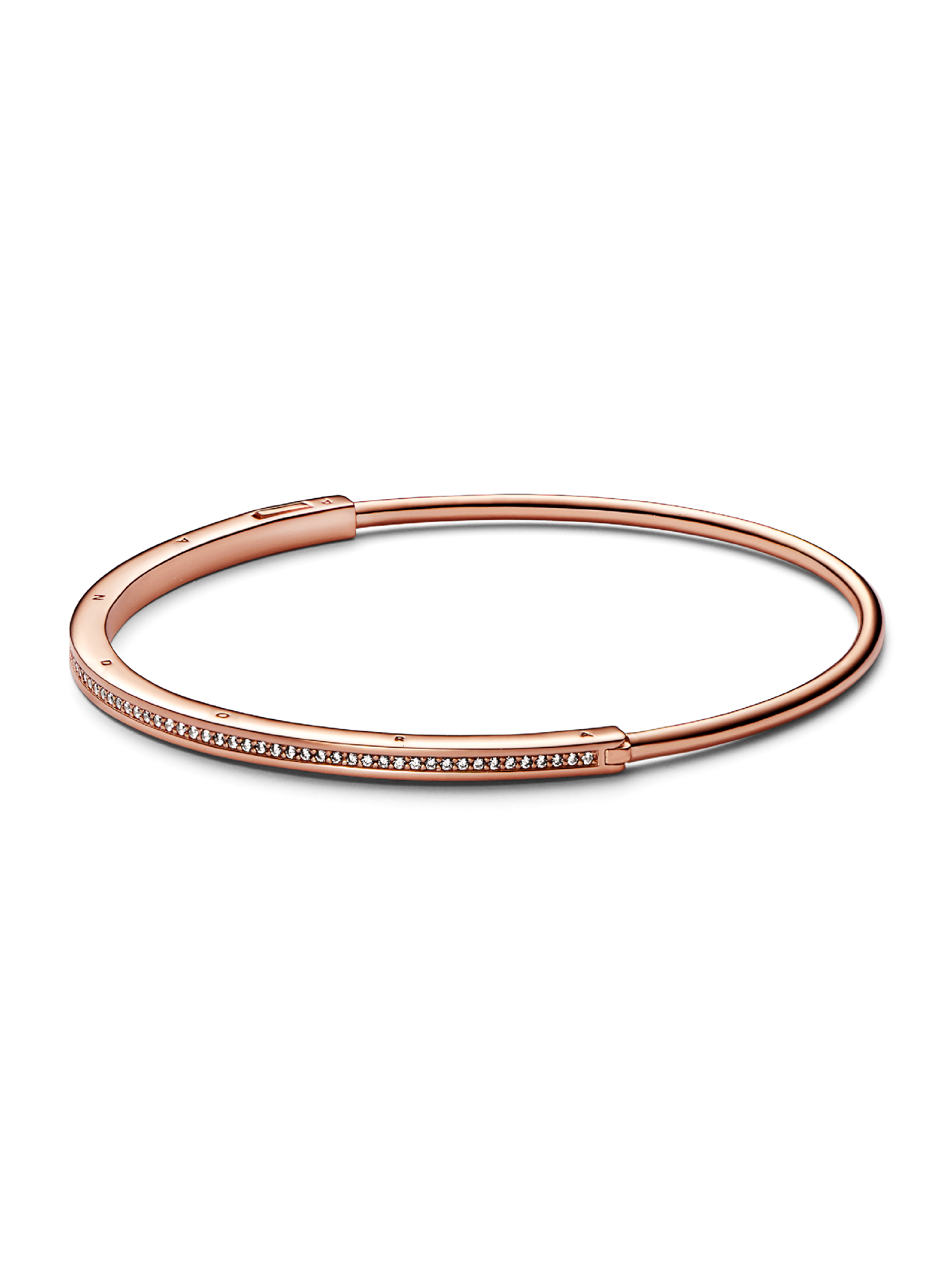 Elevate your outfit with the Pandora Signature I-D Pavé Bangle. Finished in 14k rose gold plating, this much-loved design features an architectural square-and-round profile with a channel of pavé for subtle sparkle. Stack with other Pandora Signature I-D bangles to create your own iconic look.