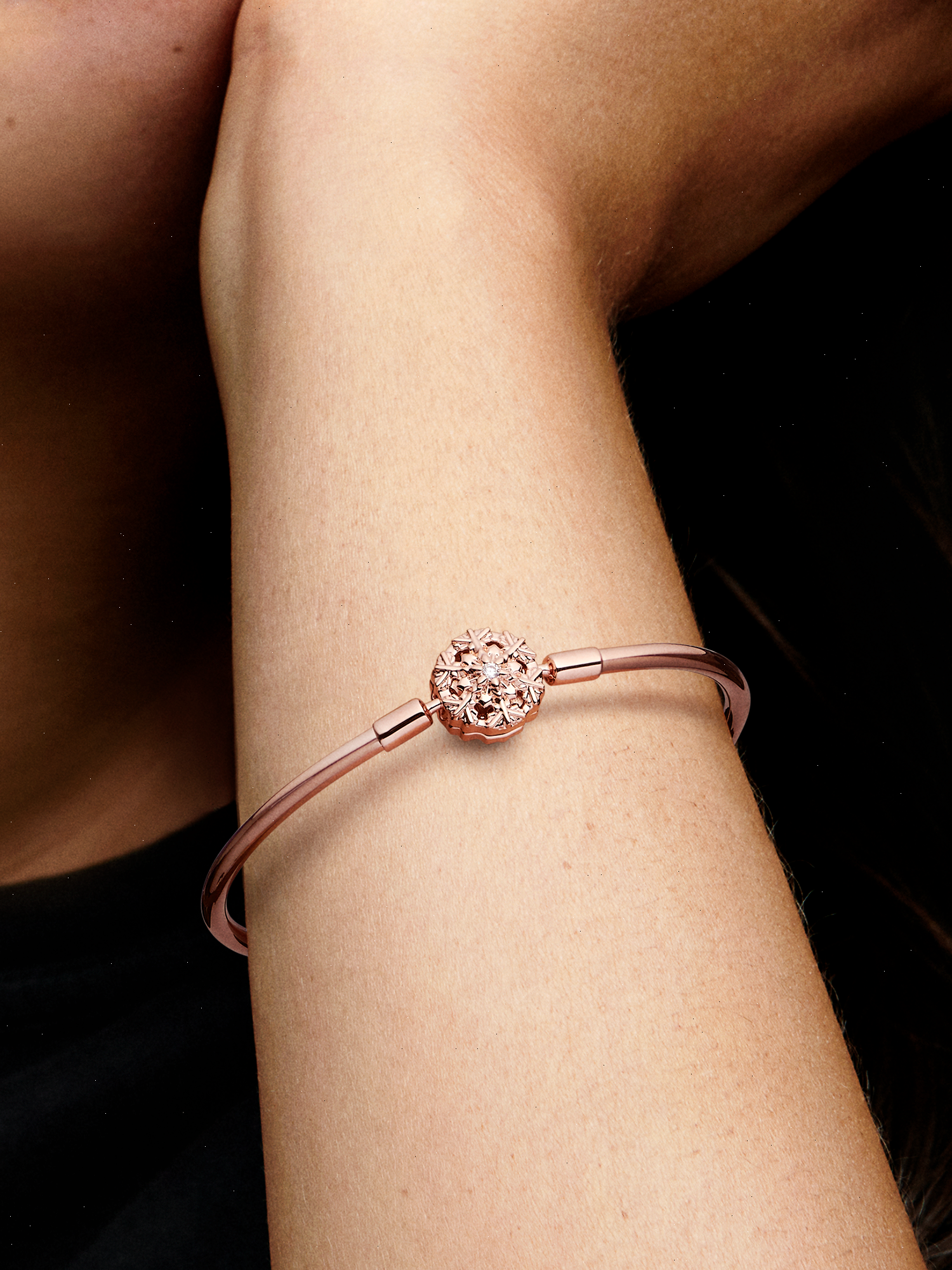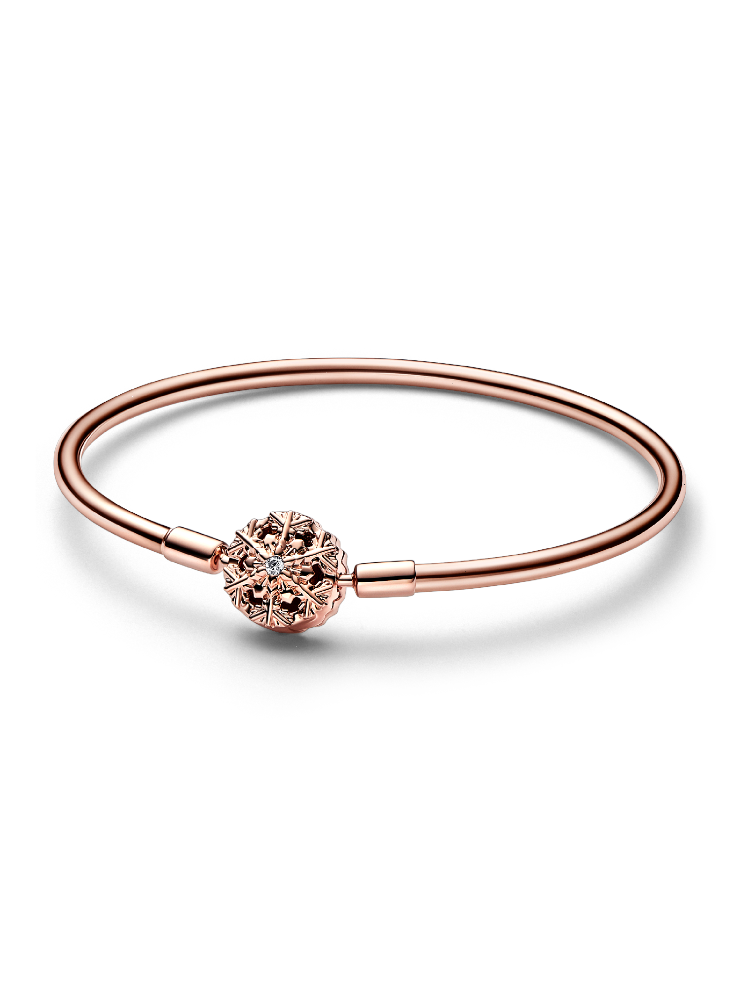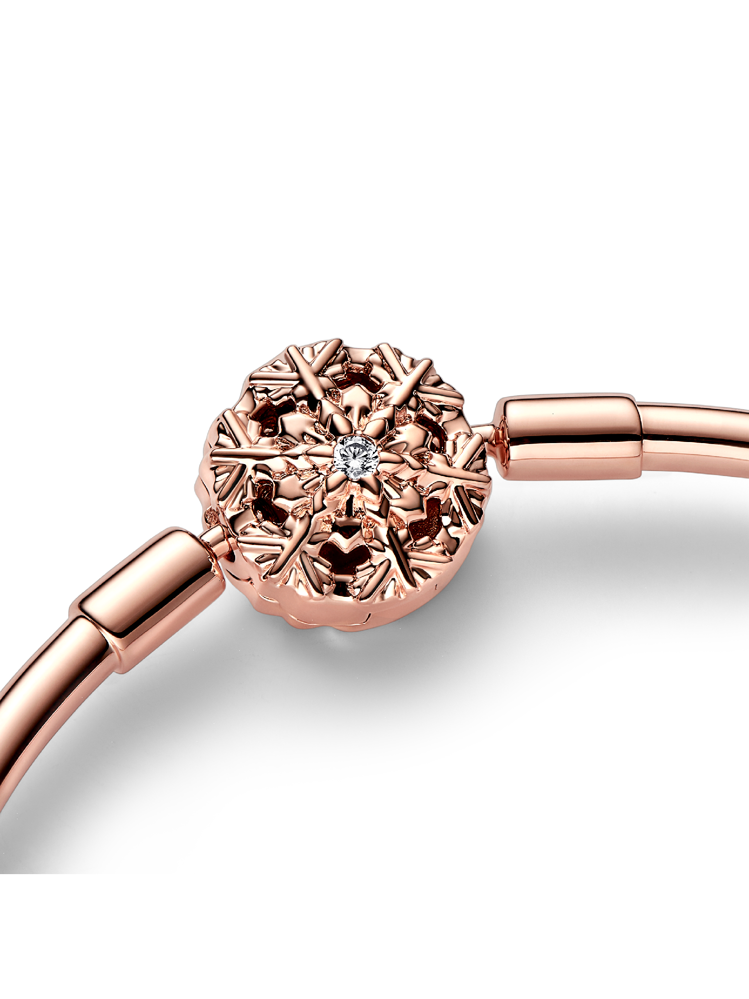 Catch a falling snowflake and wear it at the center of your story. This detailed 14k rose gold-plated bracelet features a special snowflake motif as its clasp, with intricate openwork details, creating a wintry effect. Small faceted and cut-out snowflake shapes reach out from the center of the snowflake, creating a magical winter look to bring a unique touch to your holiday styling.