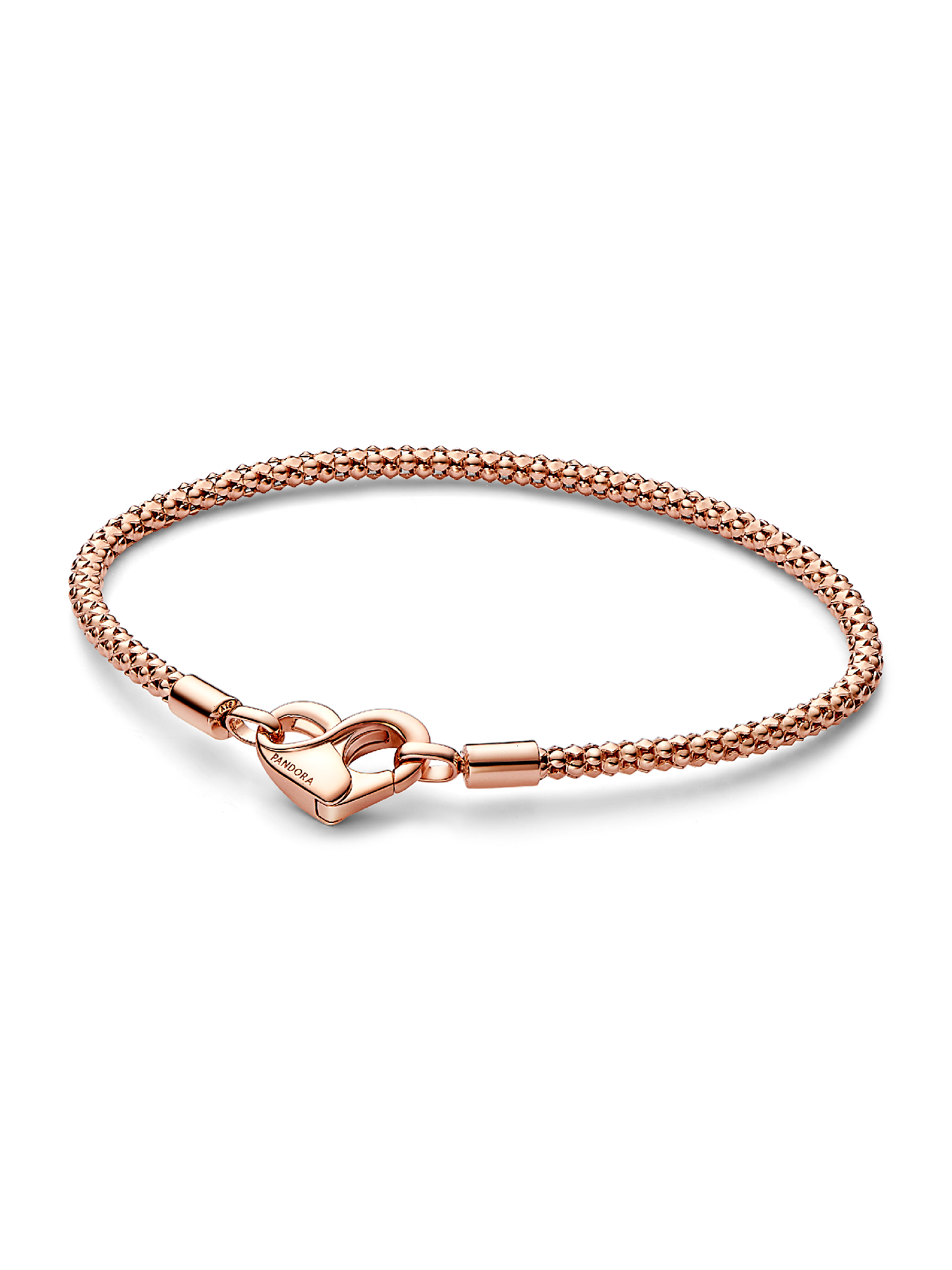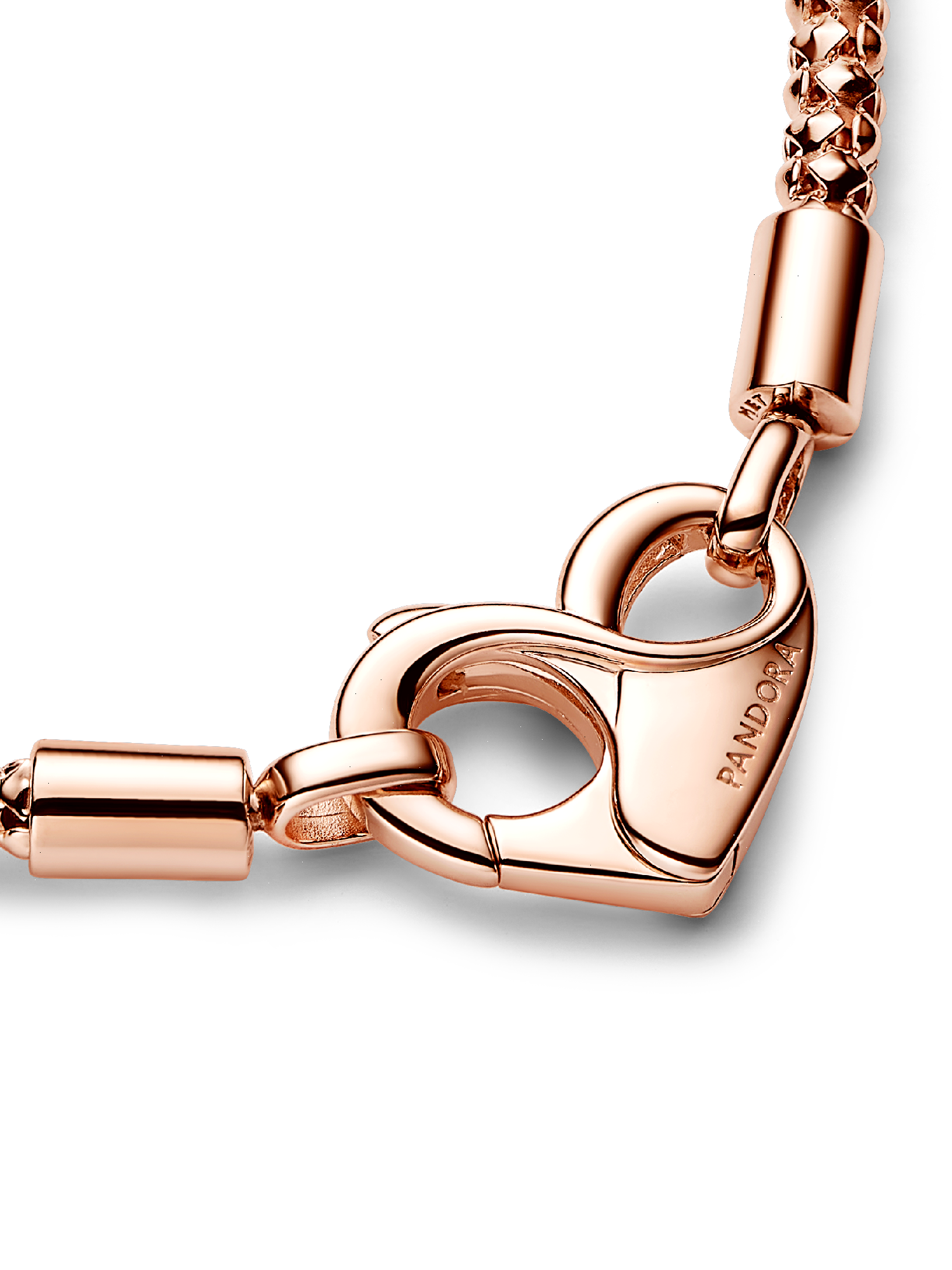 Update your collection with our new Pandora Moments Studded Chain Bracelet in a 14k rose gold-plated unique metal blend. This hand-finished bracelet features a flexible, textured chain and an infinity-detailed openable heart-shaped clasp with an interior infinity symbol. Please note this chain bracelet does not have threaders (raised charm dividers). A maximum of 14-18 charms or dangle charms can be styled on the bracelet. The clasp cannot be styled with charms. We recommend adding charms with silicone grips or safety chains to secure your styling.