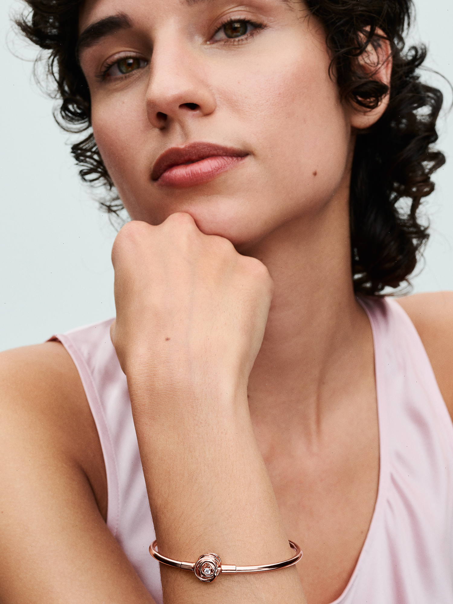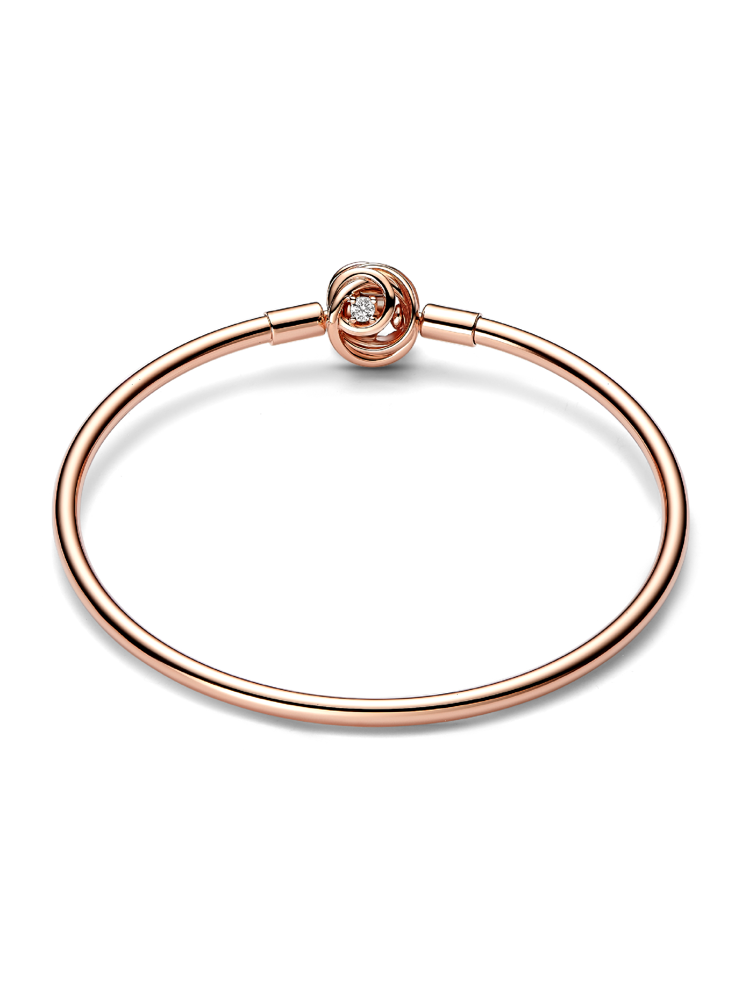 Celebrate the power of love with our Pandora Moments Encircled Clasp Bangle, a shimmering statement piece plated with 14k rose gold. Featuring an encircled clasp, the bangle is a symbol of infinite connections. The openwork design of the clasp with encircled lines on both sides is highlighted by a clear cubic zirconia and symbolically captures the essence of forever. Playfully versatile, you can style it with up to 14-18 charms, celebrating your life's most important moments. This style features no threaders, just smooth end caps to frame your favorite charms.