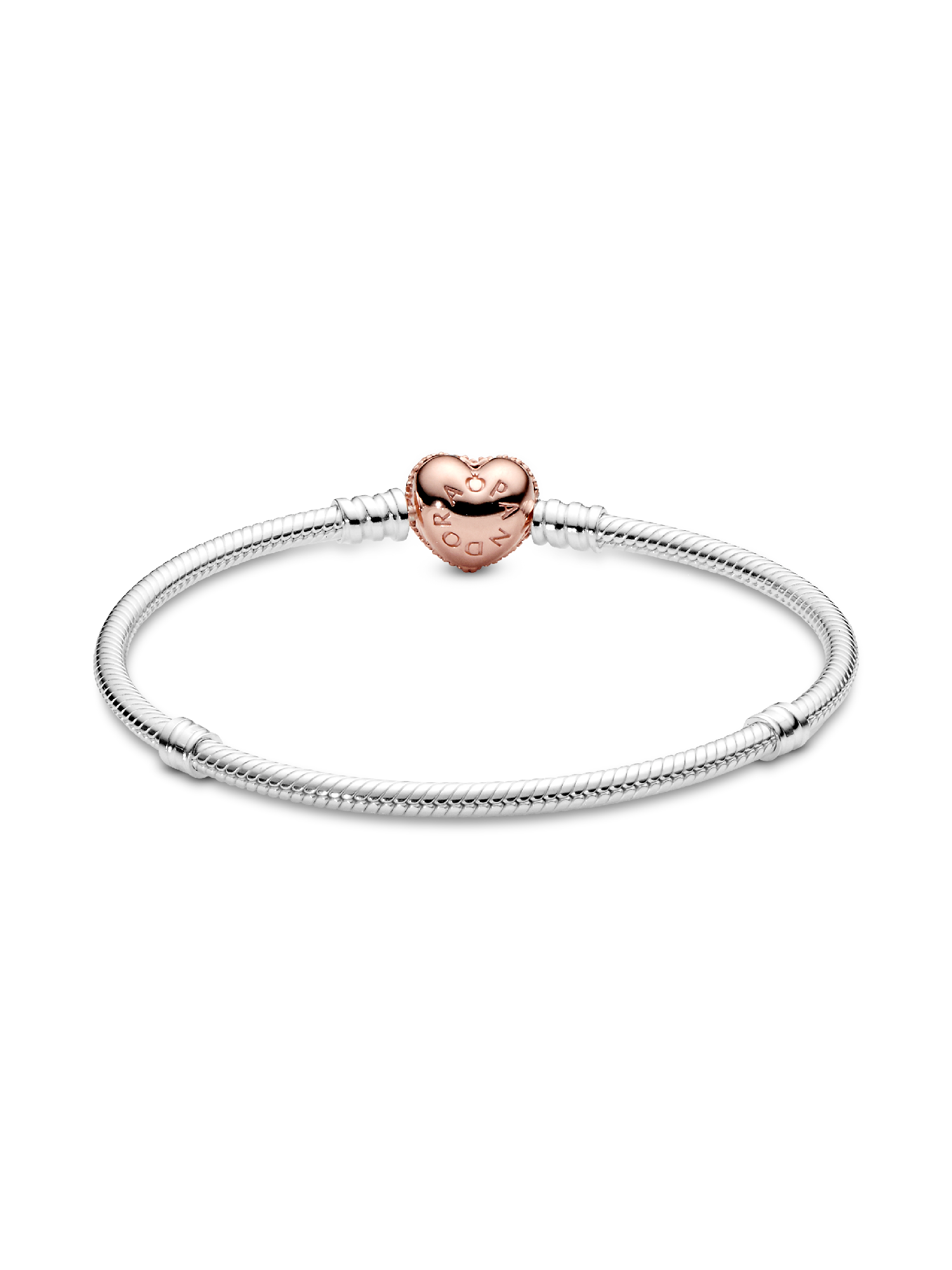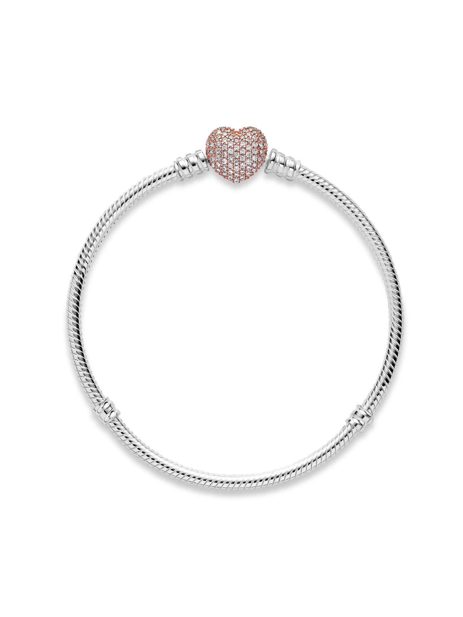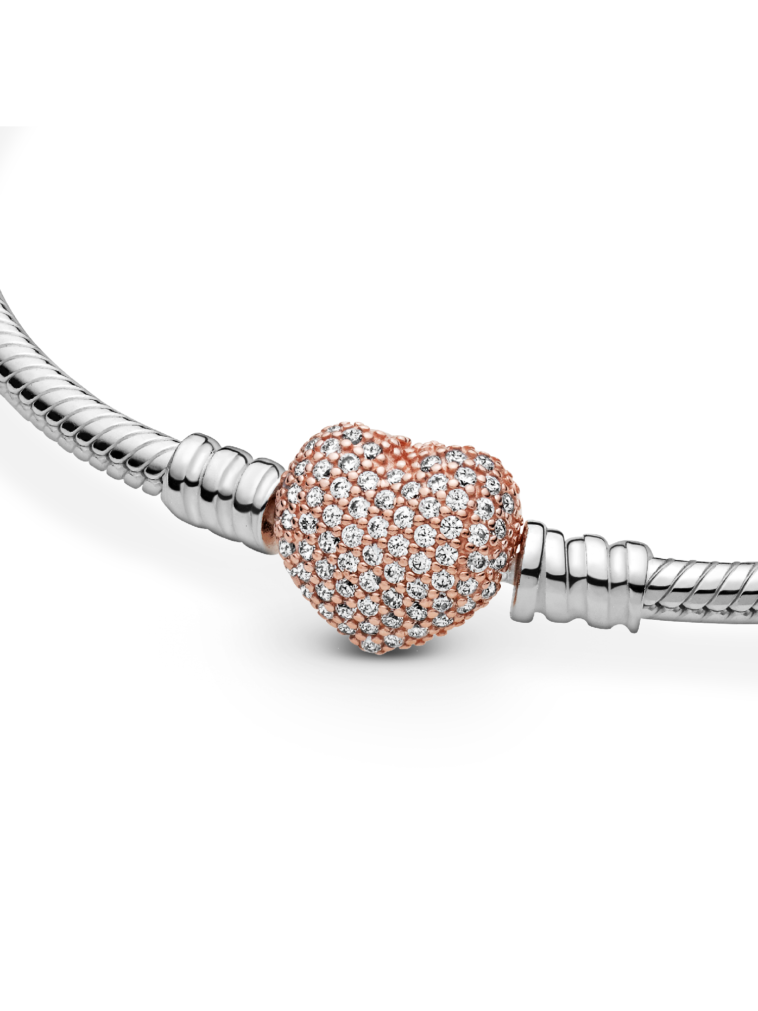 Put some love in your look with our classic Pandora Moments Pavé Heart Clasp Snake Chain Bracelet that's been given a romantic update with a heart-shaped, 14k rose gold-plated clasp. The pretty heart is detailed with cubic zirconia for a sparkling finish. The sterling silver style transitions effortlessly from day to night – and we think it looks equally elegant worn with or without charms, solo or stacked. Wear it to show more of the things you love.