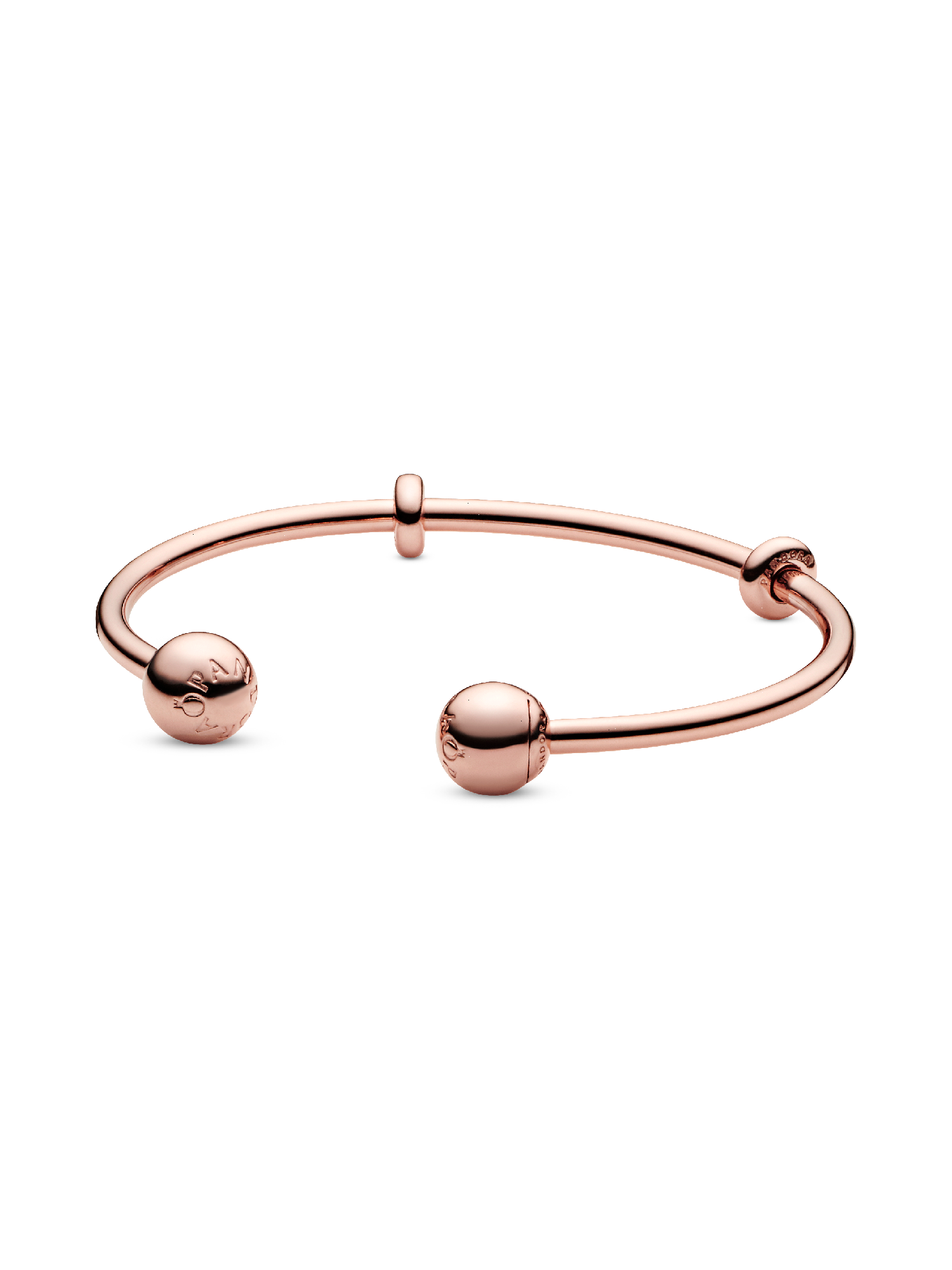 A sleek addition to your jewellery box, our 14k rose gold-plated Pandora Moments Open Bangle is minimally detailed with silicone stoppers that double as adornments. The polished style is plated with 14k rose gold for a warm finish. The logo-embossed end caps are easily removed to add charms — and are interchangeable to suit your mood.