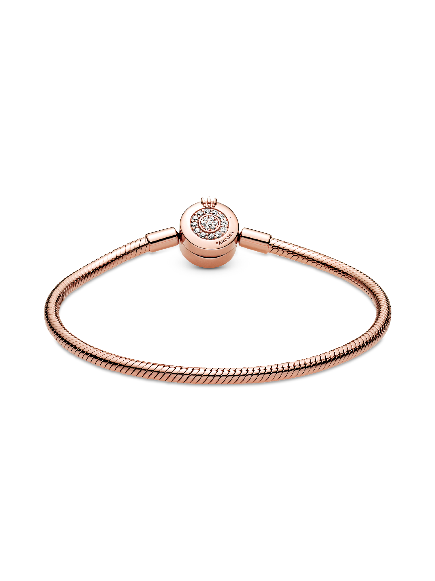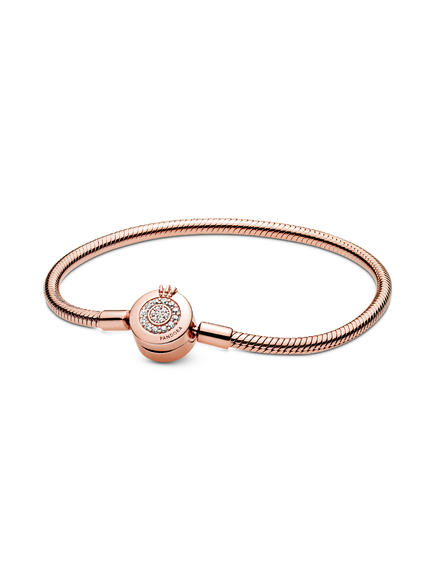 Bring some sparkle to every moment with the Pandora Moments Sparkling Crown O Snake Chain Bracelet. Hand-finished in 14k rose gold plating, the bracelet's clasp features the iconic Pandora crown O monogram and bead-set clear cubic zirconia pavé, while the snake chain brings a chic and modern touch to your wrist. Stack it with other bracelets and load it up with favorite charms for a piece you'll reach for over and over.