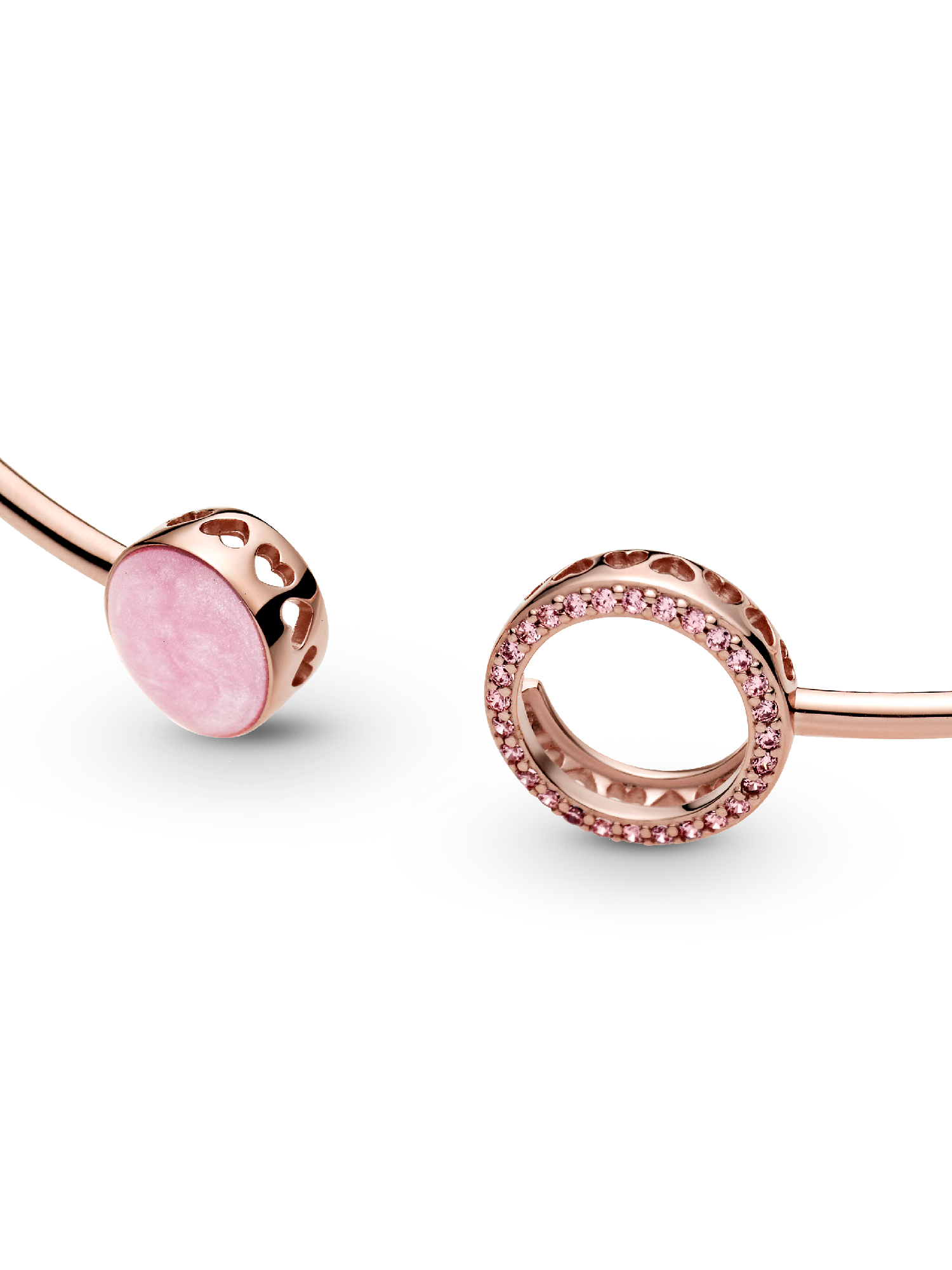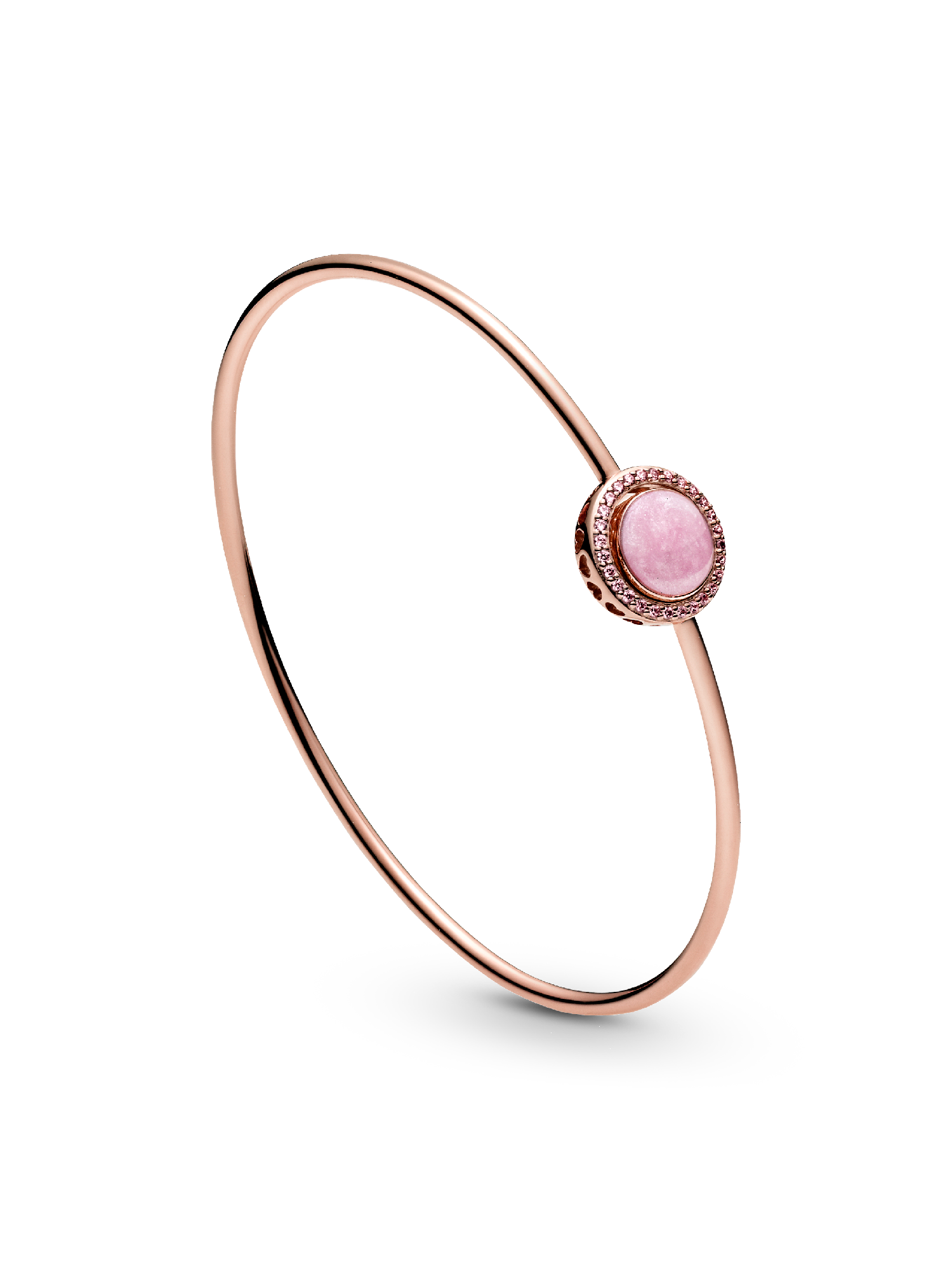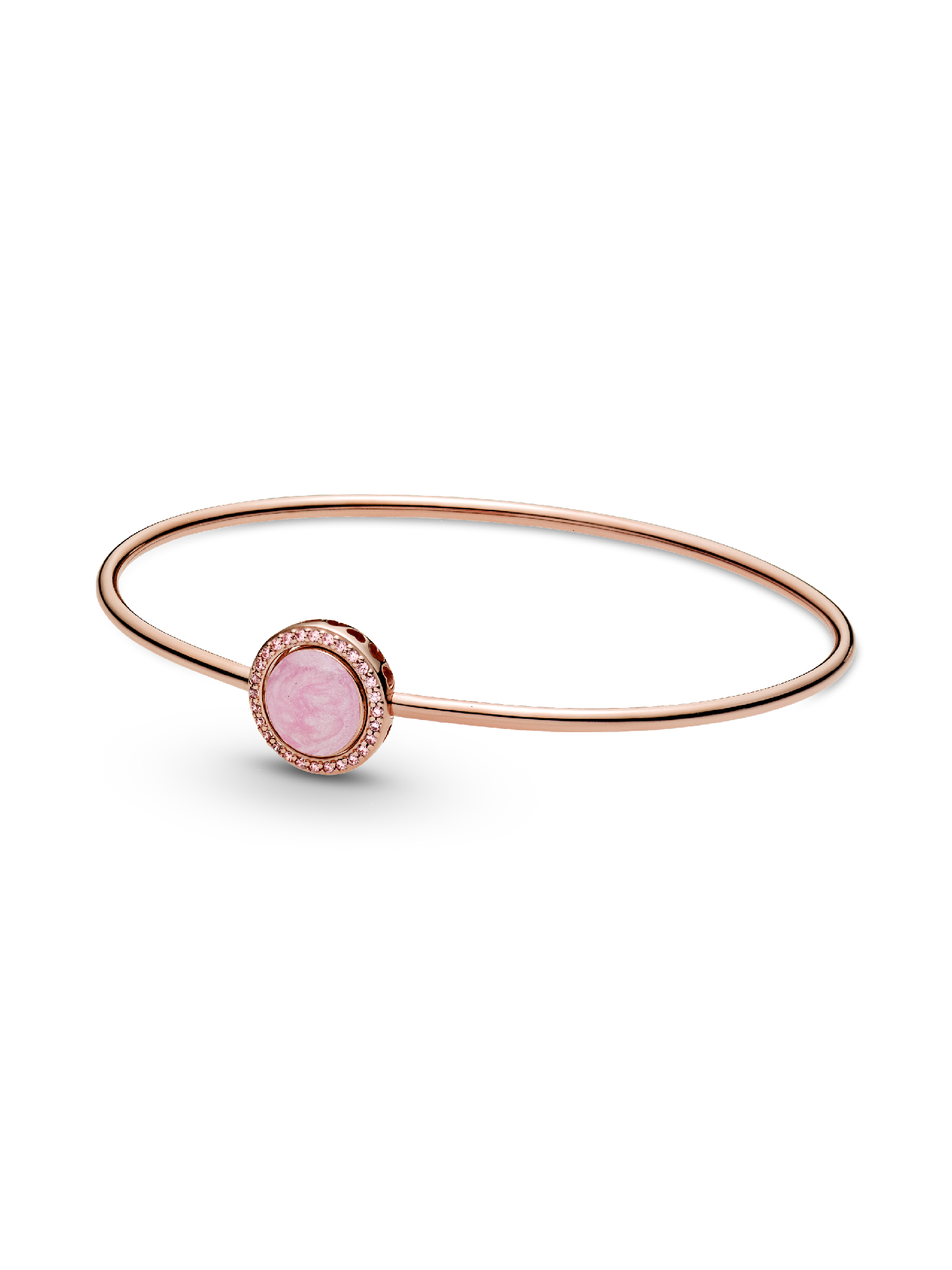 Show off your individual style with the Pink Swirl Bangle. This openable bangle is hand-finished in 14k rose gold-plated unique metal blend. Inspired by the imperfection of natural stones, the centerpiece includes hand-applied pearlescent pink swirl enamel made to mimic rose quartz, meaning each bangle is unique. Wear this piece with the sparkling open circle with cut-out hearts and enamel centerpiece positioned next to each other or gently fasten them together. Team with more pink jewelry for a bold finish.