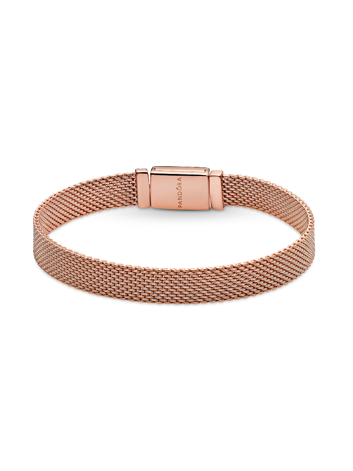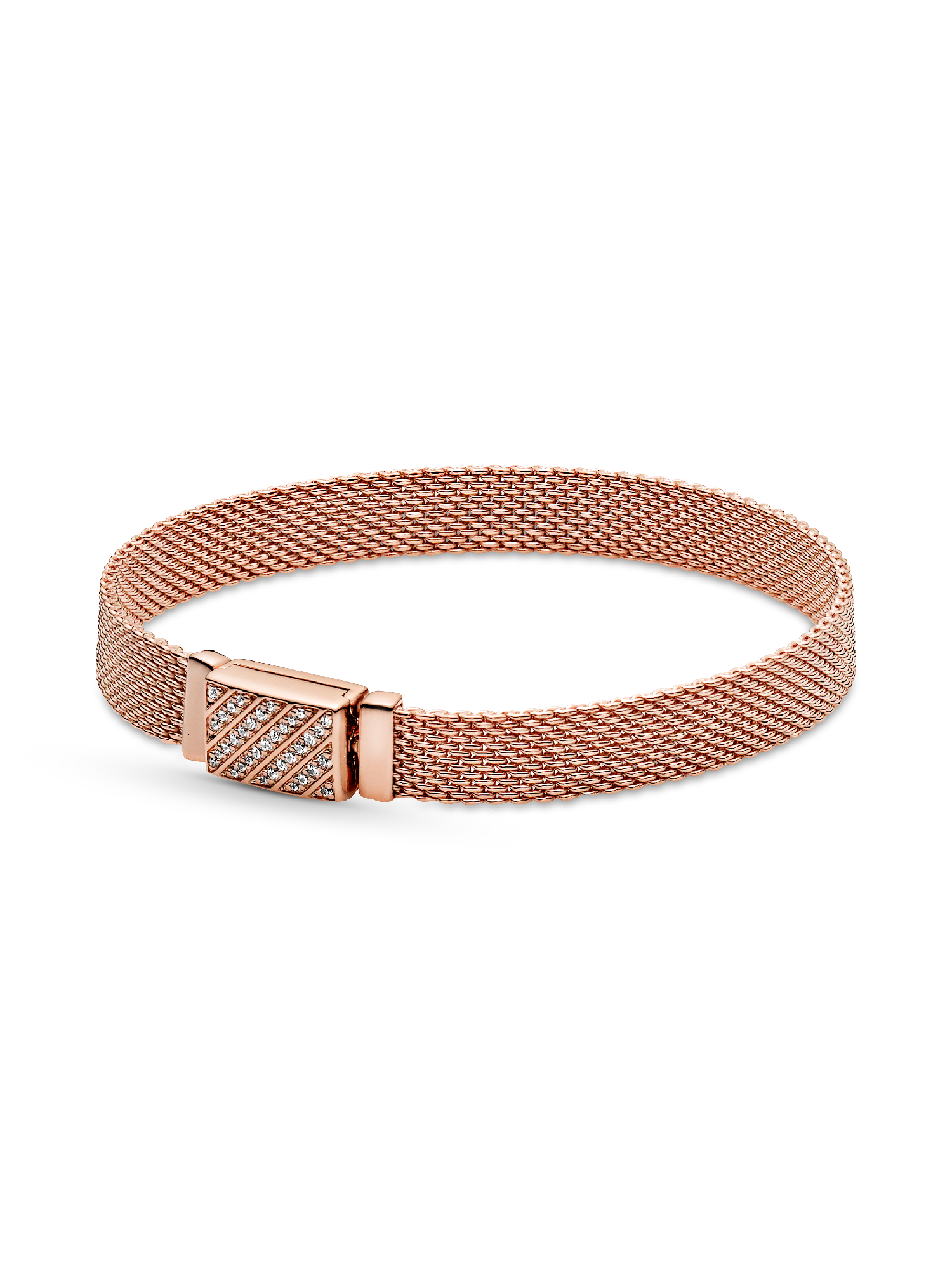 Add some sparkle to your look with the Pandora Reflexions Long Clasp Pavé Bracelet. Featuring an elongated clasp shape with diagonal rows of clear cubic zirconia pavé on the front and a polished back with Pandora logo, this 14k rose gold-plated fine flat mesh bracelet is hand-finished. Designed in the modern minimalist aesthetic of Pandora Reflexions, this warm-toned bracelet is a sleek, stunning and sophisticated addition to any look.
