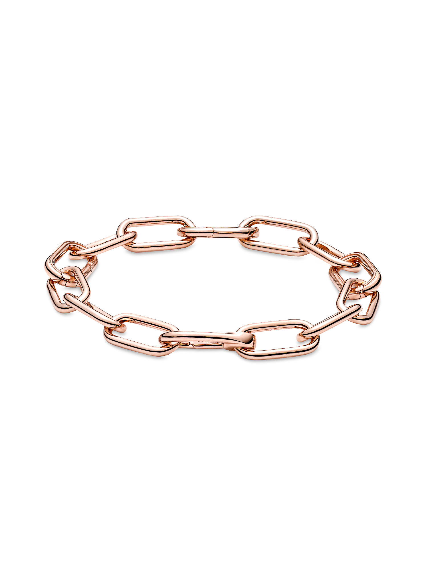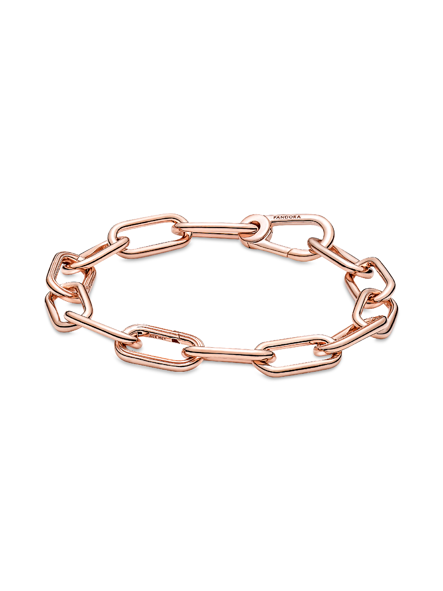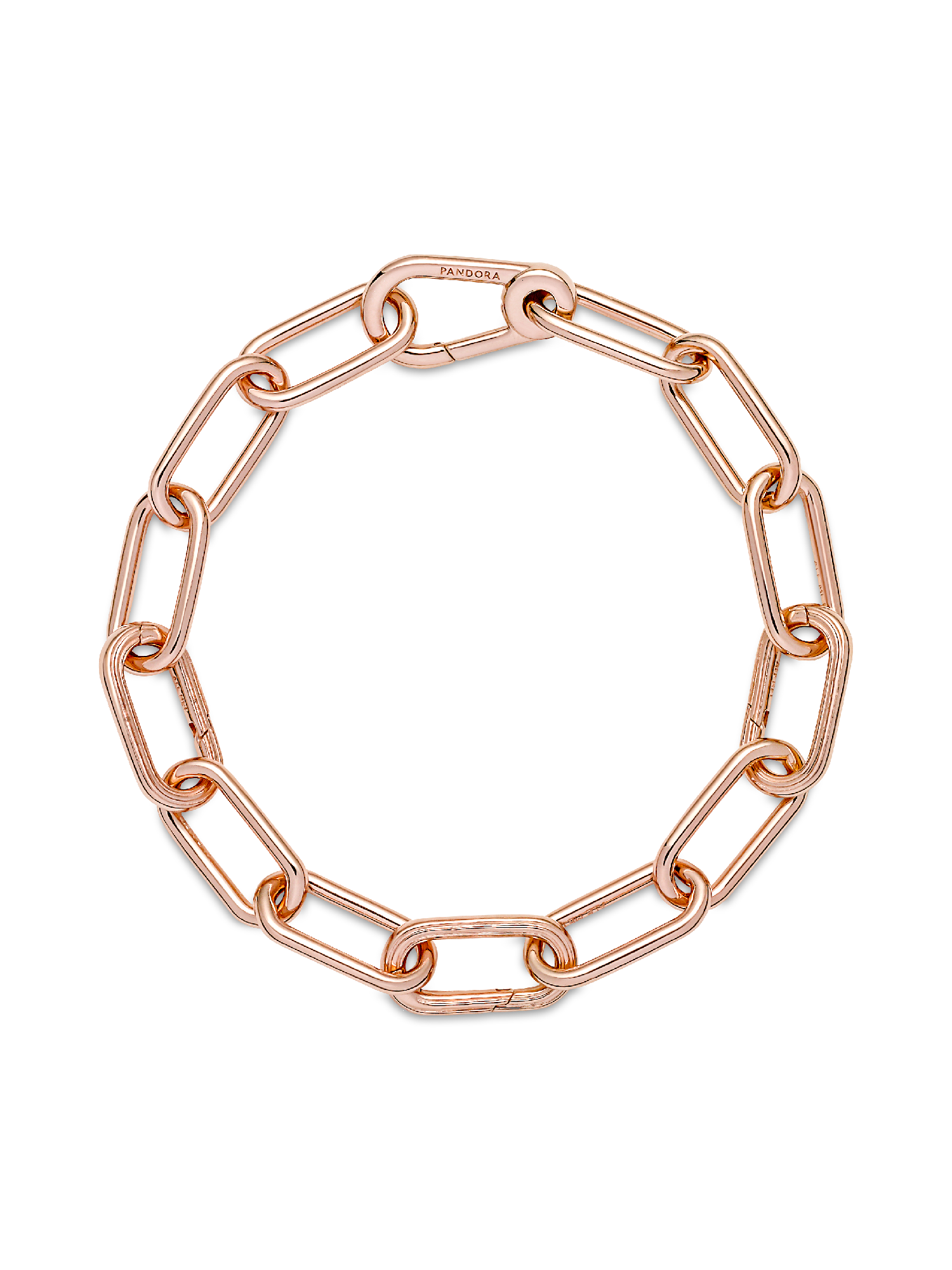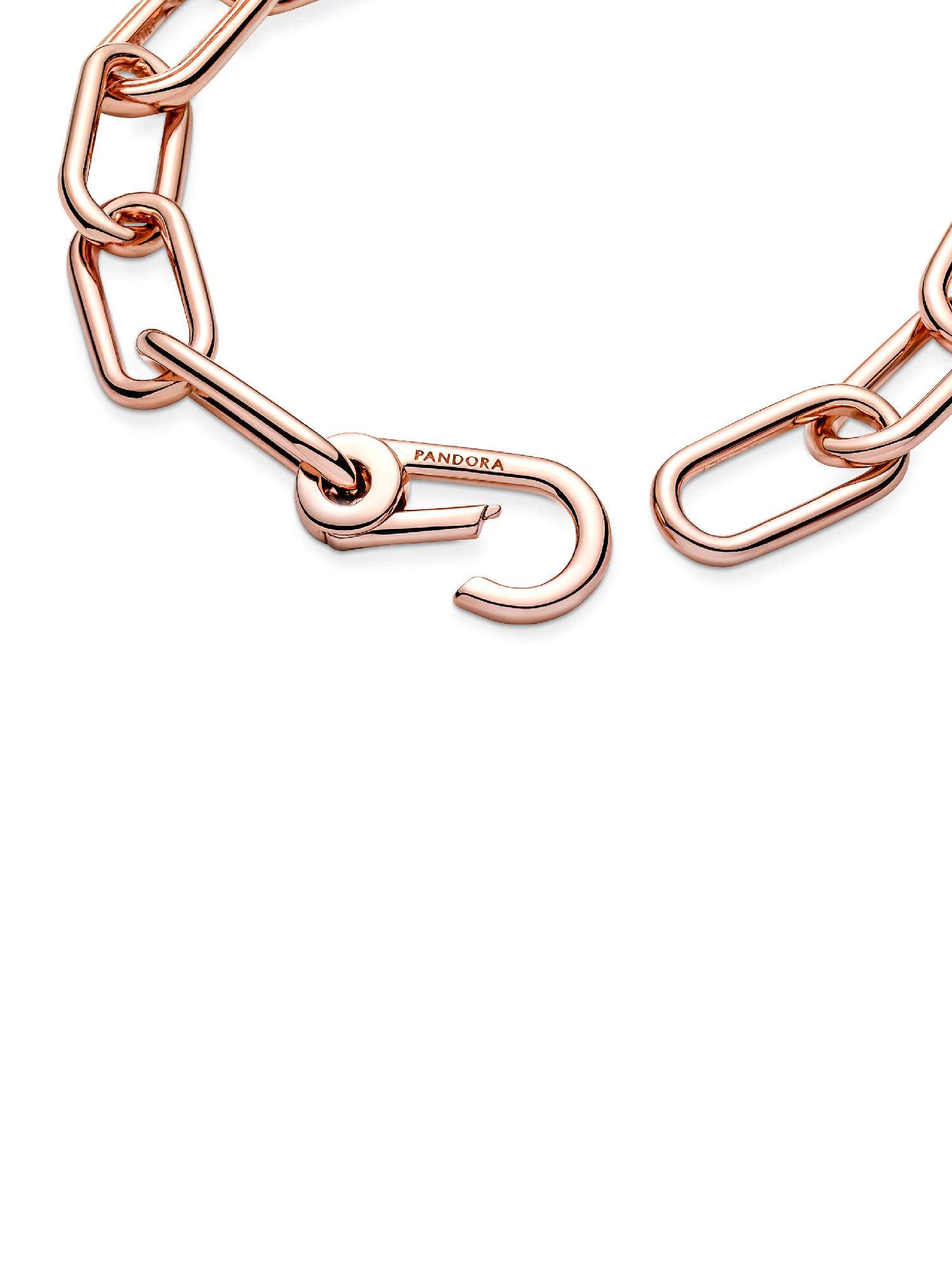 Wear your mantra on your wrist. Our 14k rose gold-plated Pandora ME Medium-Link Chain Bracelet holds endless styling possibilities. The bracelet features three openable links, designed with a grooved surface to set them apart, styling links and a carabiner clasp closure. First customise your link chain: one set of interlocking styling links can be swapped out between each openable link for four small interlocking links, a styling double link or one styling link – keep the original length or adjust it to suit you. Once you’ve curated your link chains, remix your look with up to two meaningful medallion charms or up to eight mini dangle charms on each openable link, or with one medallion charm per styling link to show the world what you're about. Please note this item is only compatible with Pandora ME jewelry and will not fit our other collections.Discover how to mix and re-mix your Pandora ME look here.