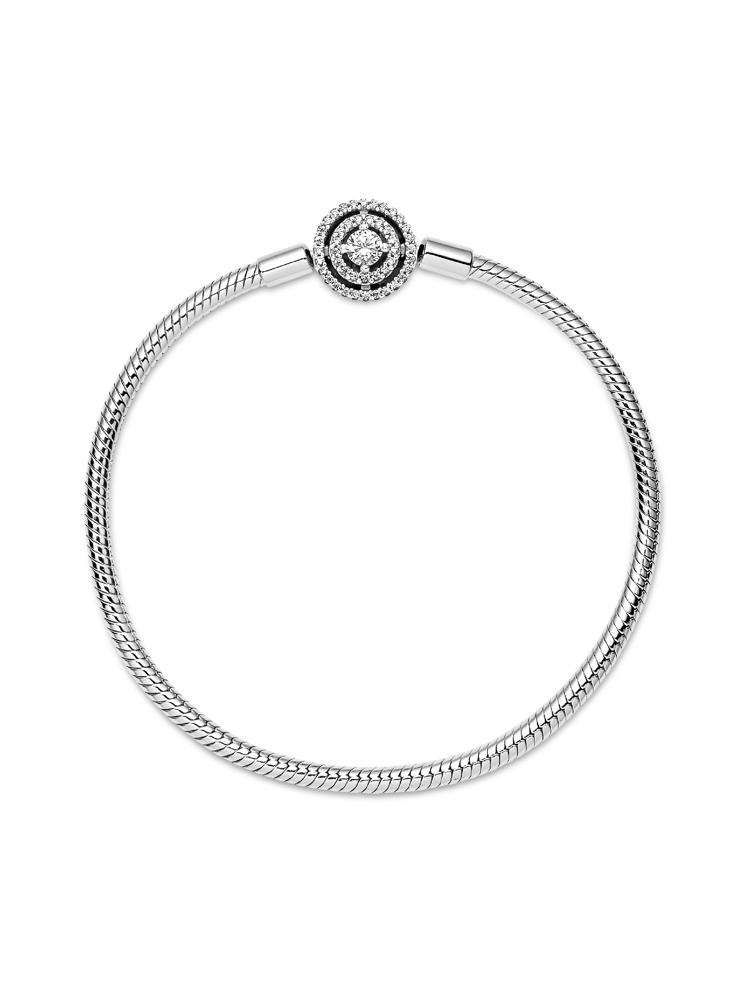 Bring timeless charm to your look with the Pandora Moments Halo Snake Chain Bracelet. Hand-finished in sterling silver, the bracelet's clasp features a large sparkling clear cubic zirconia center stone surrounded by a double halo set with small stones, designed to create a spacious, free-floating look. Fill the bracelet with charms and clips, wear it on its own for a simply elegant look, or stack it with contrasting bracelets for a fun play on textures.