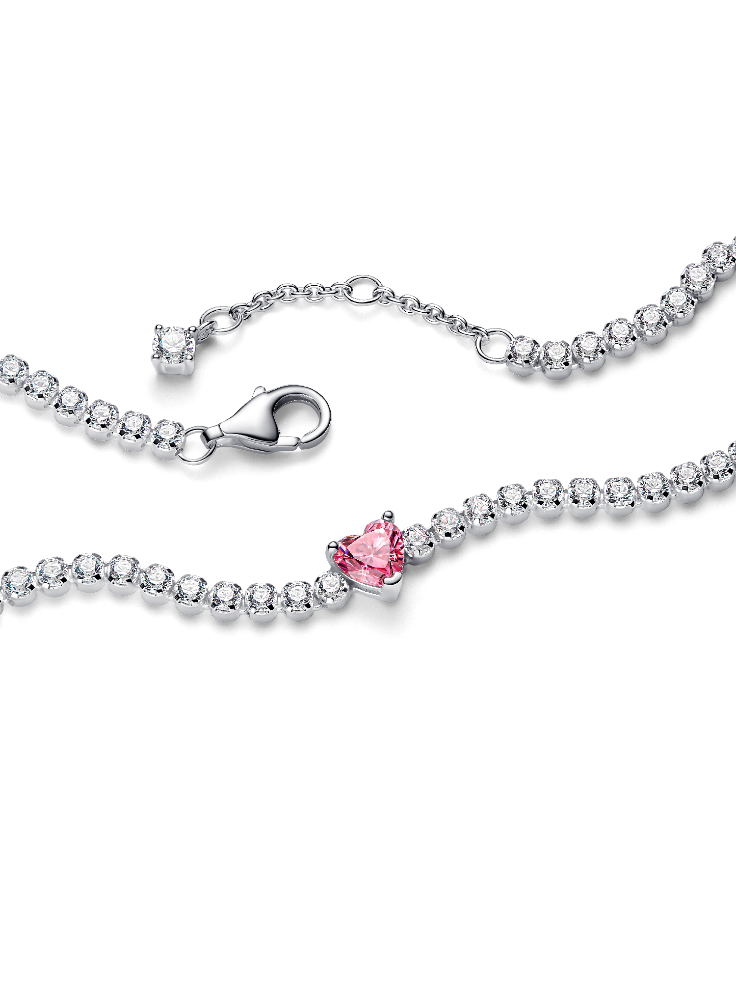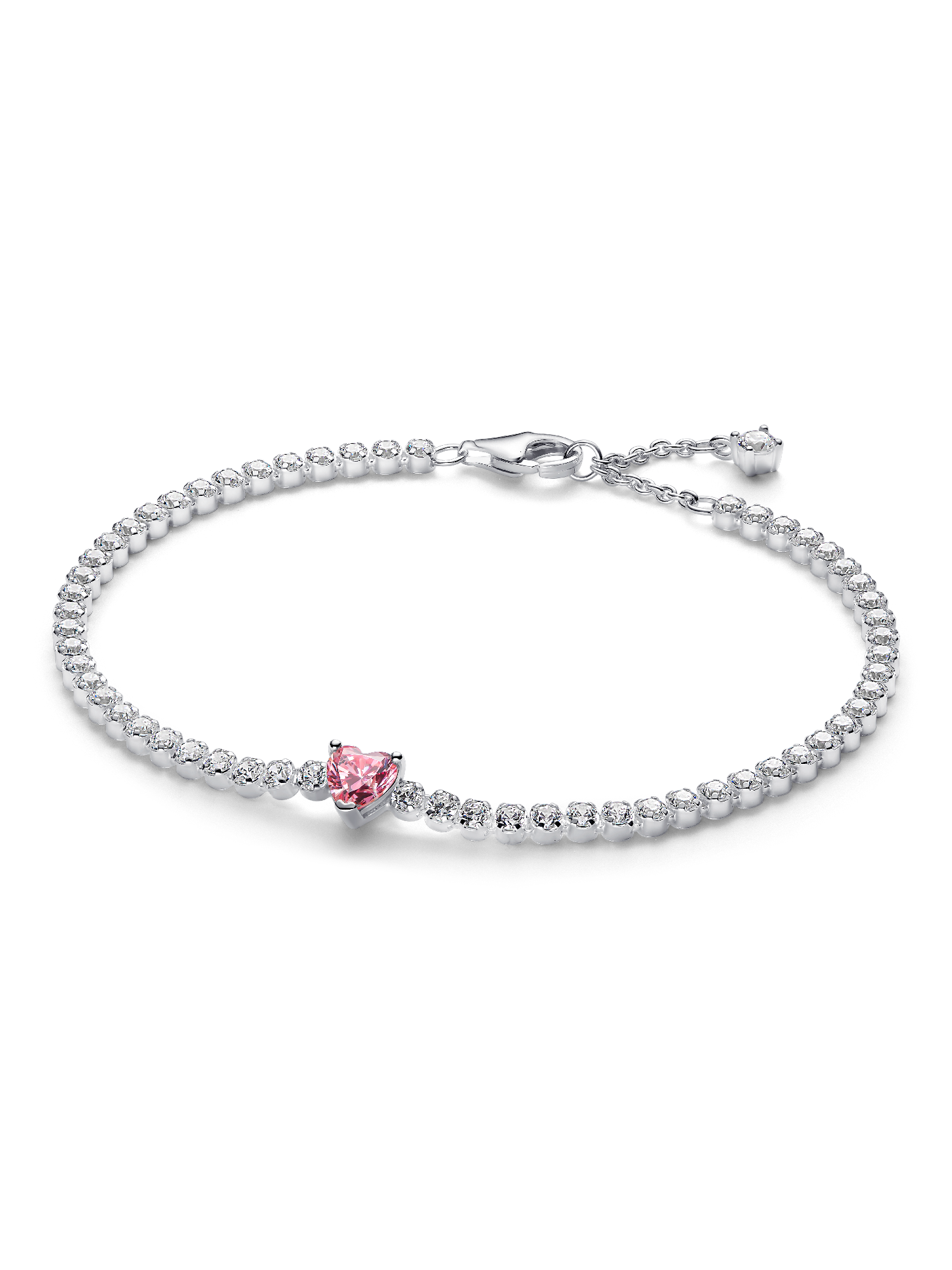 A bold twist on the tennis bracelet, this cubic zirconia bracelet is defined by sparkle. A large pink heart-shaped stone punctuates a glittering row of clear cubic zirconia pavé, with another small stone detail at the end of the chain.