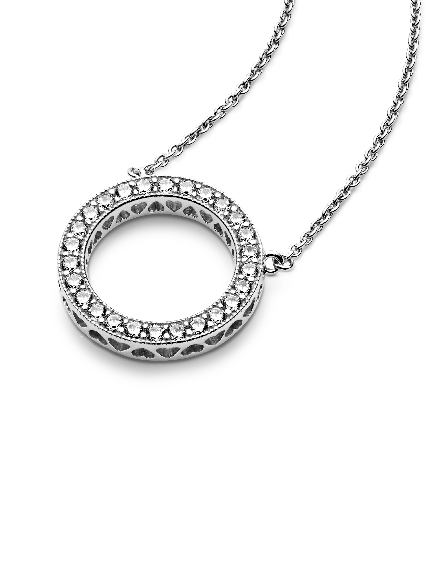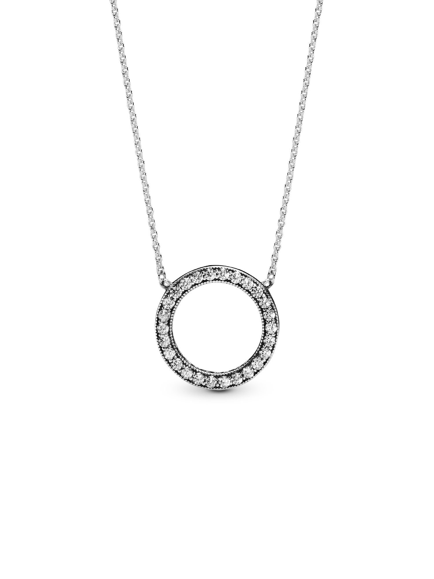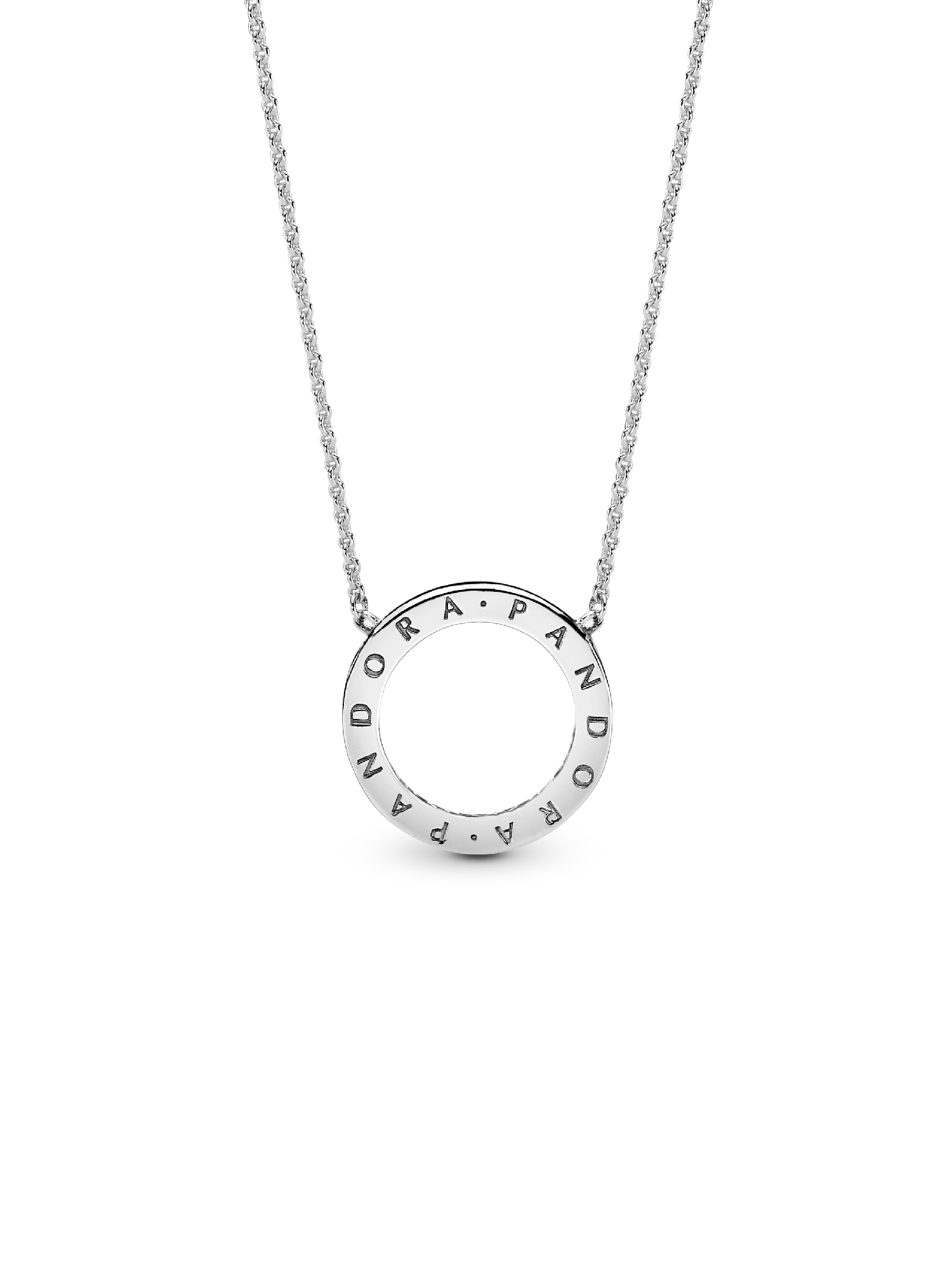 Bring your outfit full circle with this sparkling necklace crafted in sterling silver. The reversible pendant is framed with shimmering stones on one side, and embossed with the Pandora logo on the reverse – enabling you to create two different looks. For extra versatility, the delicate chain is adjustable to three different lengths. Pair this circle necklace with the matching Circle of Sparkle Earrings for maximum glamor.