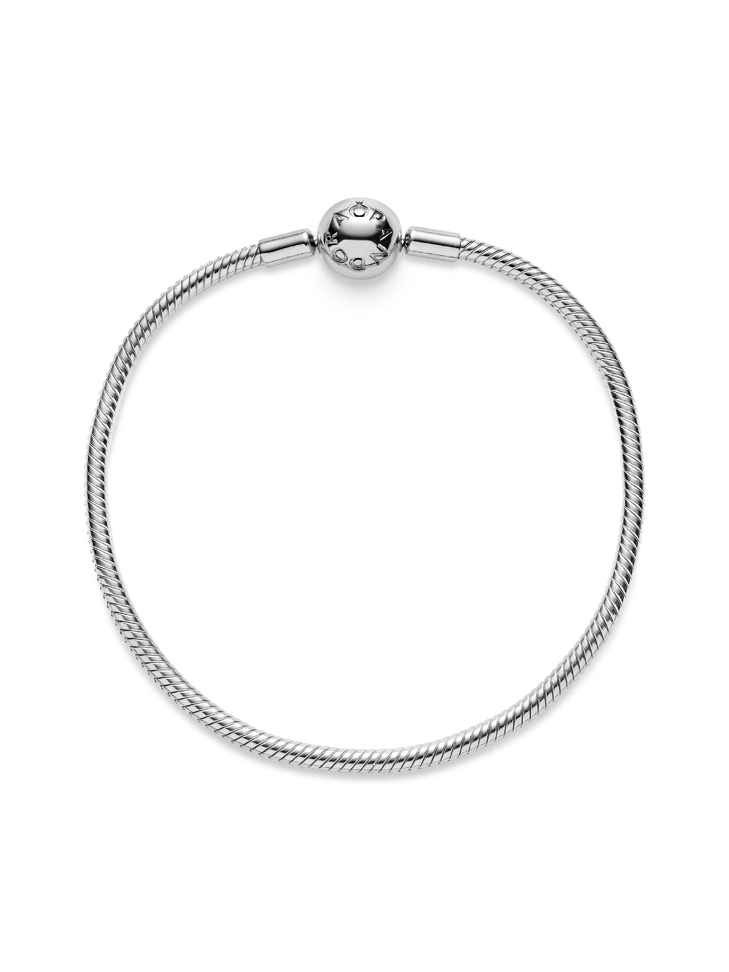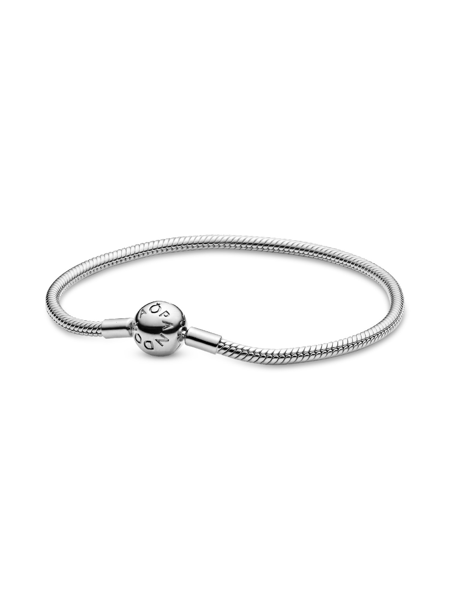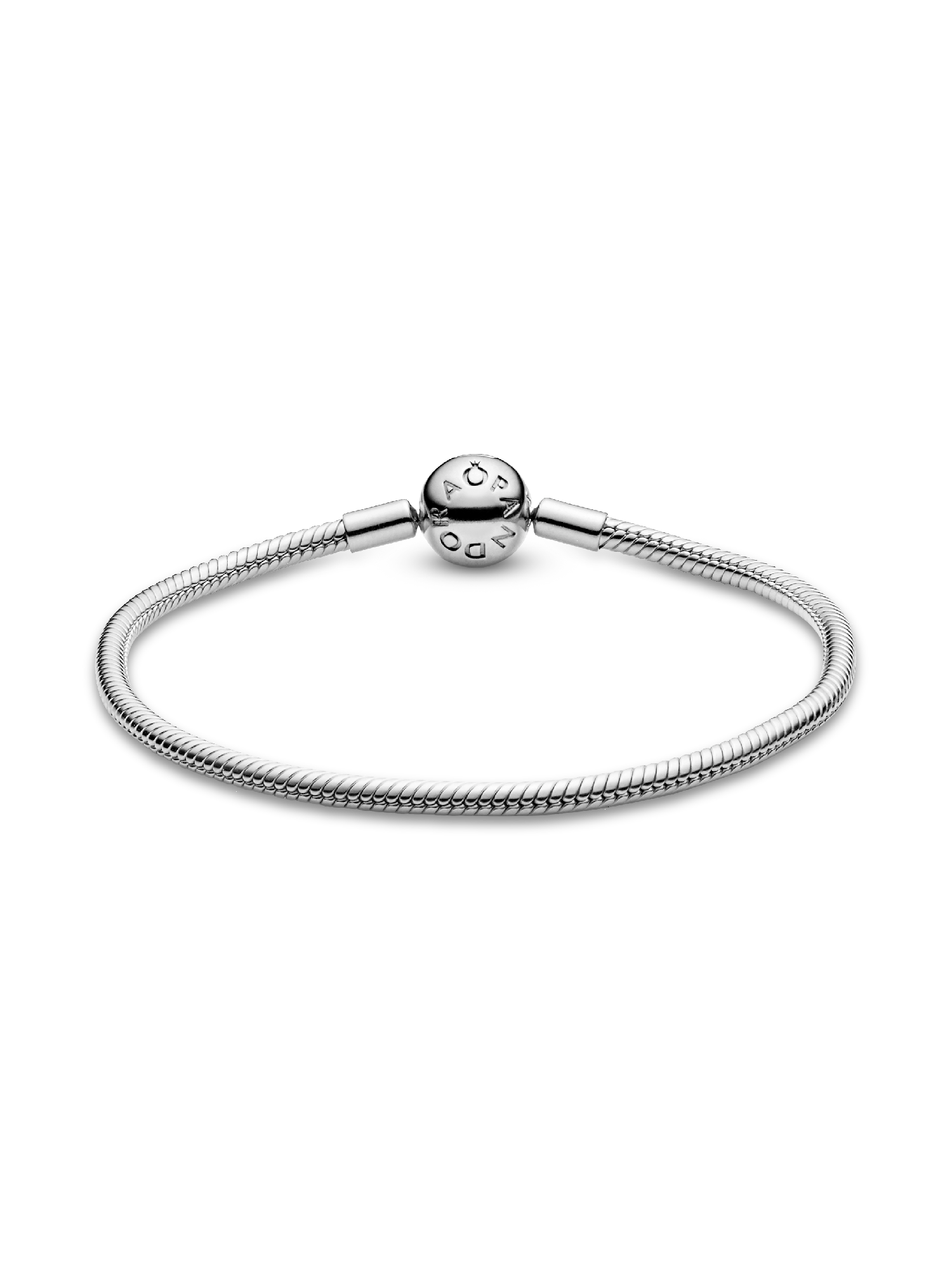 Start your very own Pandora story with this sleek snake chain bracelet in polished sterling silver. The perfect canvas for your creativity, this hand-finished bracelet can be styled in countless ways. Fill it with your desired charms and clips, wear it on its own for a simple, understated look, or stack it with contrasting bracelets for a fun play on textures. Only silicone-lined safety chain clips will fit this Moments bracelet.