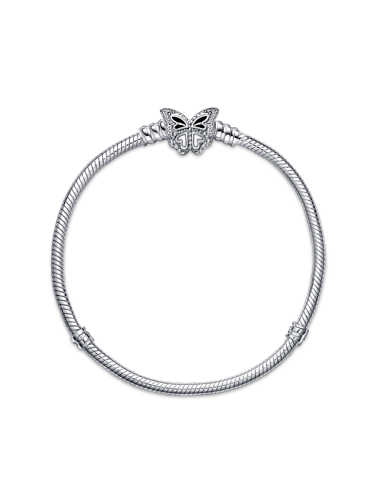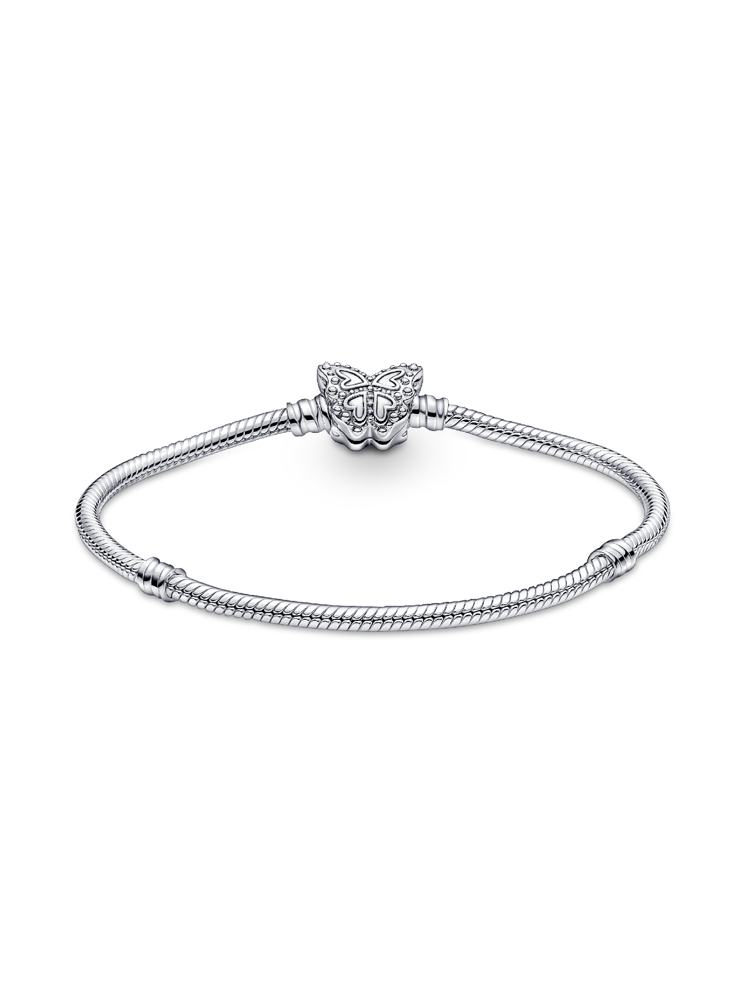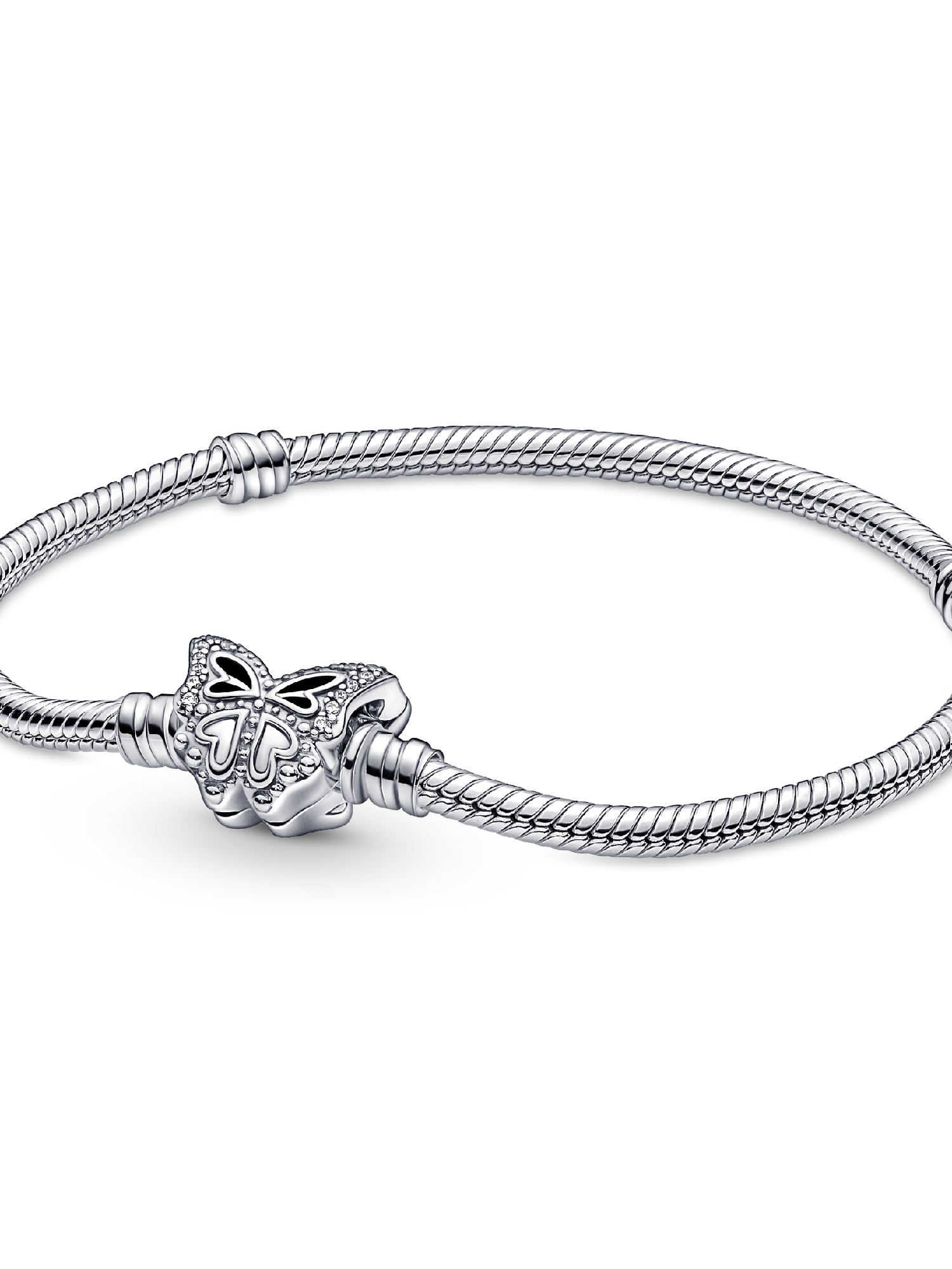 Tell your spring story and be inspired by the season of transformation with our sterling silver Pandora Moments Butterfly Clasp Snake Chain Bracelet. Cut-out and raised heart details and sparkling bead-set round brilliant-cut clear cubic zirconia give depth and dimension to the butterfly's wings. Style up to 18 charms on the bracelet and carry spring moments with you wherever you go. Pair it with other sterling silver pieces, like our Blue Butterfly Hoop earrings.