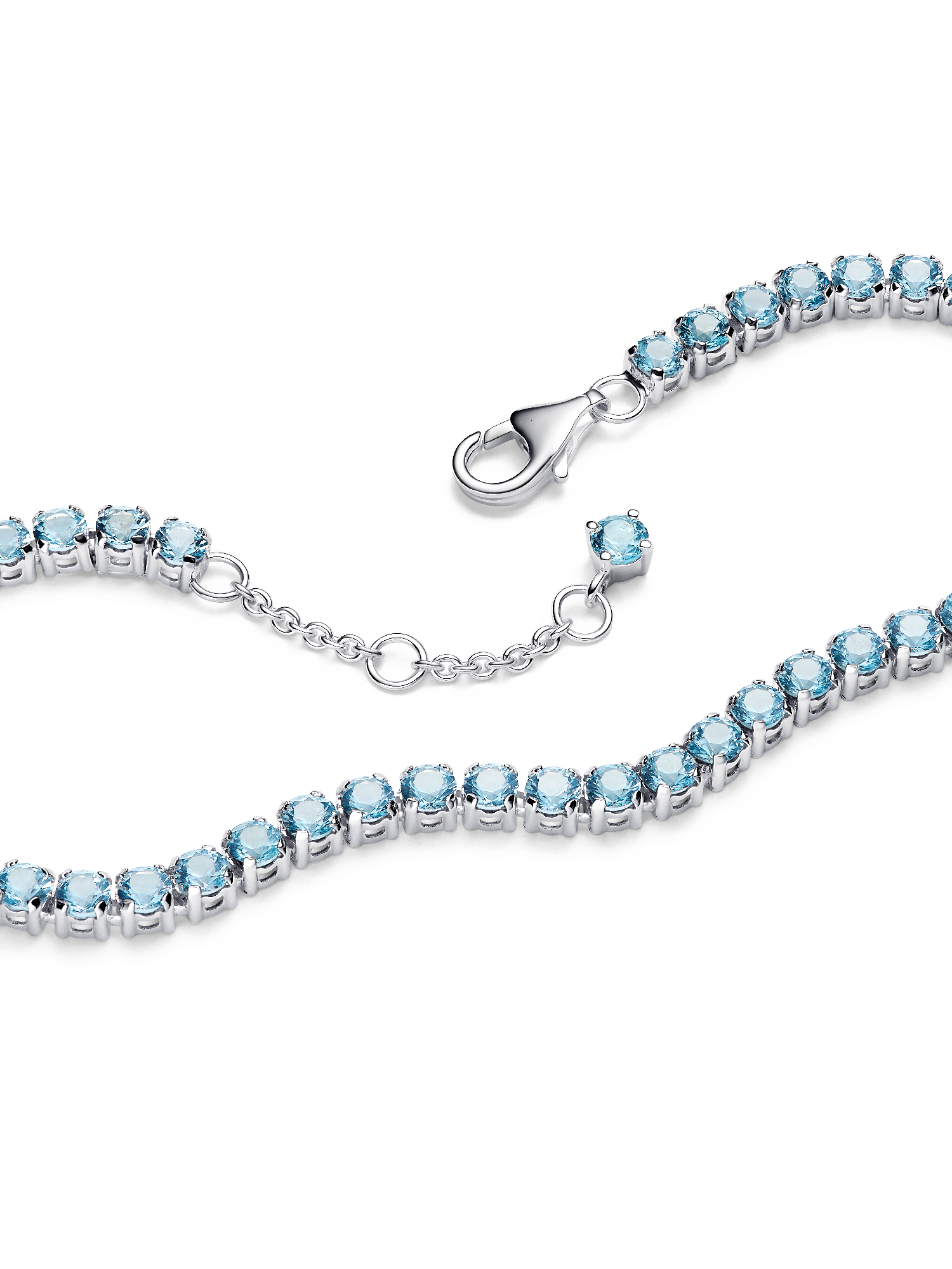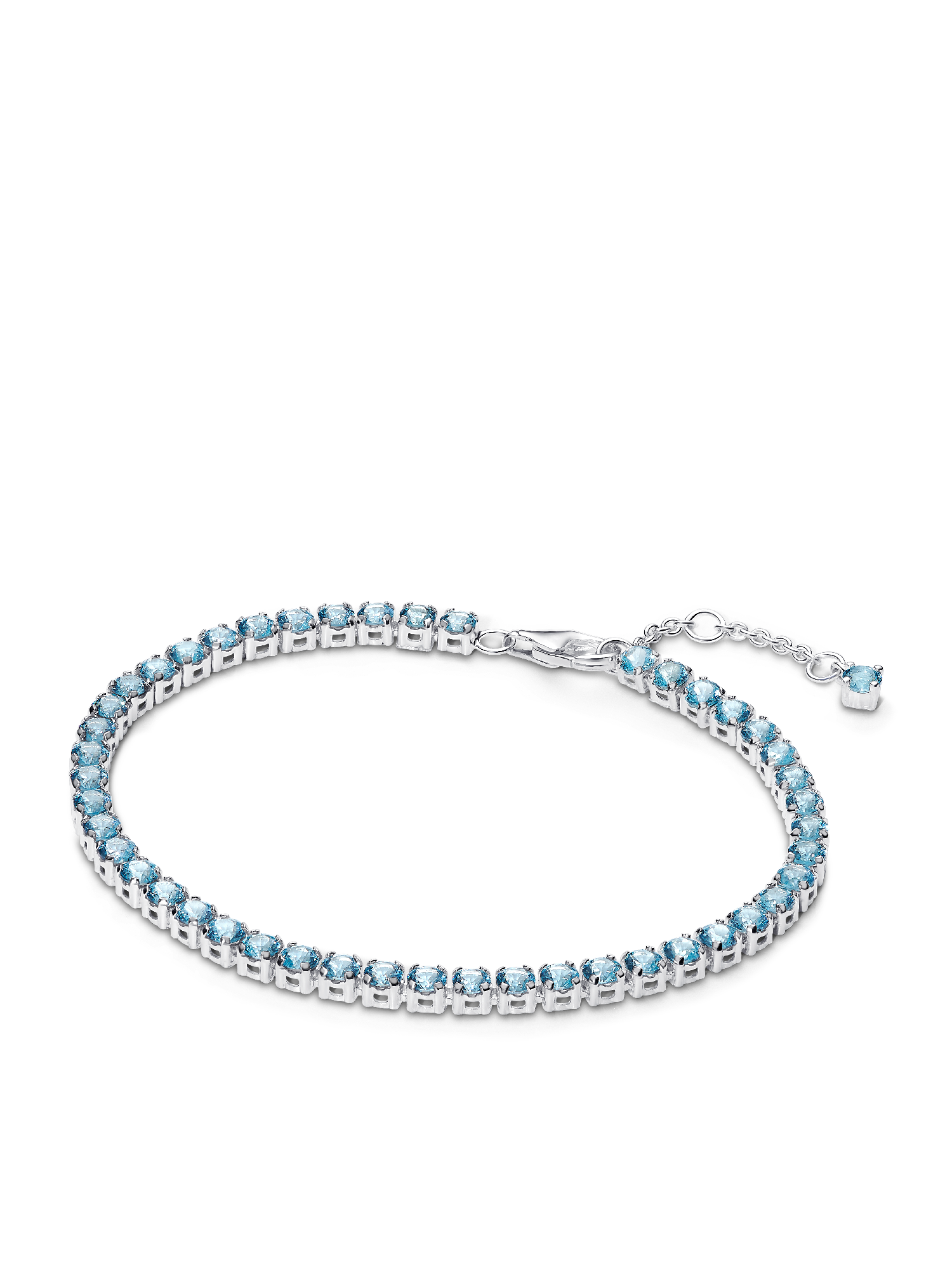 Make a bold statement with this stunning tennis bracelet, showcasing a row of round stones and a smaller stone dangling by the clasp, capturing the essence of modern style.
