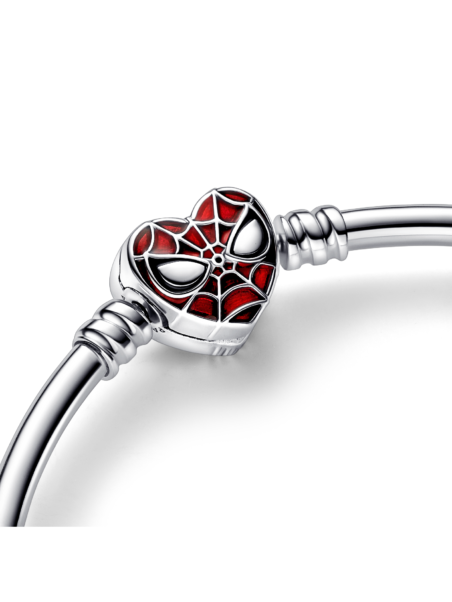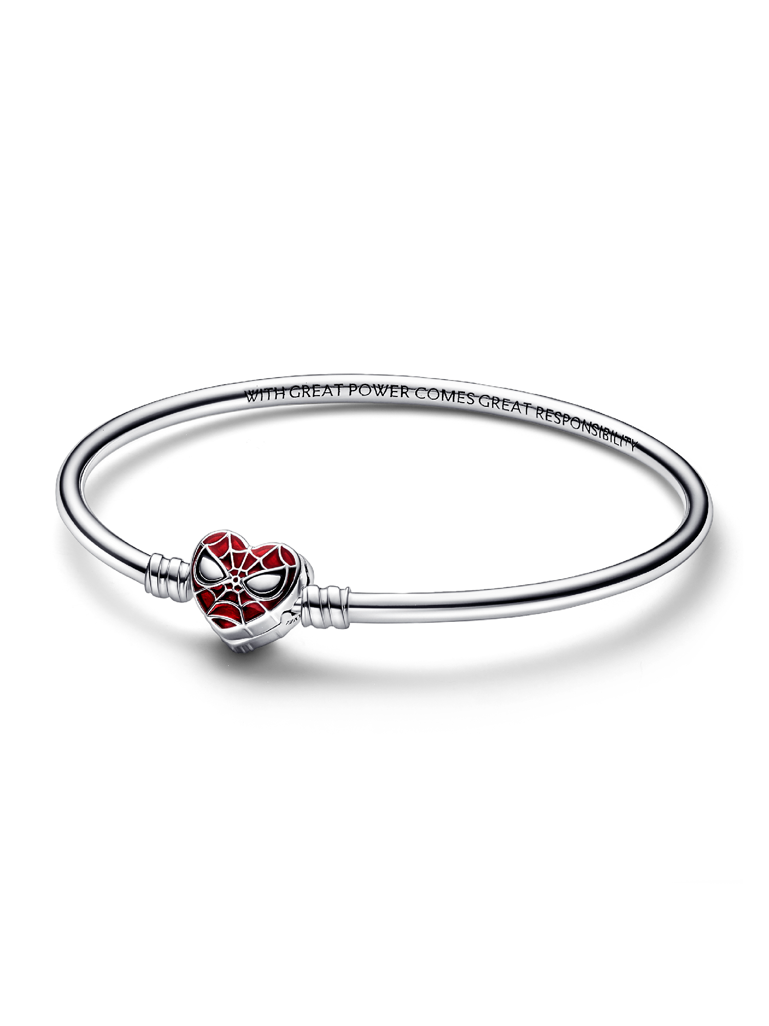 Gather your ultimate team of heroes with our Pandora Moments Marvel Spider-Man Mask Clasp Bangle. Collect all of the Spider-Man charms and style them on this sterling silver bangle with Spider-Man's mask at the center. The stylized heart clasp features bright enamel details to recreate the characteristic mask, while the bangle is engraved with the iconic quote "With great power comes great responsibility". Style yours with up to 18 charms, dangle charms or pendants and let your strengths shine.