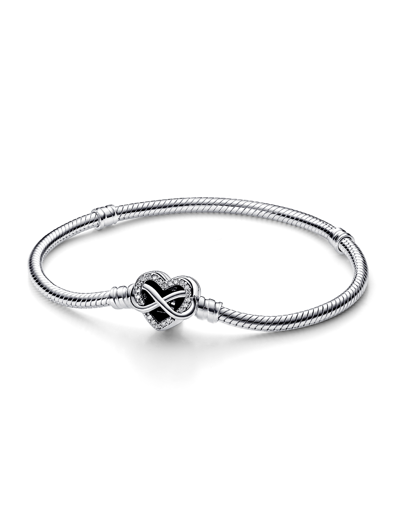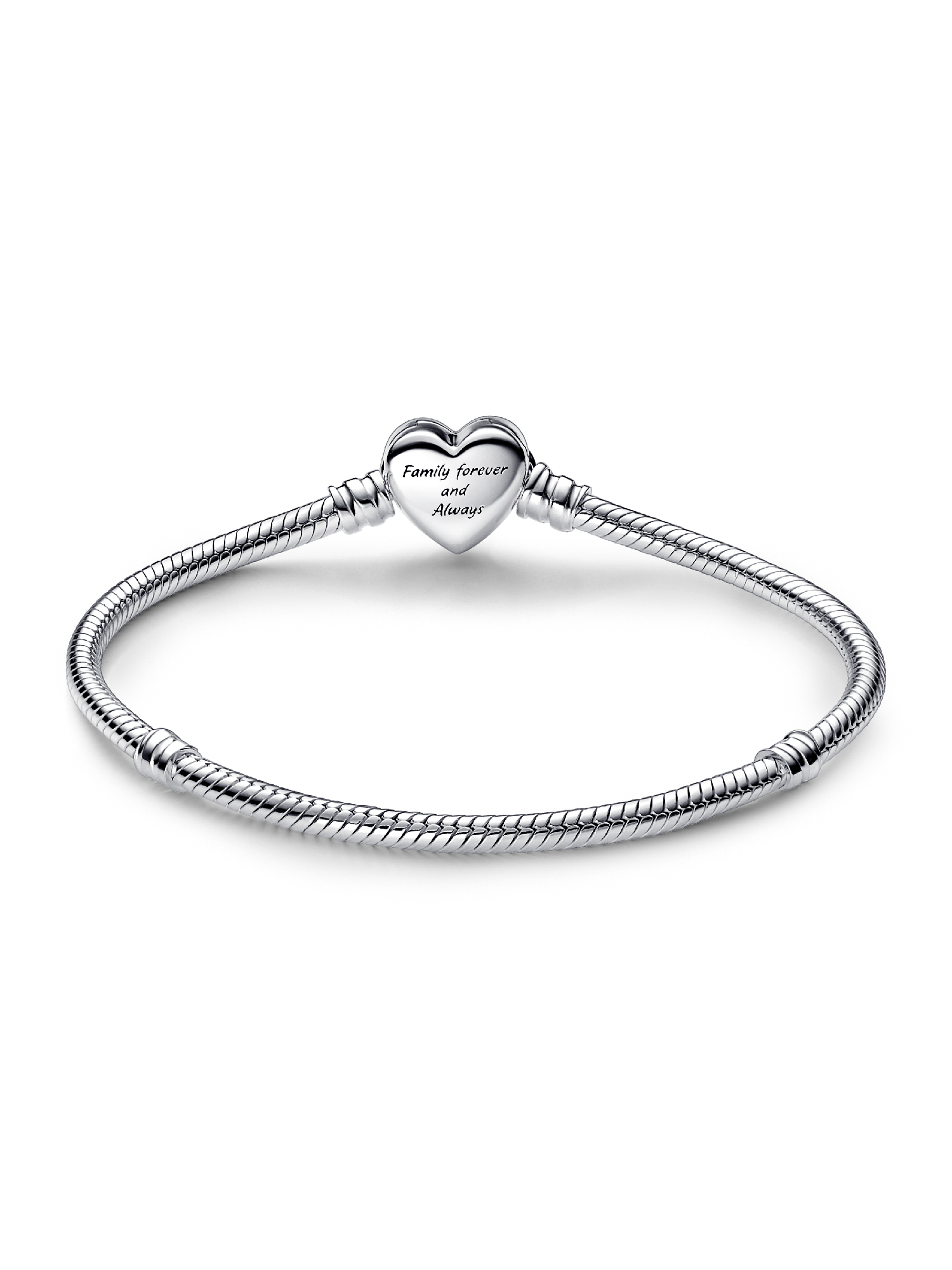 Representing the eternal love that binds family together, the Pandora Moments Sparkling Infinity Heart Clasp Snake Chain Bracelet is a meaningful gift for the ones that matter most to you. The openwork heart clasp features stones along the edge and an asymmetrical infinity symbol entwining around the heart. The back of the clasp is engraved with the message "Family forever and Always". The bracelet features two threaders (raised charm dividers) dividing it into three sections. Style it with up to 16-18 of your favorite charms or dangle charms to symbolize the ones you love, or gift it to someone close to your heart.