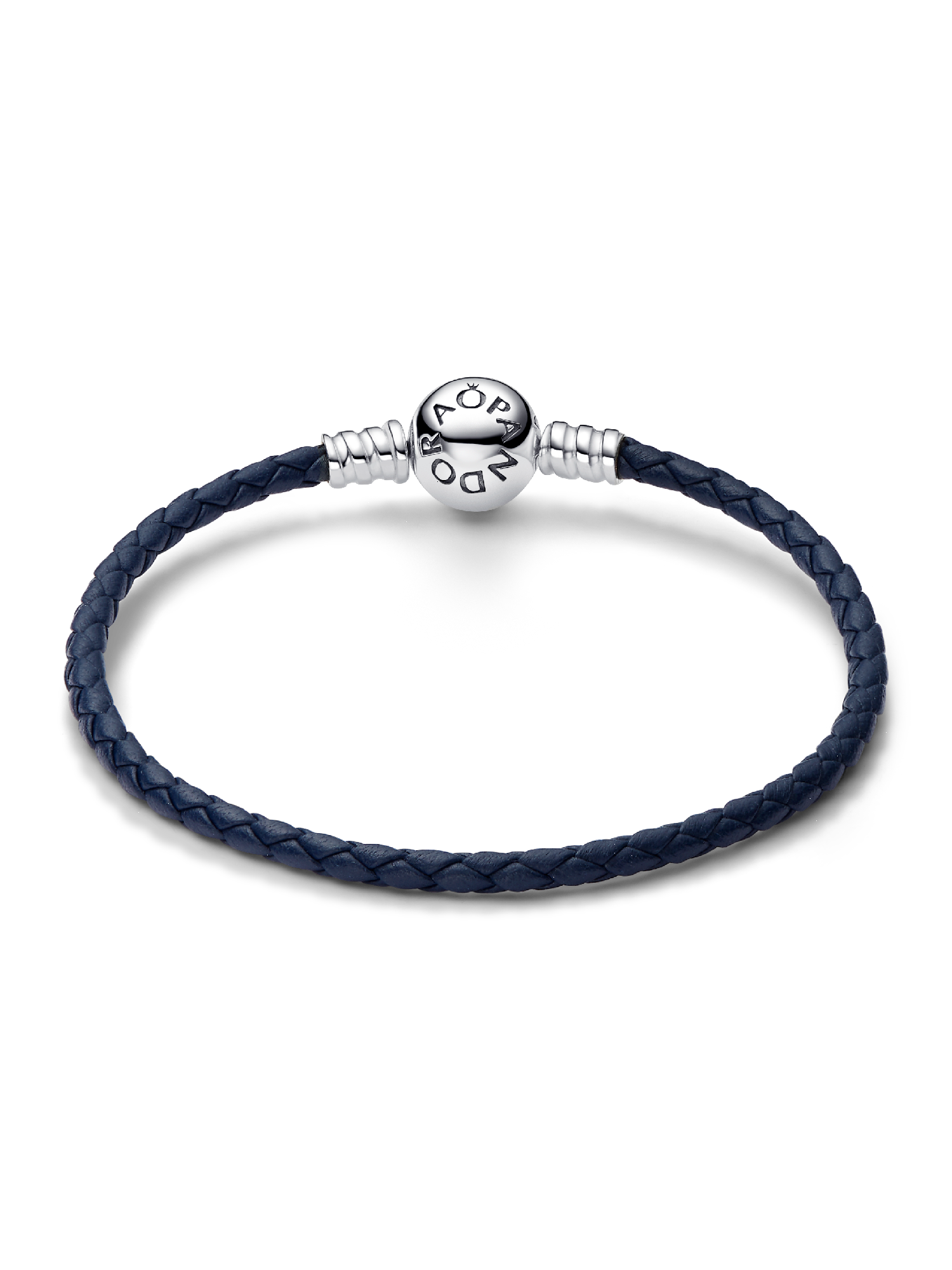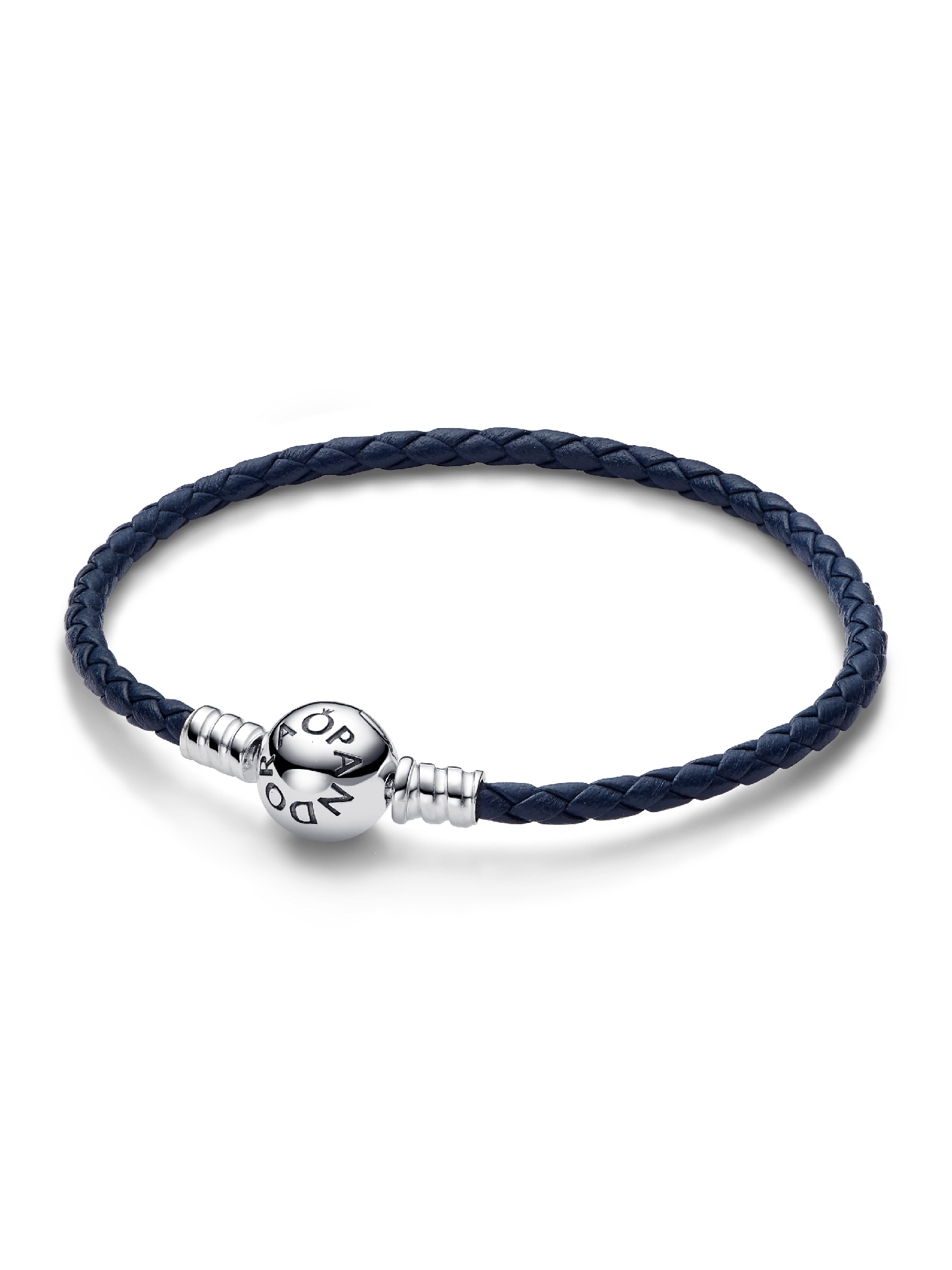 Channel the depths of the ocean and the calm of a midnight sky. The Pandora Moments Round Clasp Blue Braided Leather Bracelet is crafted from deep blue braided leather and finished with a round sterling silver clasp and threaded sterling silver end caps. Style it with up to 9 charms or dangle charms to perfectly offset your favorite charms.