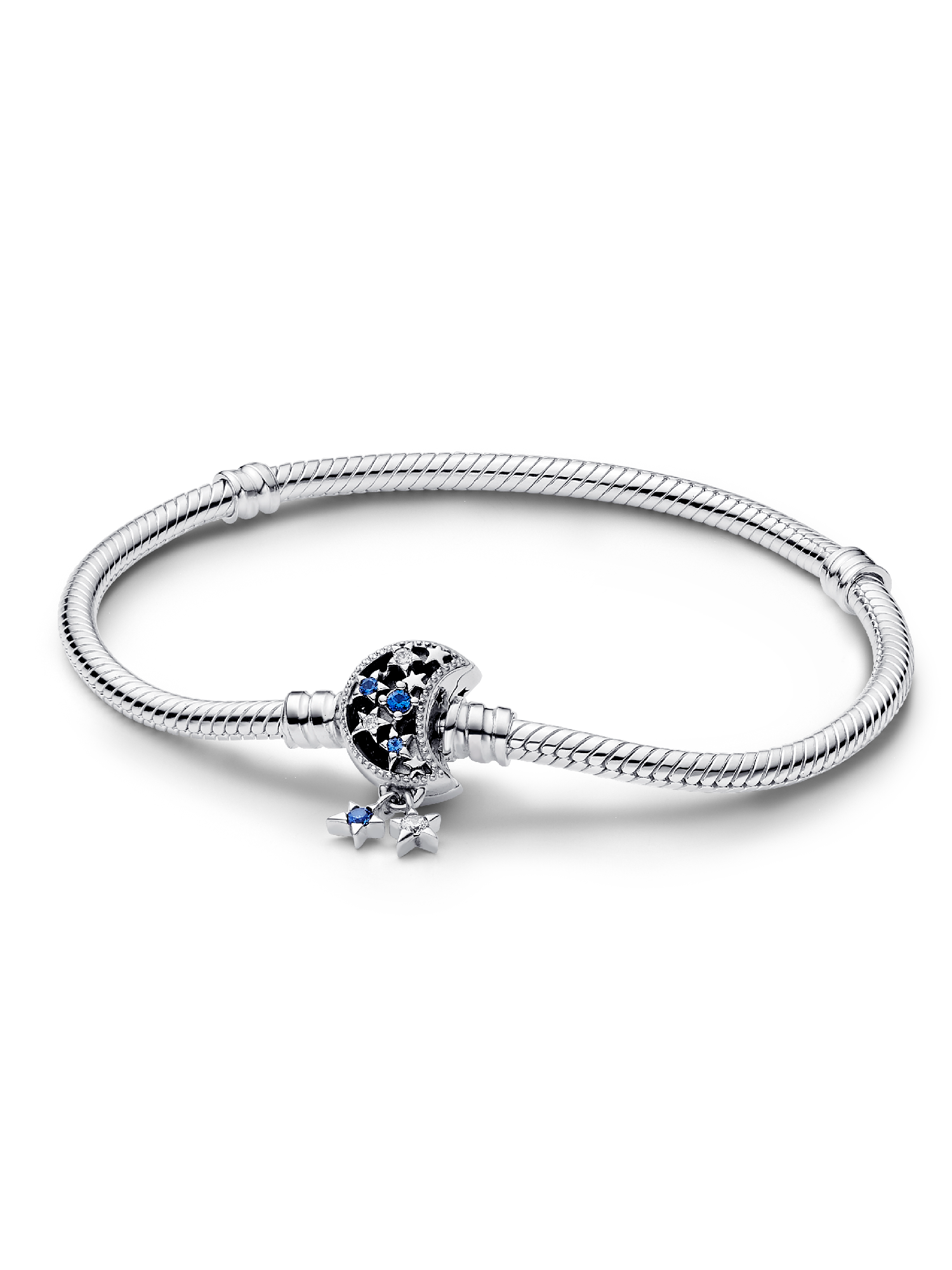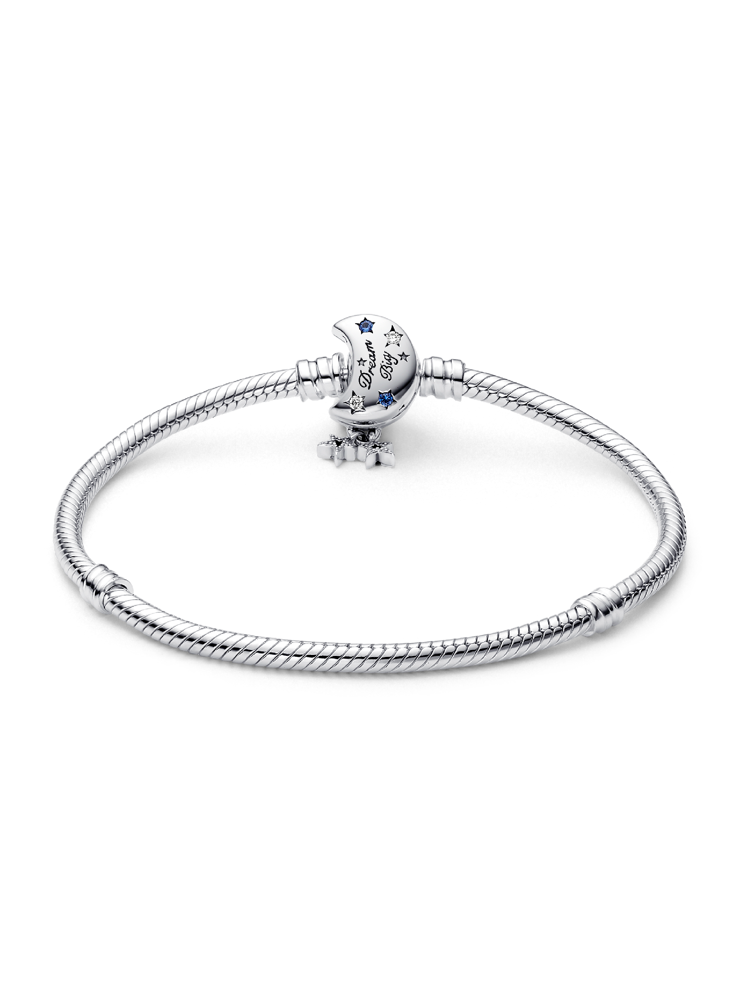 Bring a celestial touch to your style with the Pandora Moments Sparkling Moon Clasp Snake Chain Bracelet. With a clasp shaped like a crescent moon, this sterling silver snake chain bracelet has a "Dream big" engraving on the clasp's back. The intricate clasp features cut-out stars and circles set with six blue man-made crystals and five clear cubic zirconia, as well as microbeading and imprinted detailing. Two asymmetrical stars set with sparkling stones dangle from the clasp, adding a dash of movement to this essential piece.