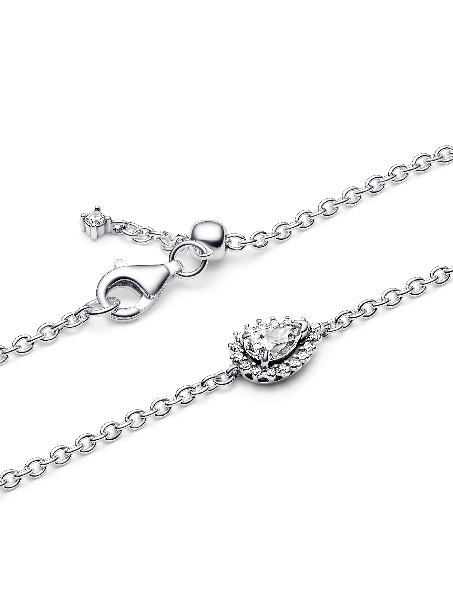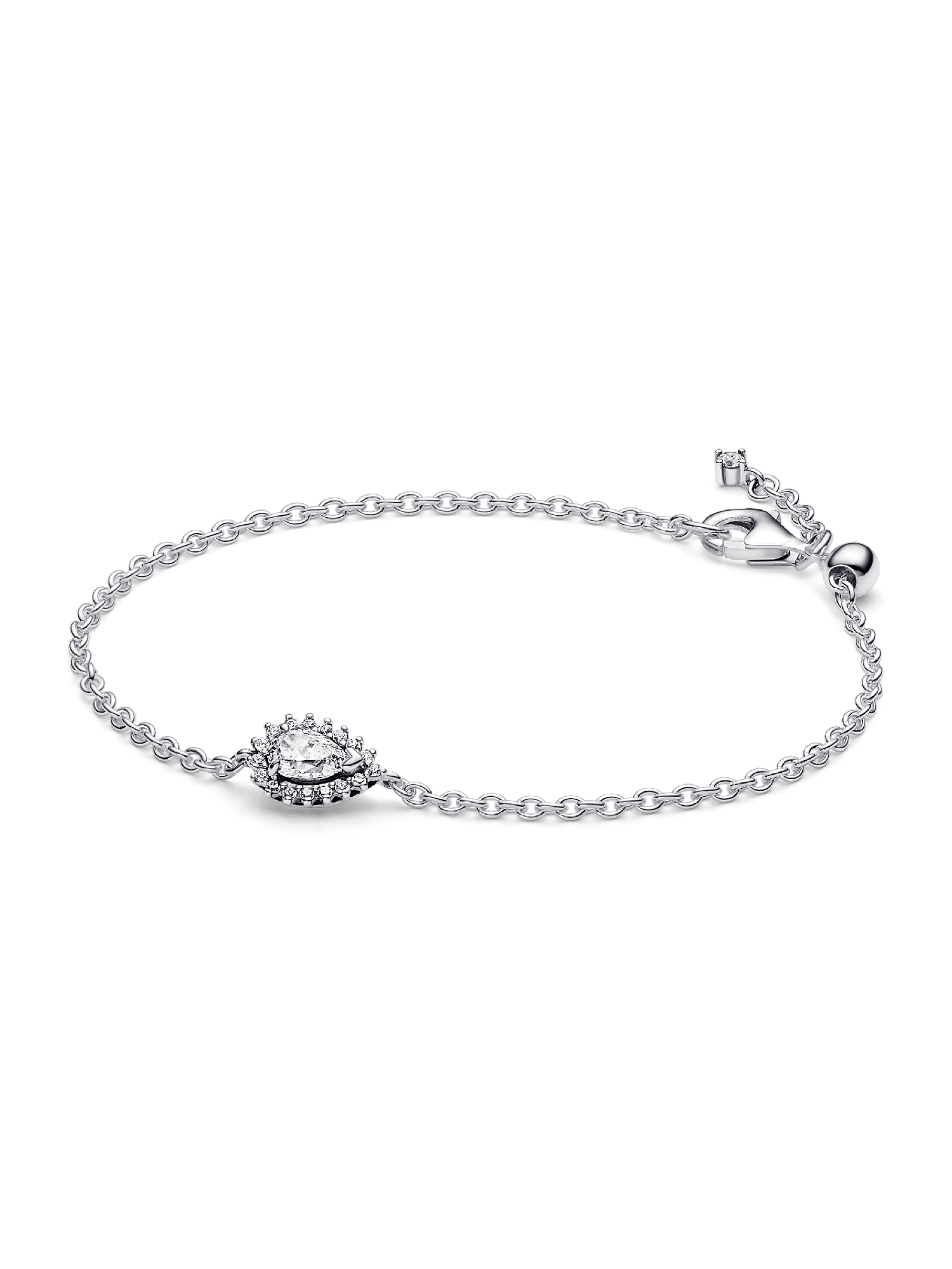 Shine brighter than ever when you wear the Sparkling Pear Halo Chain Bracelet. This bracelet features a striking pear-shaped stone raised slightly above a delicate pavé halo. A V-shaped prong and two round prongs hold the center stone in place, while a clasp with an adjustable silicone ball keeps your bracelet secure. A small stone dangles from one end of the chain. A reimagined classic with ample sparkle and dimension, this sterling silver chain bracelet makes a stunning statement and a perfect gift.