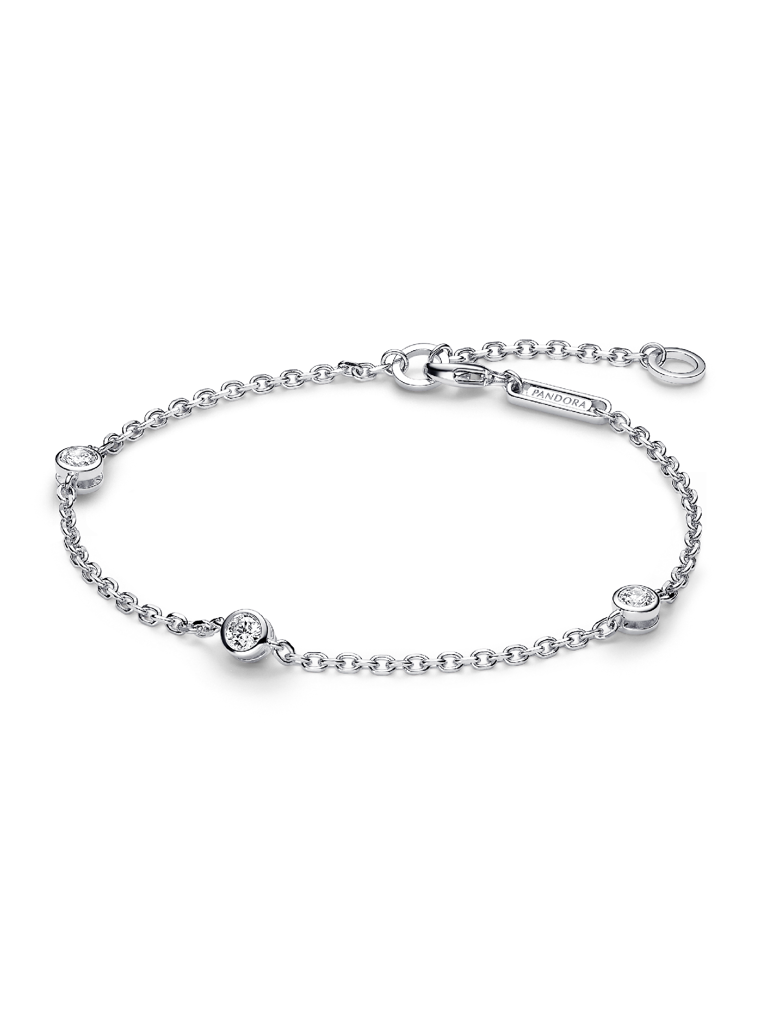 Meet your new essential lab-grown diamond bracelet. The Pandora Era Bezel Sterling Silver Lab-grown Diamond Station Chain Bracelet features three bezel-set 0.10 carat lab-grown diamonds, with a total carat weight of 0.30. Cut-outs on the back and sides of the bezel setting let in the light for ultimate sparkle. The lab-grown diamonds are fixed along a sterling silver diamond-cut cable chain with faceted links that reflect the light, lending the bracelet a subtle shimmer. Adjustable to two lengths, it's the perfect elevated staple for your everyday looks.