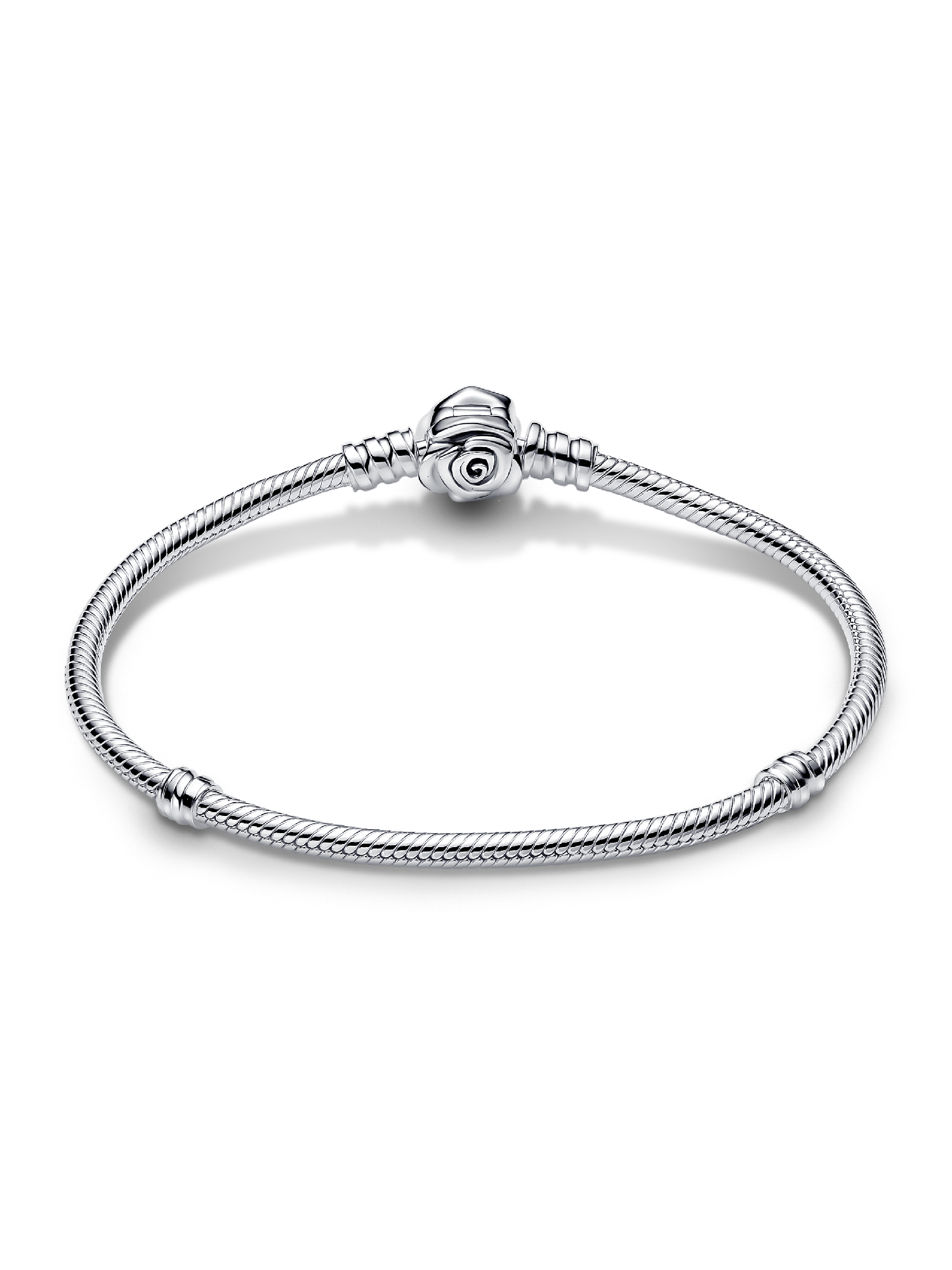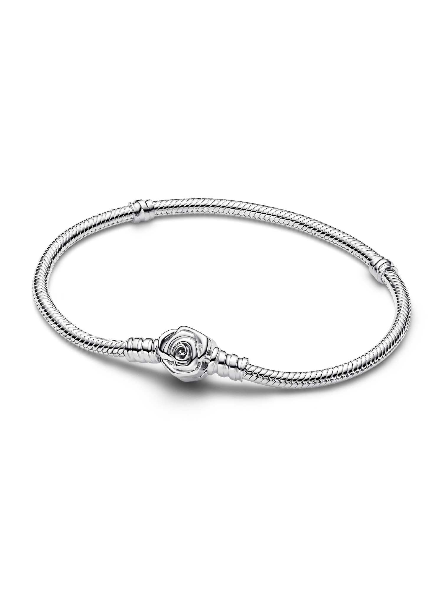 Capture the feeling of romance with our Pandora Moments Rose in Bloom Clasp Snake Chain Bracelet. Crafted in sterling silver, the bracelet is more than a jewelry style, it's an expression of love. The intricately designed rose clasp with its layered petals adds a touch of floral elegance and symbolism. Versatile and stylish, it accommodates 16-18 charms, divided by functional threaders that allow you to space out your charm collection. Wear it as a reminder of the love you have in your life or gift it to someone you care about.