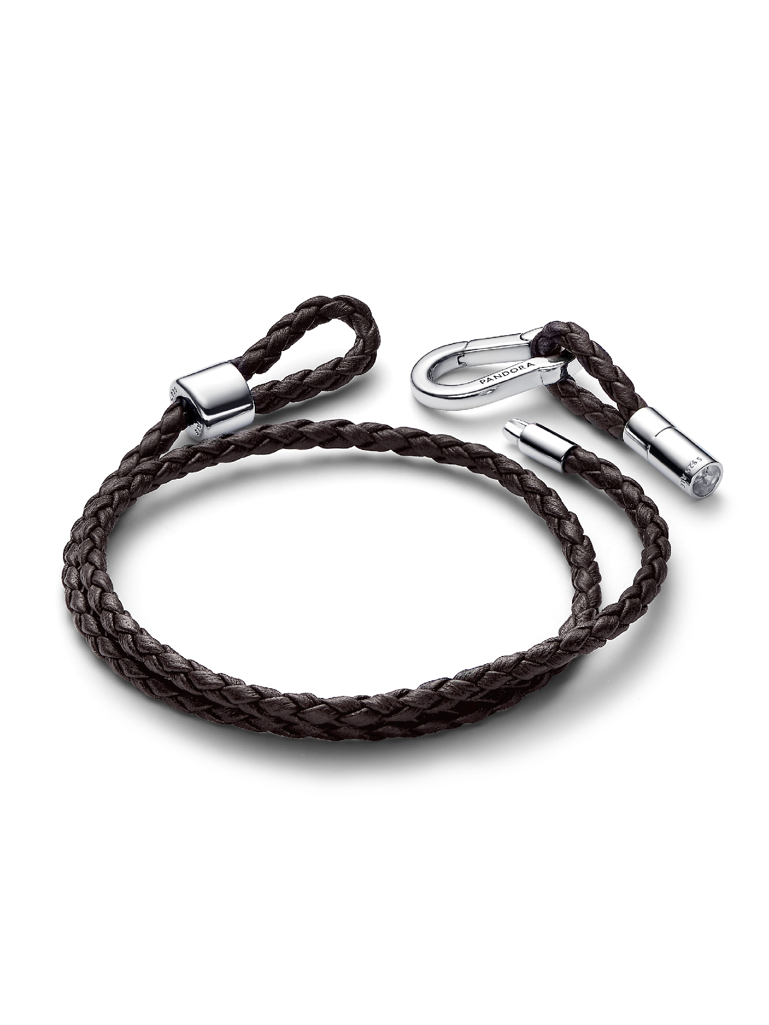 Earthy meets edgy in the Pandora Moments Brown Braided Double Leather Bracelet. Braided brown leather wraps around twice and closes with a sterling silver carabiner clasp that has a Pandora logo engraved on both sides. Adjust the bracelet using a sliding metal cap on one end of the bracelet; add and secure charms using an openable metal cap on the other end. Customise this contemporary, super wearable bracelet with up to 16 to 18 charms or dangle charms.
