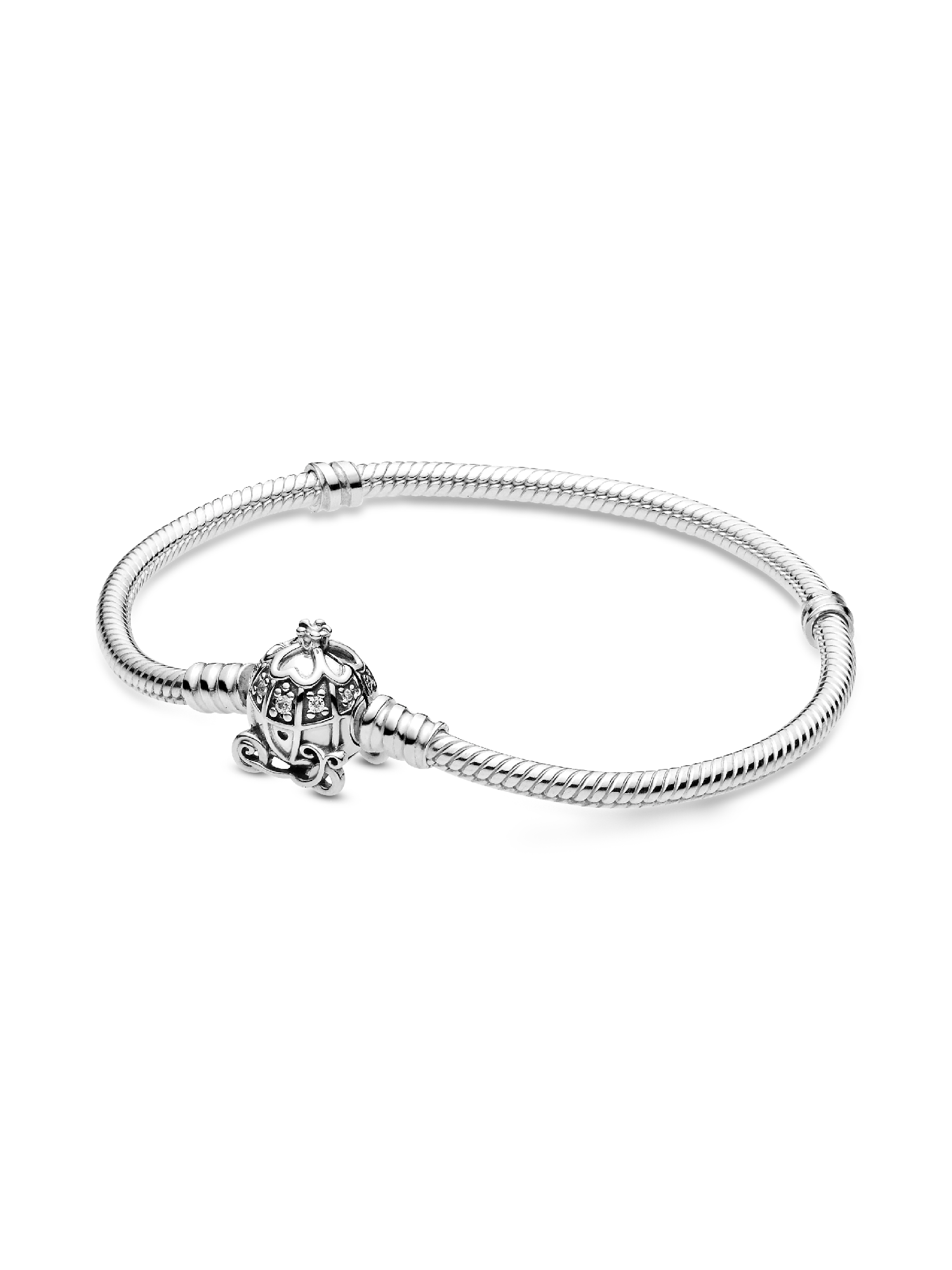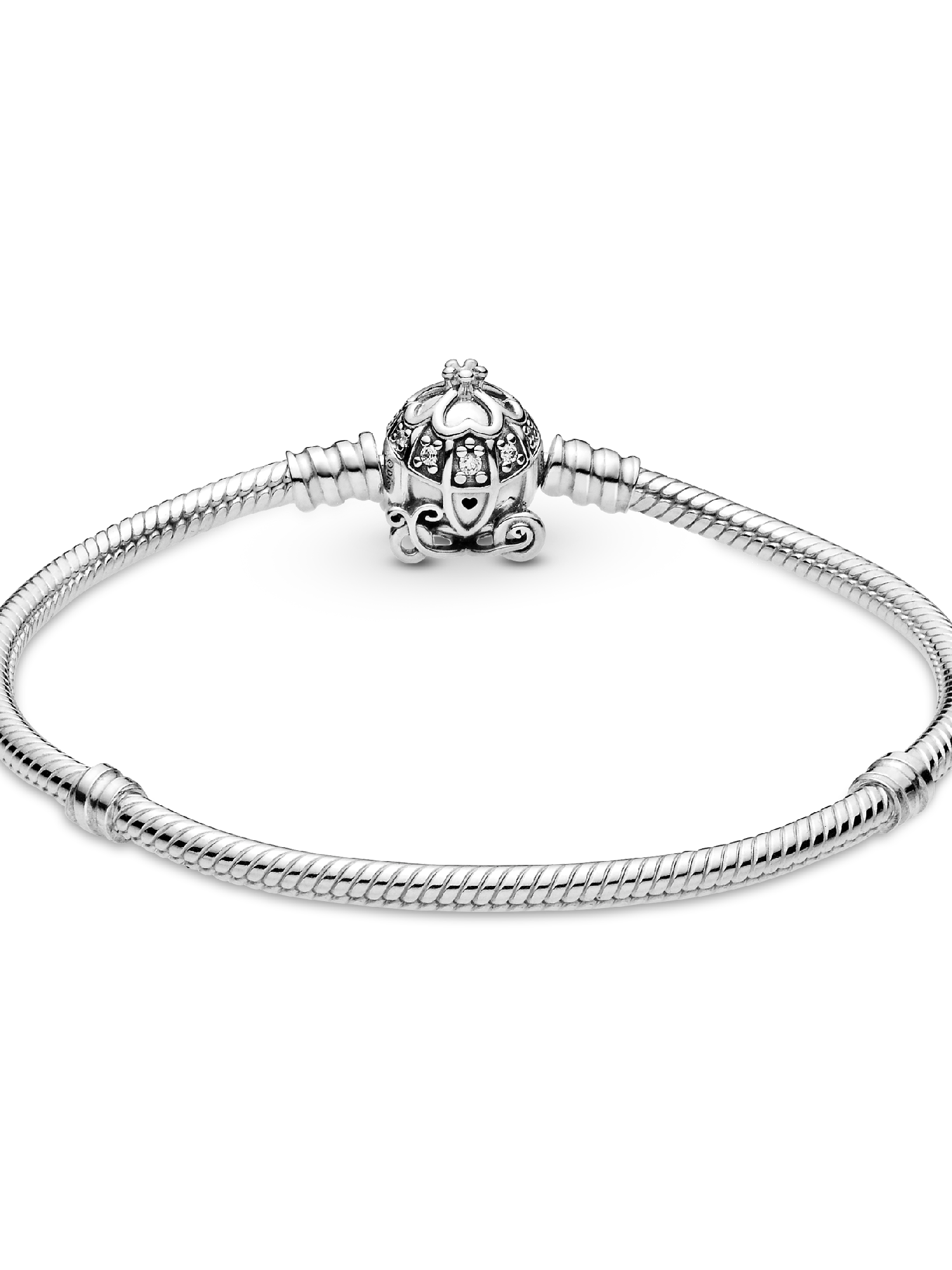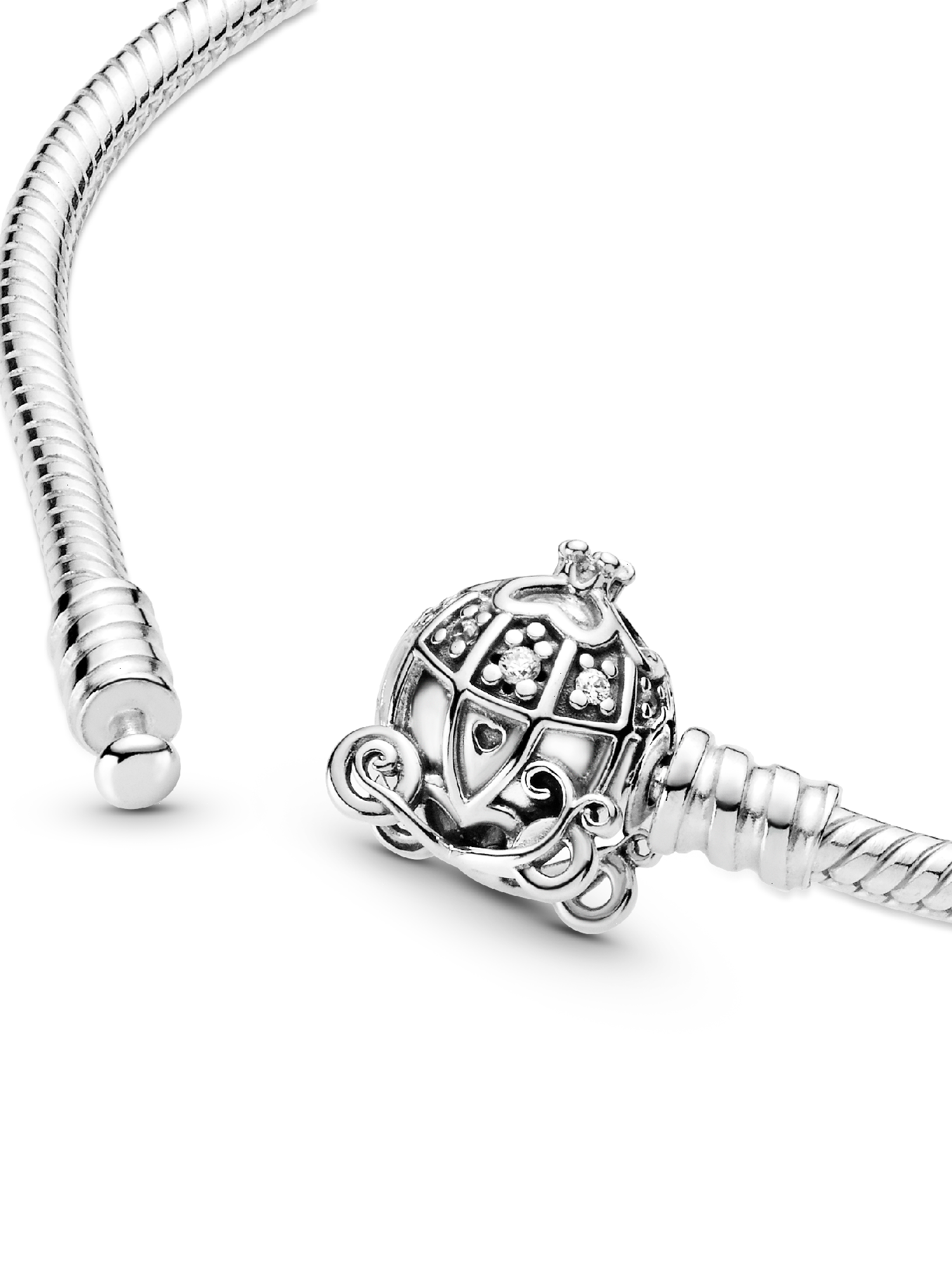 Make a wish with the Disney Cinderella Pumpkin Coach Clasp Pandora Moments Bracelet. Hand-finished in sterling silver, celebrate the 70th anniversary of Disney’s Cinderella with this bracelet. This piece features a pumpkin carriage with stone settings for windows, four hearts that form a clover and a 3D crown on the roof, a grooved heart for a door handle and pumpkin wheels. With the Pandora and Disney logos on the back, attach your favorite Disney x Pandora charms to this bracelet for a magical effect.