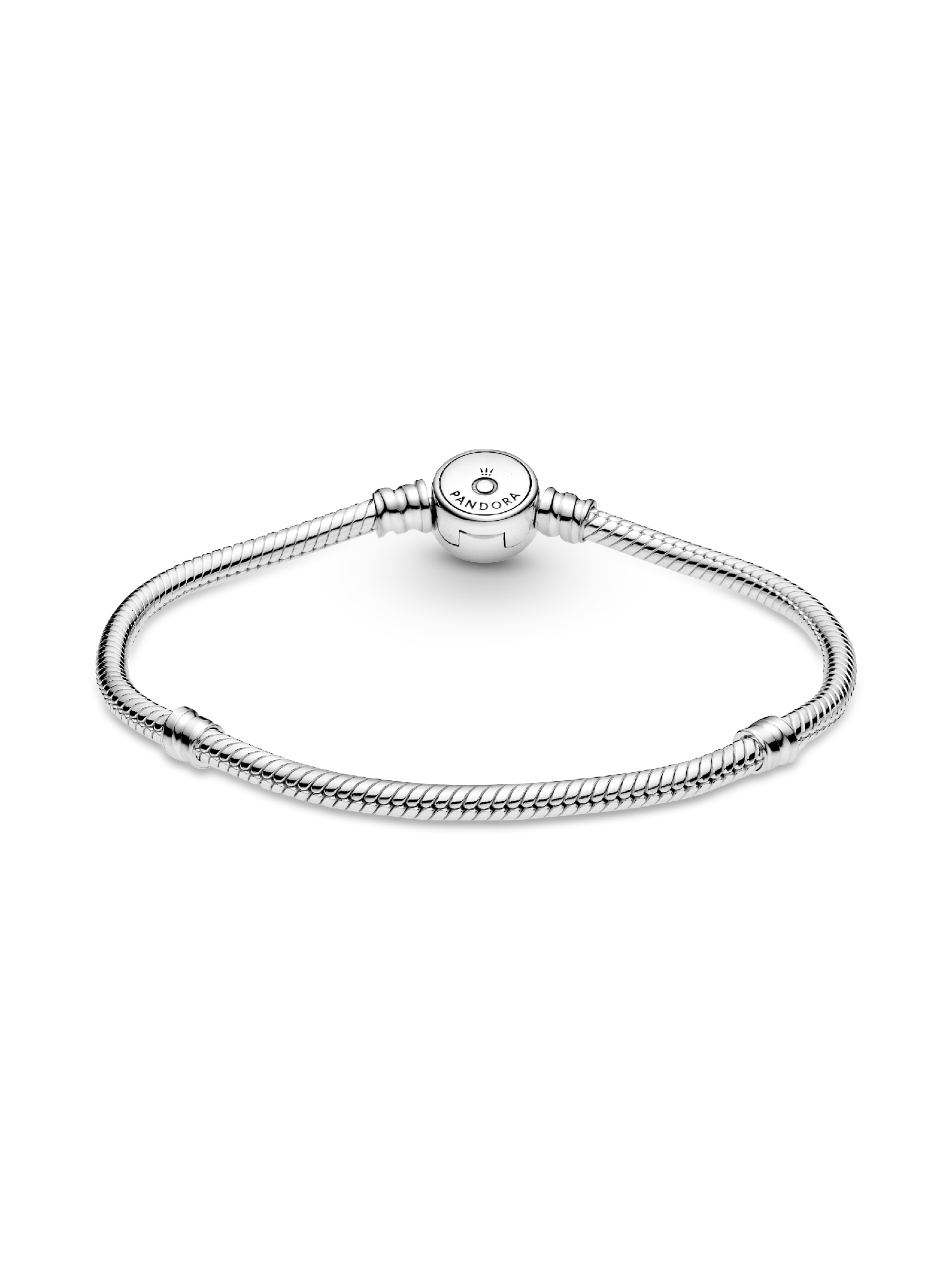 For a hint of color, look to the Pandora Moments Sparkling Blue Disc Clasp Snake Chain Bracelet. Hand-finished in sterling silver, this piece features our iconic snake chain. The small disc-shaped clasp is decorated with sparkling blue stones in different sizes, with the polished reverse side including the Pandora Crown O monogram and logo. Pair with colorful charms for a vibrant addition to your look.