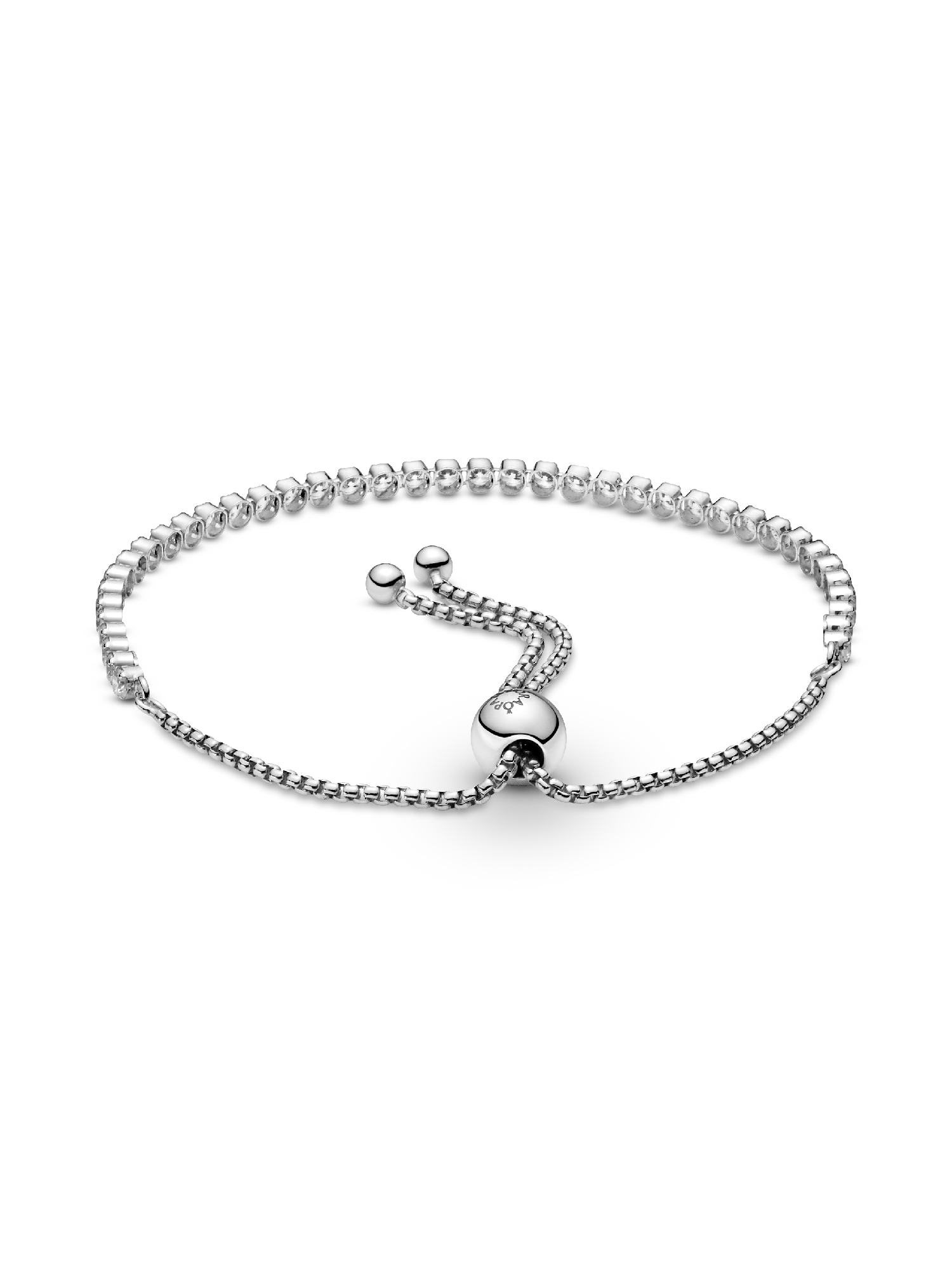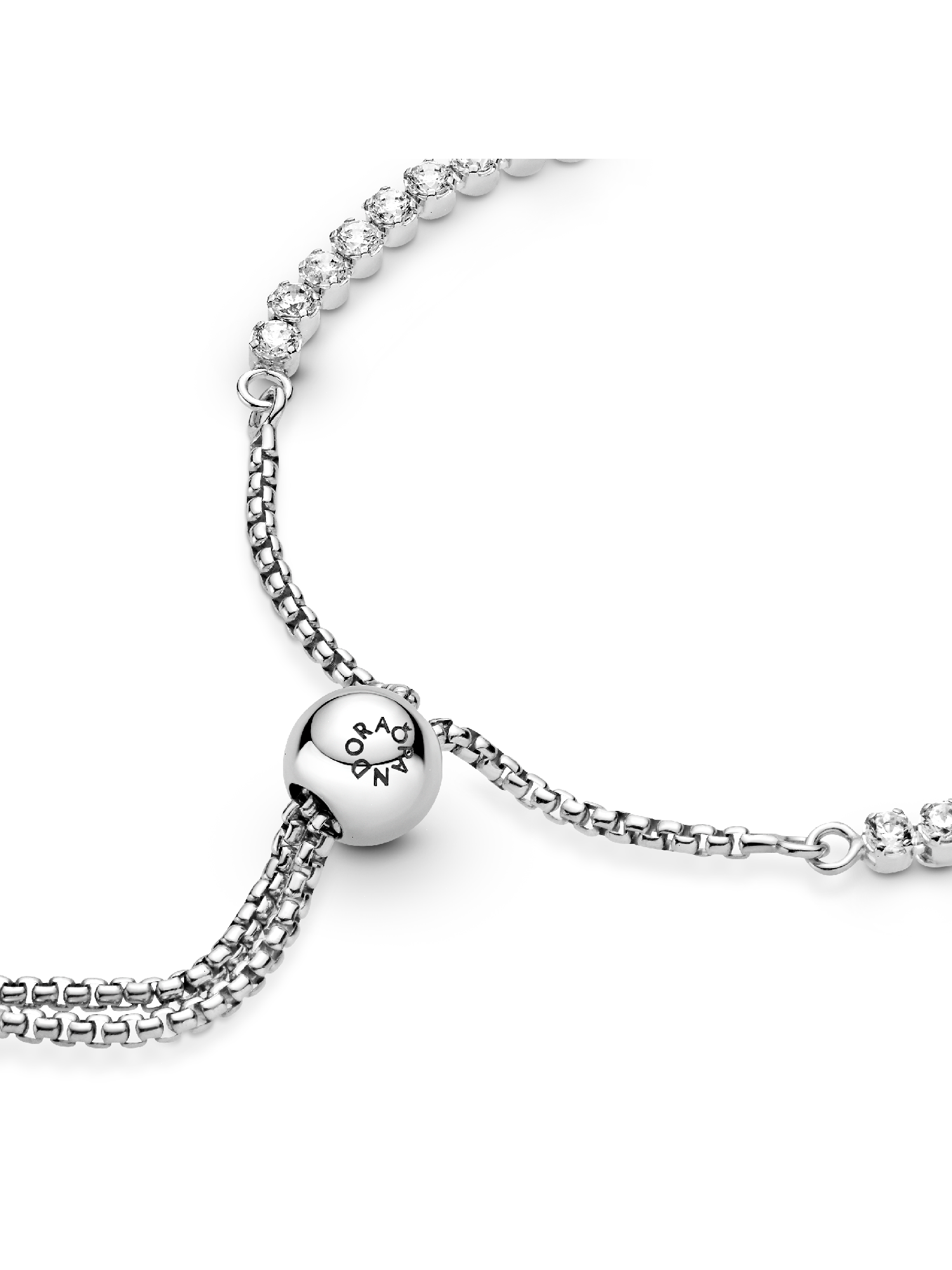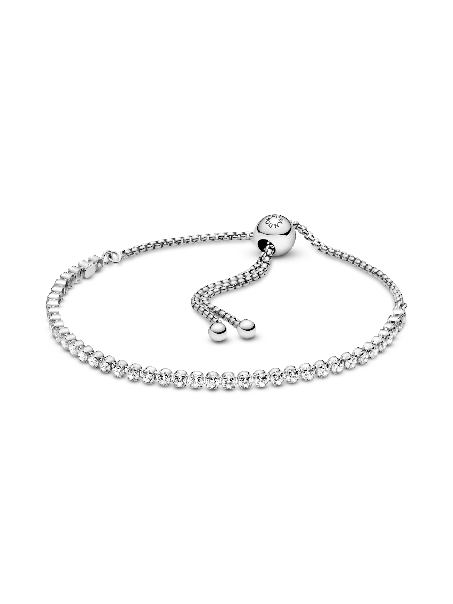 Tennis anyone? Upgrade your style game with Pandora's modern twist on the timeless tennis bracelet. Crafted in rhodium-plated sterling silver, this statement piece is embellished with sparkling cubic zirconia stones and features a chic sliding clasp, making it easy to adjust to your wrist size. Wear it solo or layered with other Pandora bracelets, for a fun and modern look.