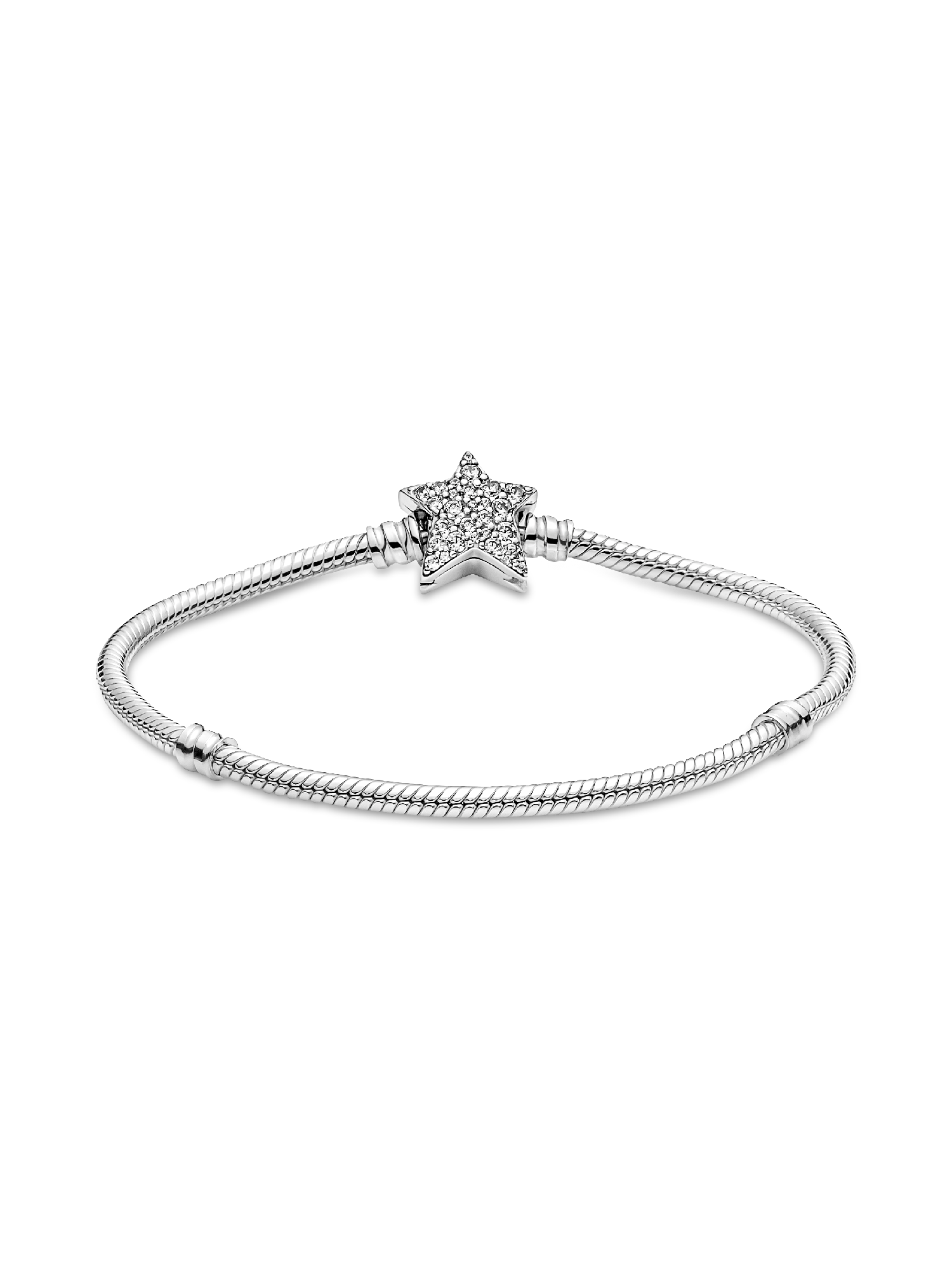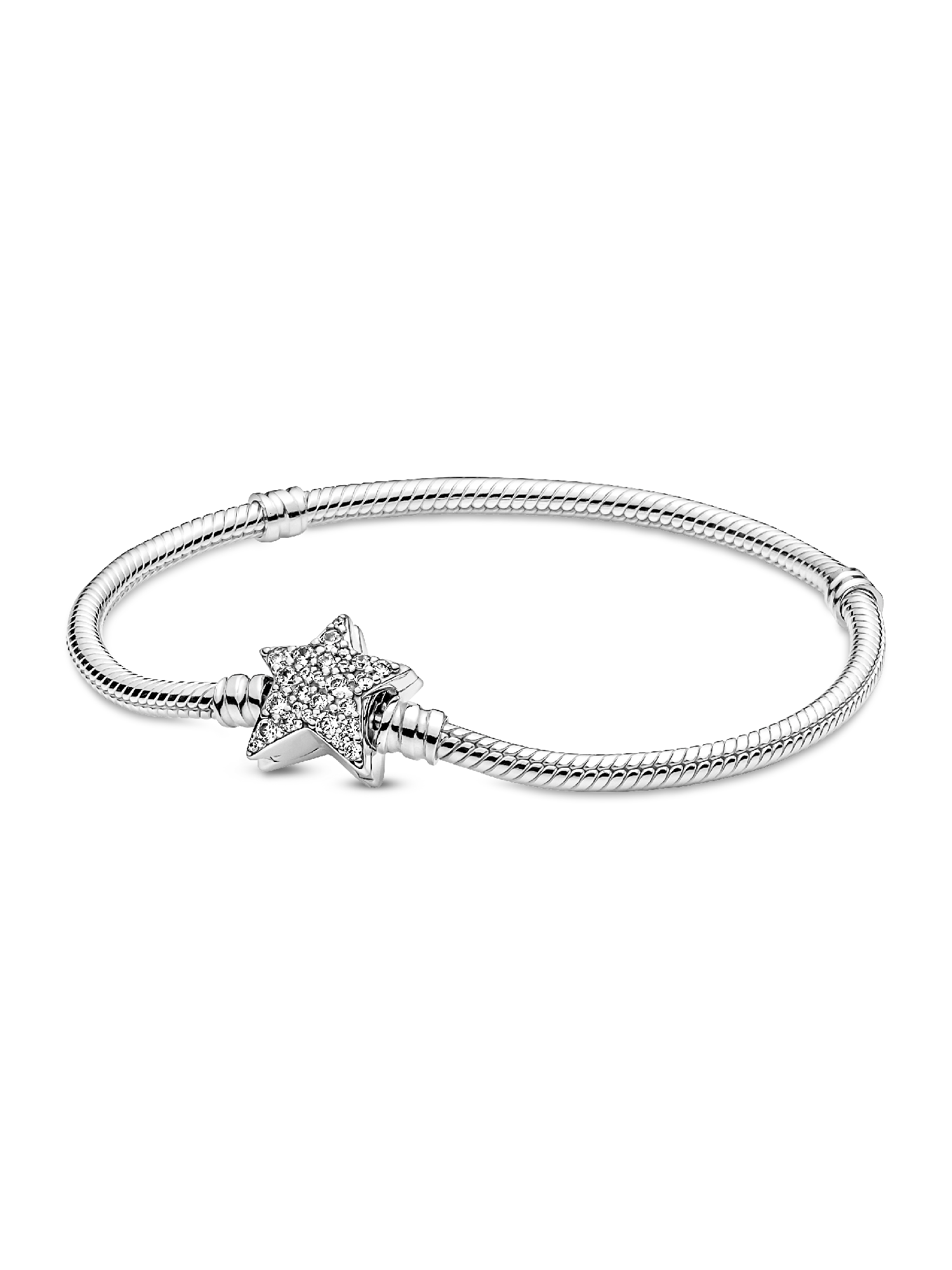Bring celestial sparkle to your look with the Pandora Moments Asymmetric Star Clasp Snake Chain Bracelet. Hand-finished in sterling silver, the bracelet's star-shaped clasp is covered by sparkling clear cubic zirconia pavé on both sides. It can be worn with up to 16-18 desired charms and clips. Wear it on its own for a simple, understated look, or stack it with other celestial-inspired designs for a look that’s out of this world.