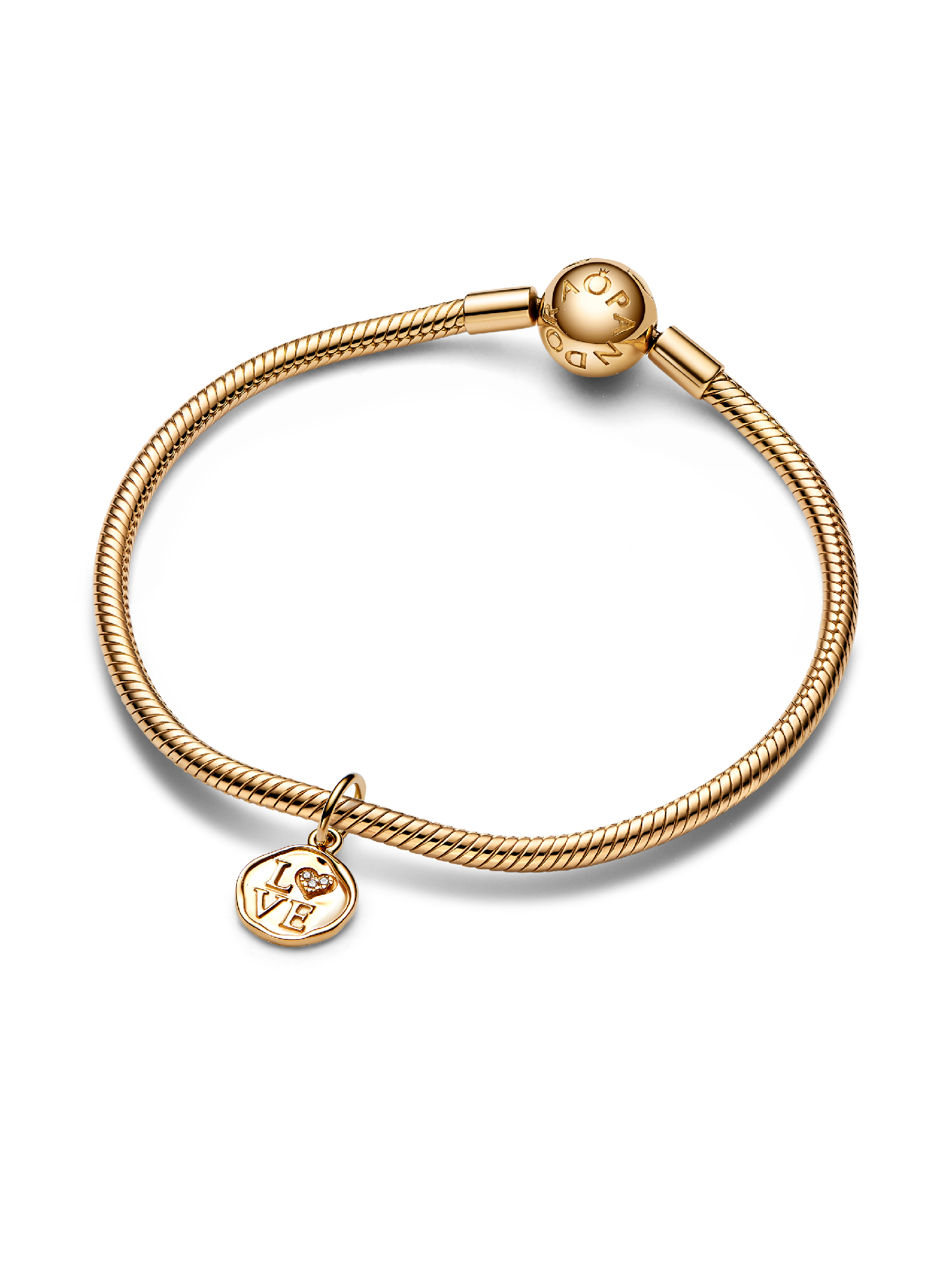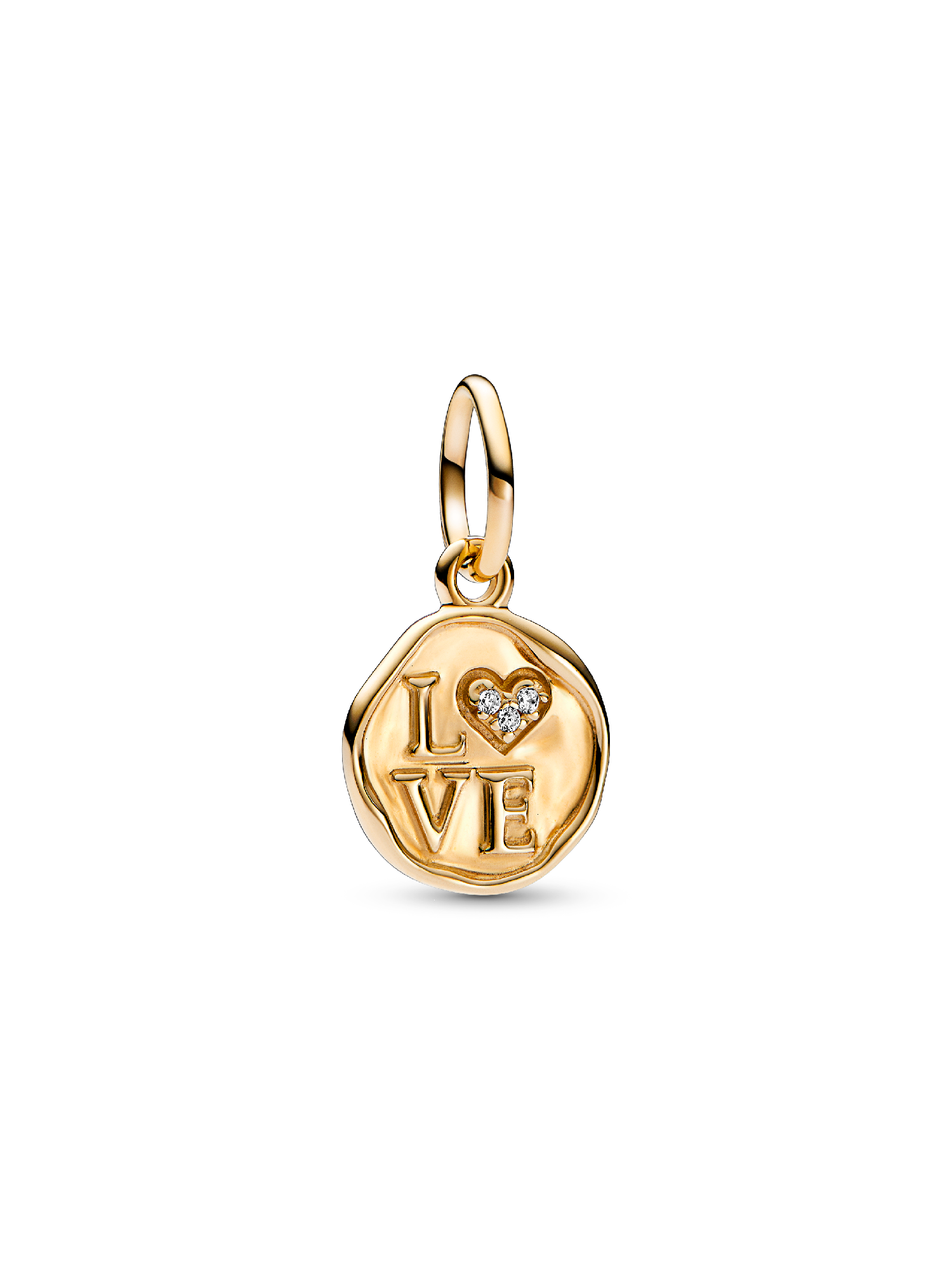 A golden gift for the one who's left their stamp on your heart. The Sparkling Love Stamp Dangle Charm is crafted in 14k solid gold and features an organically shaped round disc with slightly raised edges, resembling an old-fashioned wax seal on a letter. At the center are raised letters spelling "L♥VE", with three stones set into a heart shape in place of the "O". Carry a message of love wherever you go when you wear it on your favorite Pandora jewelry or charm holder.