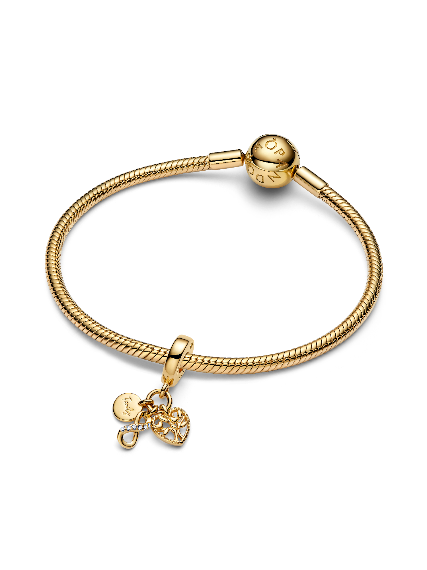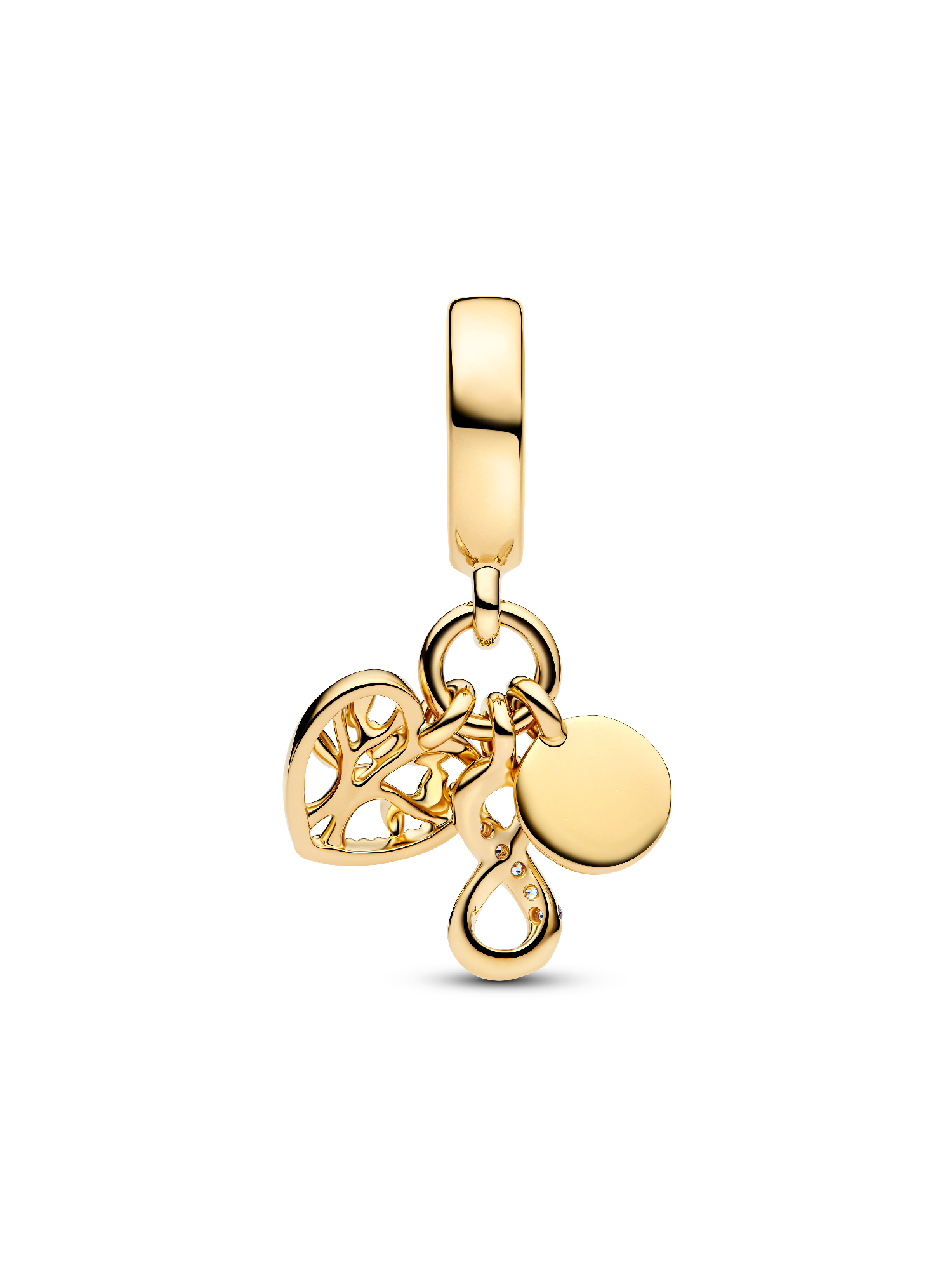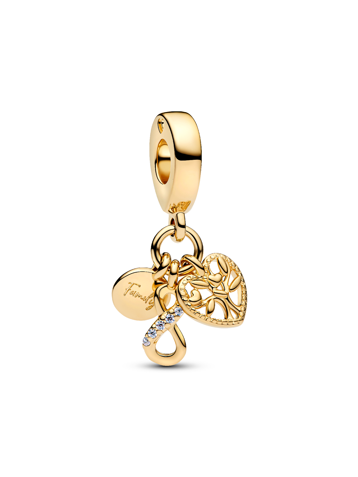 Celebrate the beauty of family with our 14k gold-plated triple dangle charm. Featuring a family tree in a heart, an infinity symbol and a 'family' engraving, it’s a symbol of shared love and unity.