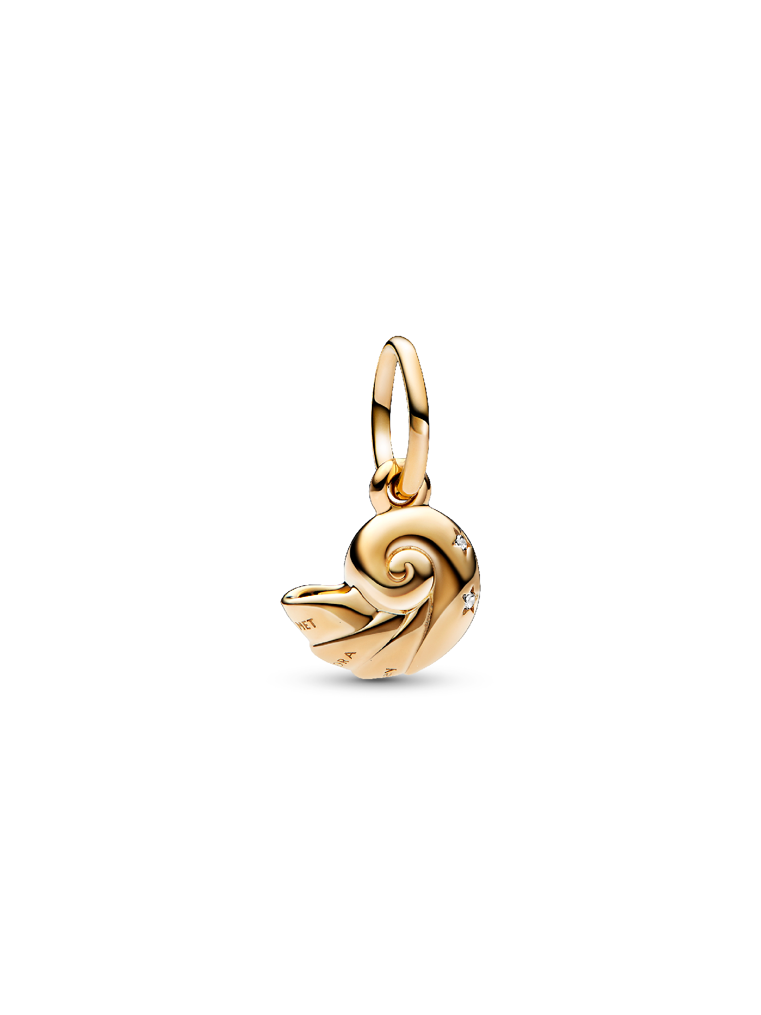 Come out of your shell with our Disney The Little Mermaid Enchanted Shell Dangle Charm. Hand-finished in 14k gold plating, this charm features grooved lines and a realistic spiral effect, along with four sparkling round stones in a starfish-shaped setting resting on the shell's side. "My voice is a treasure" is engraved on the charm as a reminder to let yourself be heard and always trust your instincts.