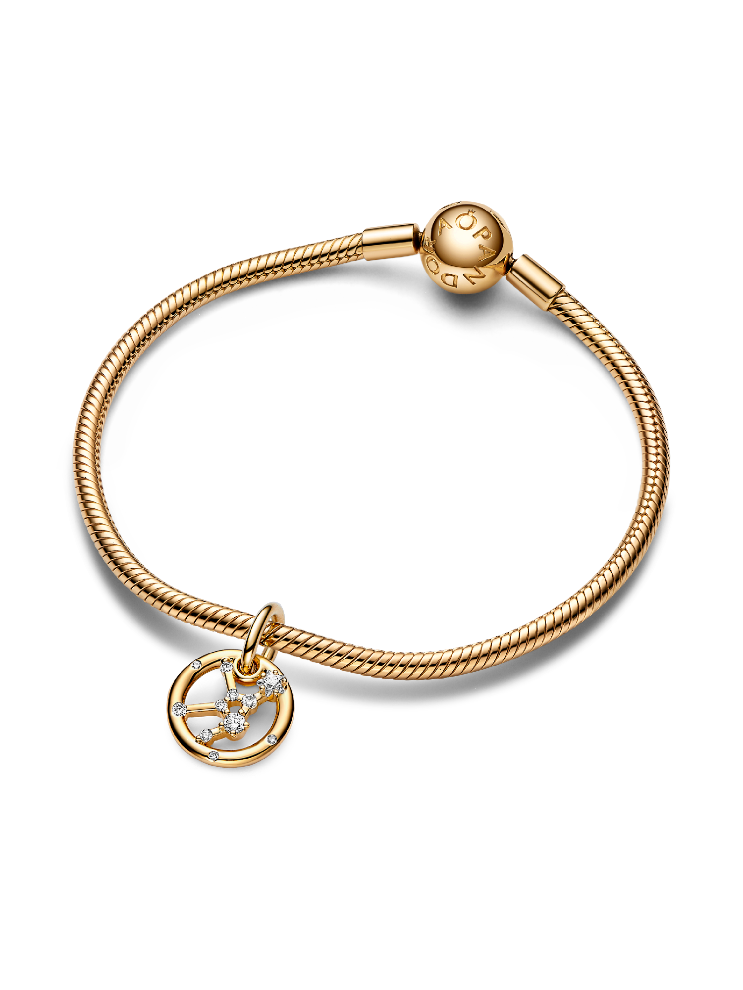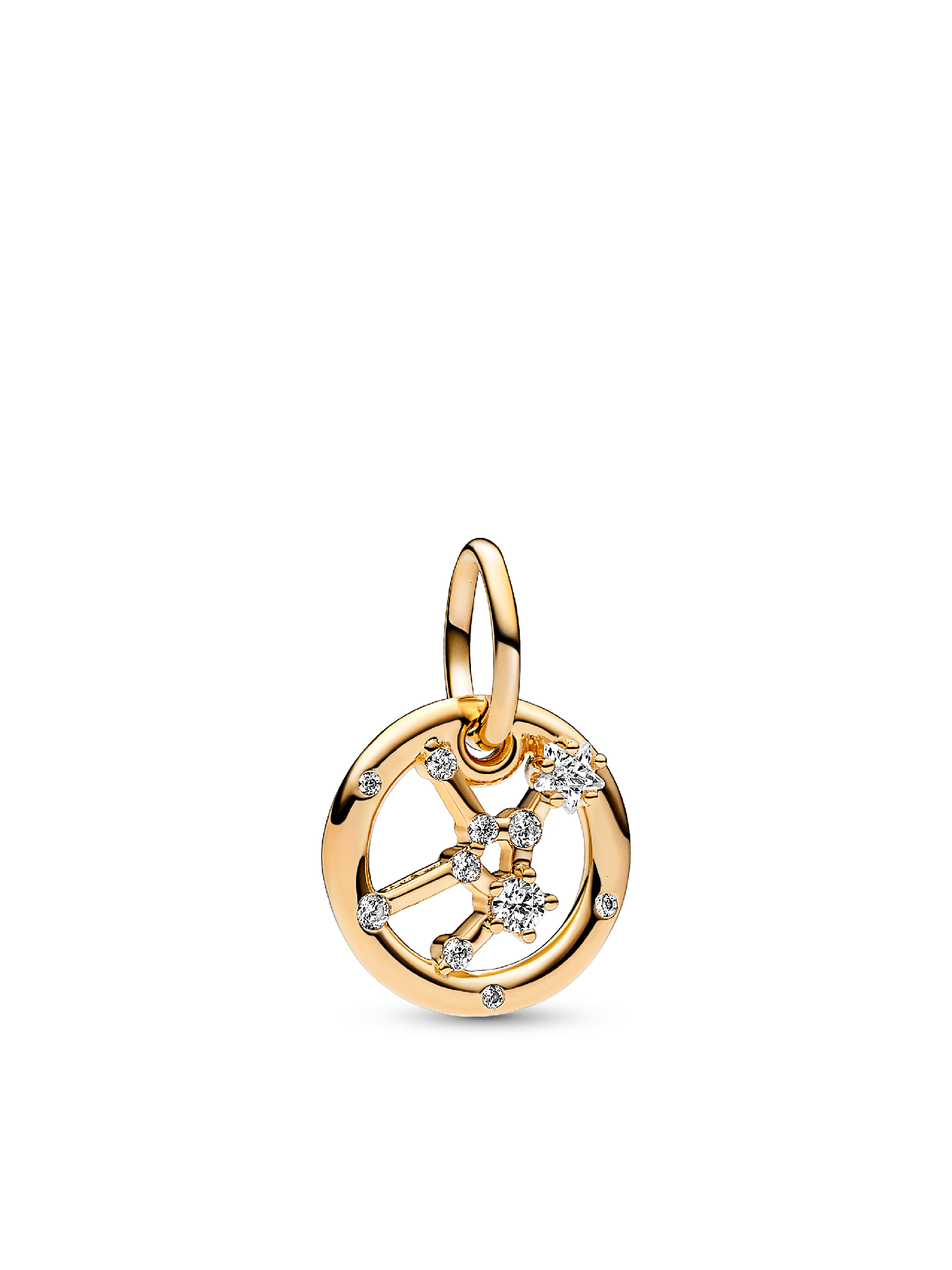 Let the stars guide your look with the Virgo Zodiac Dangle Charm. The dangle is crafted our 14k gold-plated unique metal blend, has a circular outer frame and features clear sparkling cubic zirconia as well as the shape of the Virgo zodiac sign. The back side of the frame is engraved with "Virgo". Hard working and productive, the Virgo in your life can always be counted on to be organized, disciplined and dependable. Wear this Pandora Moments Dangle Charm as a sign of your own sign's strength or give it as a gift of appreciation to the Virgo in your life.