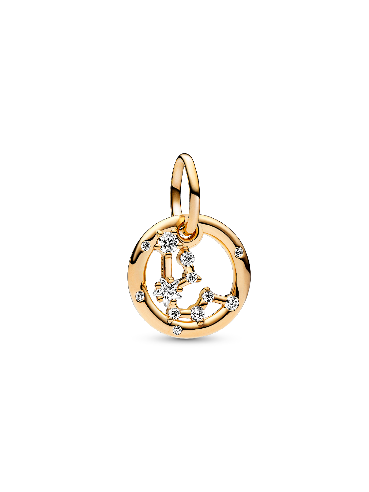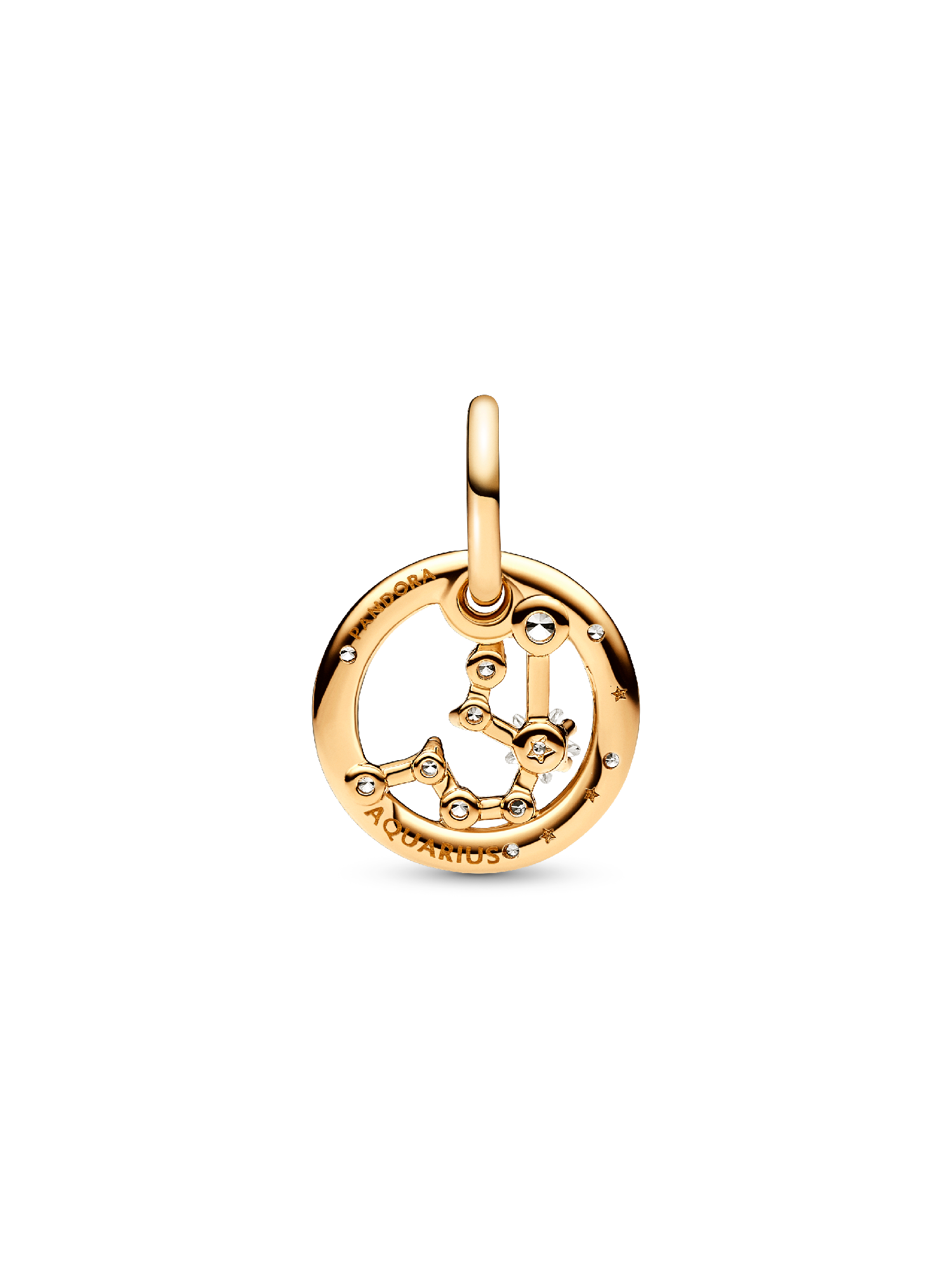 Let the stars guide your look with the Pandora Aquarius Zodiac Dangle Charm. The dangle is crafted our 14k gold-plated unique metal blend, has a circular outer frame and features clear sparkling cubic zirconia as well as the shape of the Aquarius zodiac sign. The back side of the frame is engraved with "Aquarius". Unique, altruistic and innovative, the Aquarius in your life can always be counted on to bring about change with optimism. Wear this Pandora Moments Dangle Charm as a sign of your own sign's strength or give it as a gift of appreciation to the Aquarius in your life.