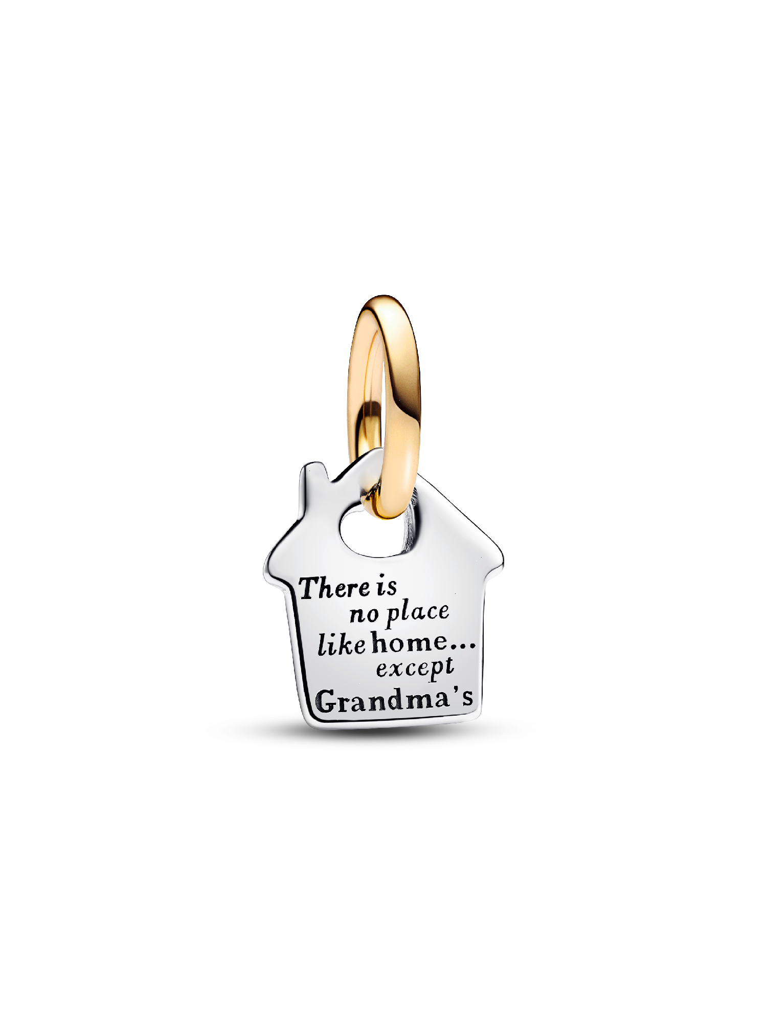 Carry the heart of family sentiment everywhere you go with our Two-tone Grandma's House Dangle Charm. Keep your loved ones close with our grandma charm that captures the essence of home. With a two-tone finish, crafted in sterling silver and featuring a 14k gold plating, this charm features a house-shaped disc with a whimsical heart-shaped cut-out on the roof. One side is engraved with "There is no place like home... except Grandma's," adding a touch of humor to the heartfelt piece. Let this meaningful charm remind you of the warmth of home with every glance.