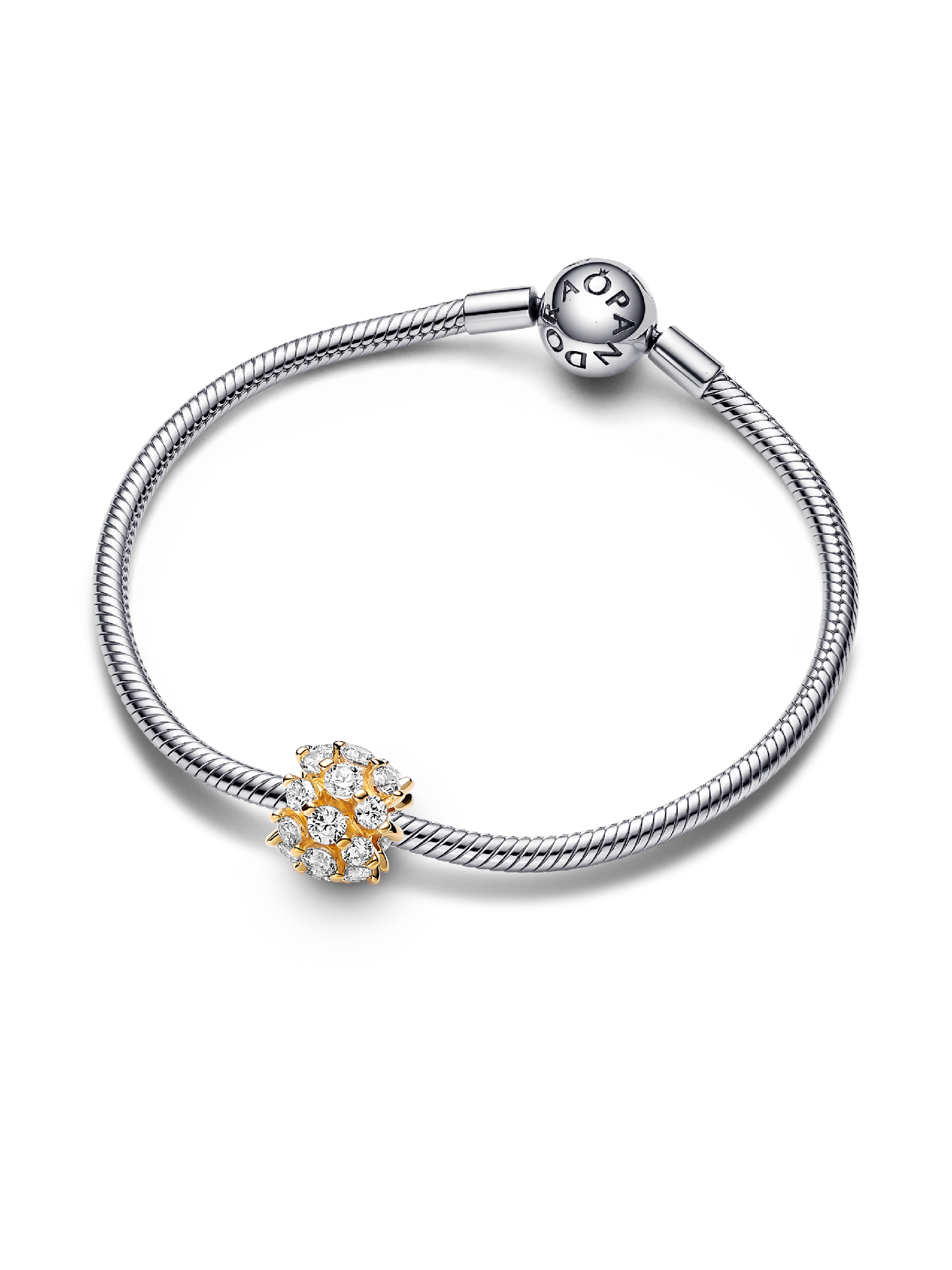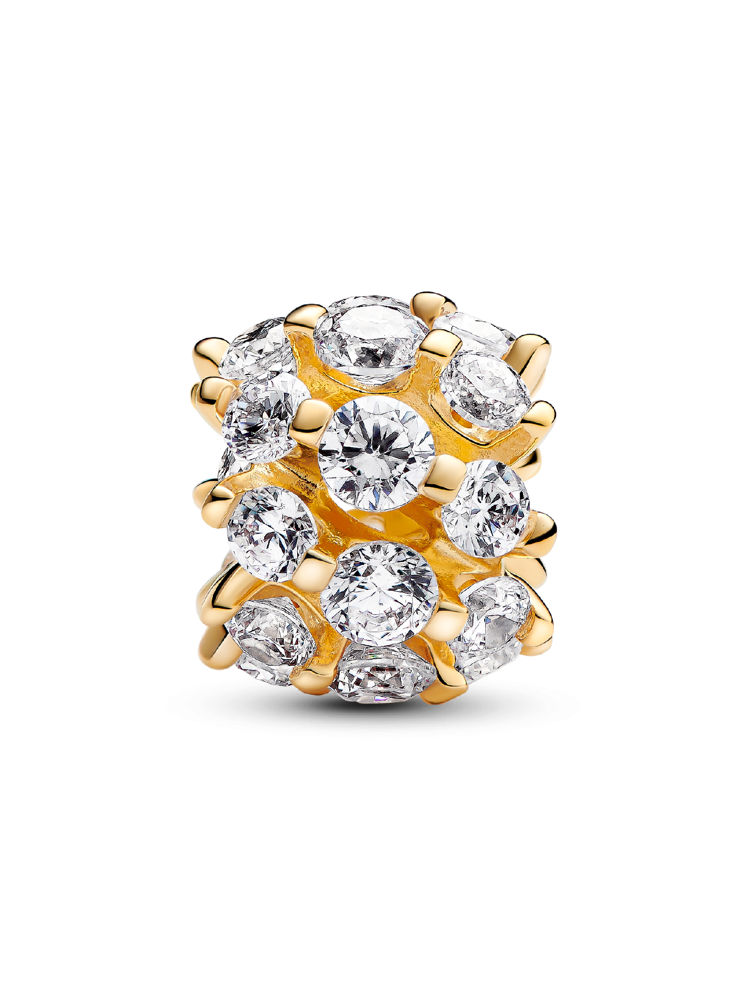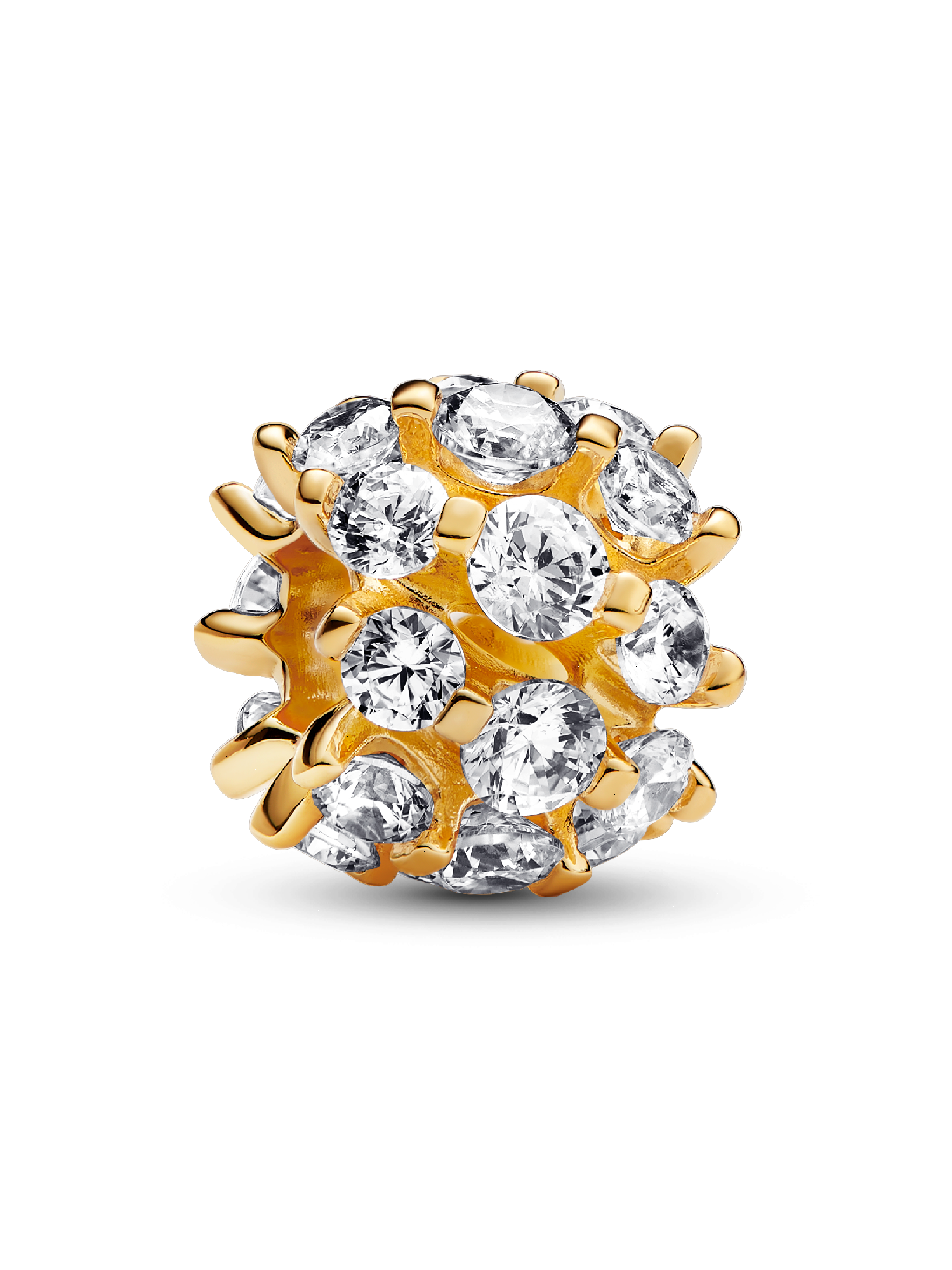 Elevate your stack with the Sparkling Round Charm, a Pandora Moments piece plated with the warm glow of 14k gold. The charm's standout motif showcases a sophisticated rounded design, accented by sparkling stones all around, which are set in prominent prongs. The stones are set in rows and there are three in each one to allow for more radiance. Perfect for adding a touch of shine to your existing collection or for gifting it to the sparkle lover in your life.
