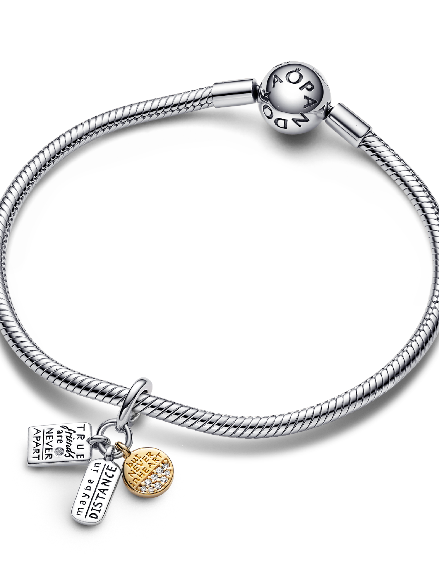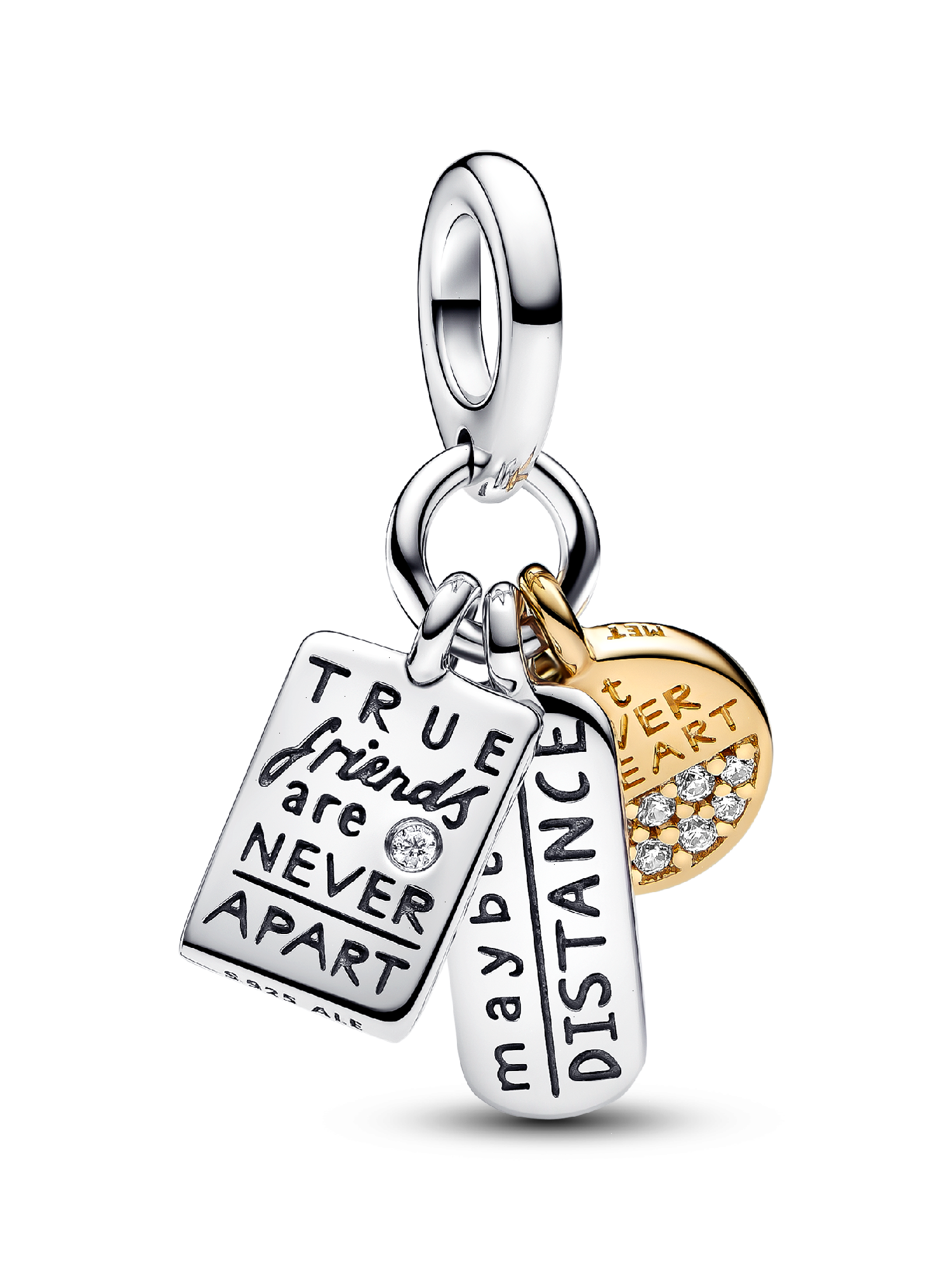 A tribute to your forever friends. This two-tone friends charm has three dangles, with engravings that read "TRUE friends are NEVER APART", "maybe in DISTANCE", "but NEVER in HEART", with pavé details and two interlinked engraved hearts. Wear it or gift it as a reminder of a connection that will always endure, no matter the distance.