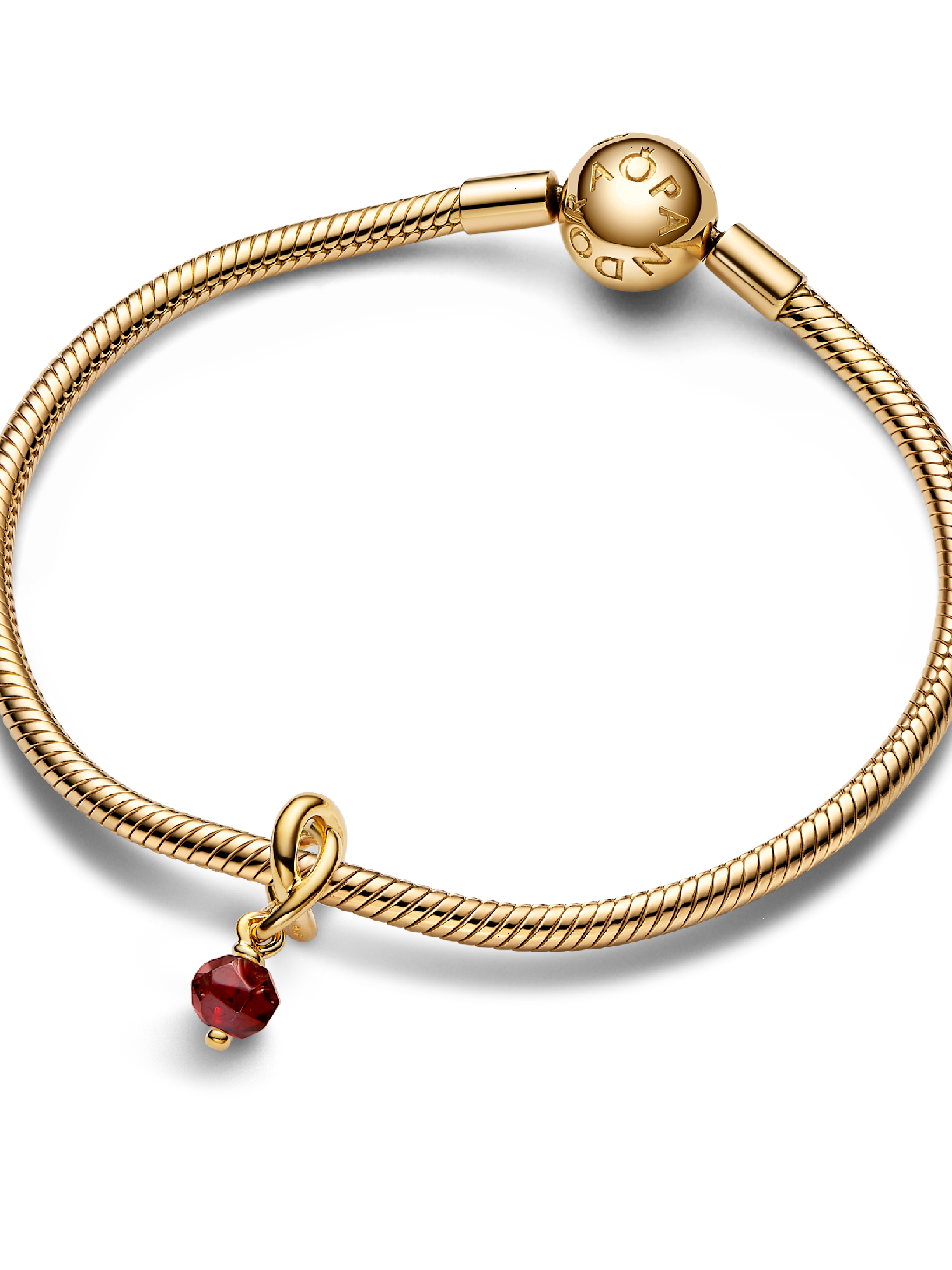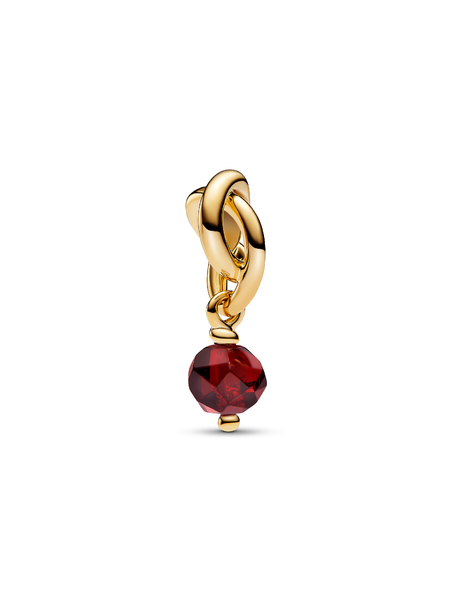 Wear a symbol of forever, that's personal to you. This 14k gold-plated dangle charm is made up of a triple knotted circle that intertwines to resemble an infinity sign. The twist carries a faceted salsa red man-made crystal, which dangles from the charm. Wear yours to add a drop of color to your carrier, or gift it to the one you want in your life forever.