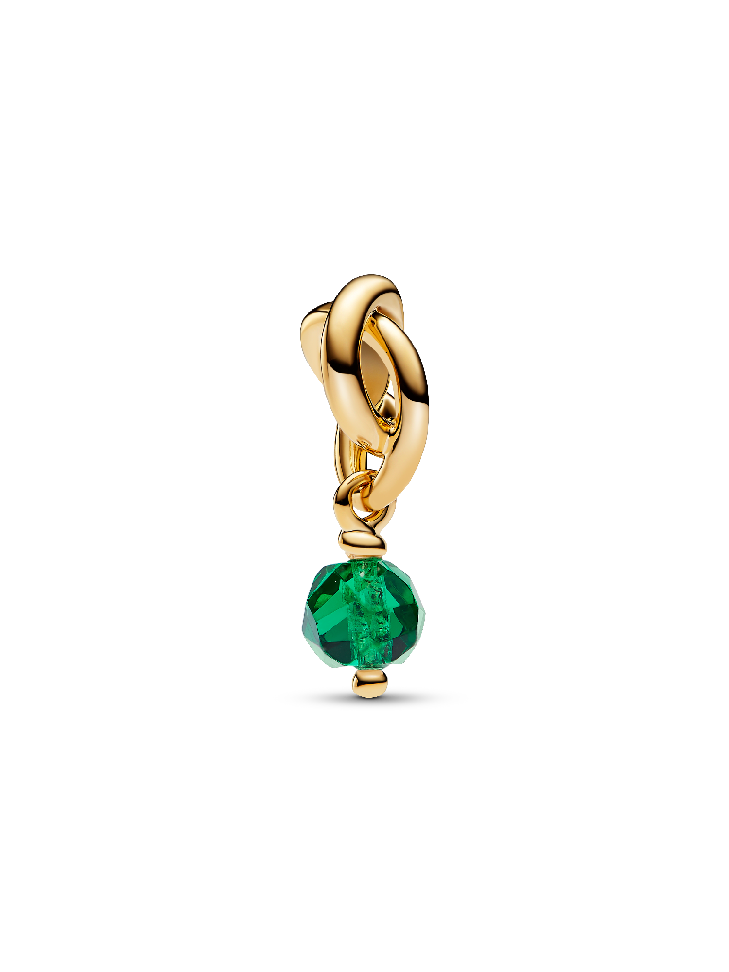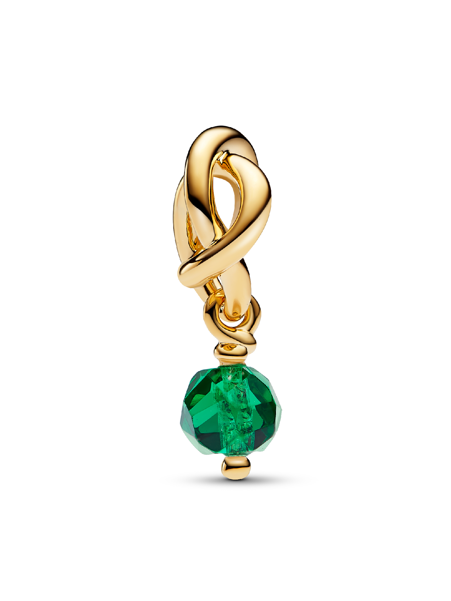 Wear a symbol of forever, that's personal to you. This 14k gold-plated dangle charm is made up of a triple knotted circle that intertwines to resemble an infinity sign. The twist carries a faceted royal green man-made crystal, which dangles from the charm. Wear yours to add a drop of color to your carrier, or gift it to the one you want in your life forever.
