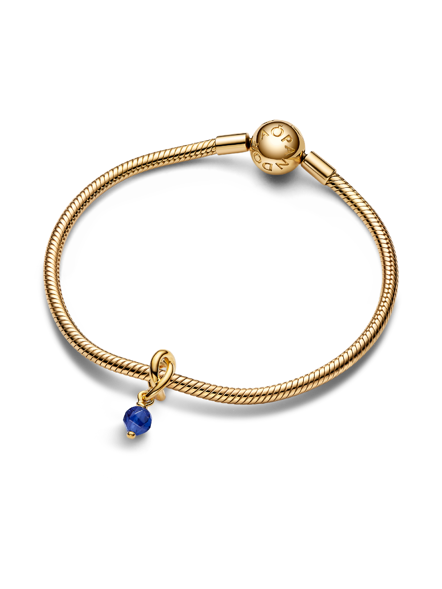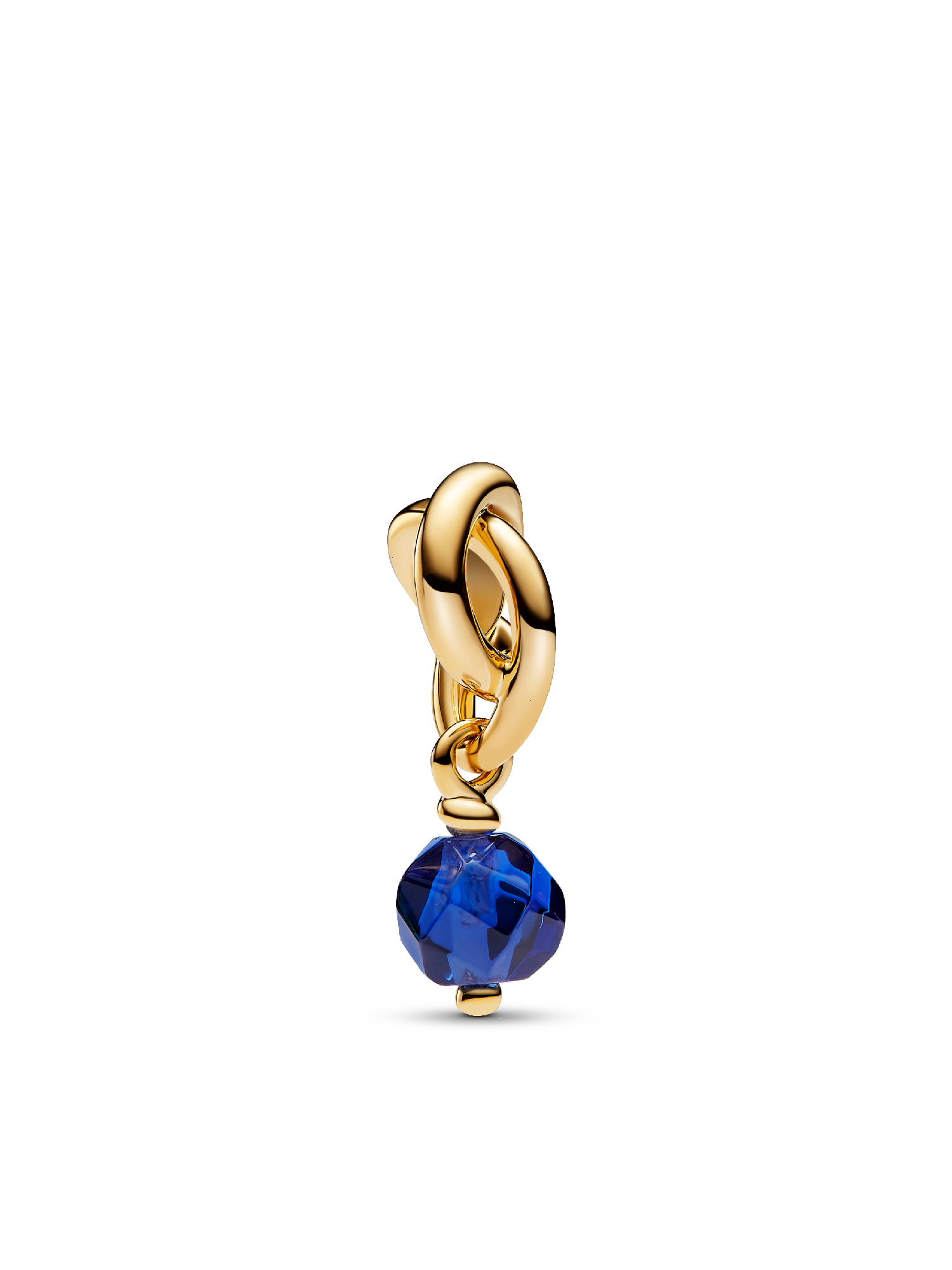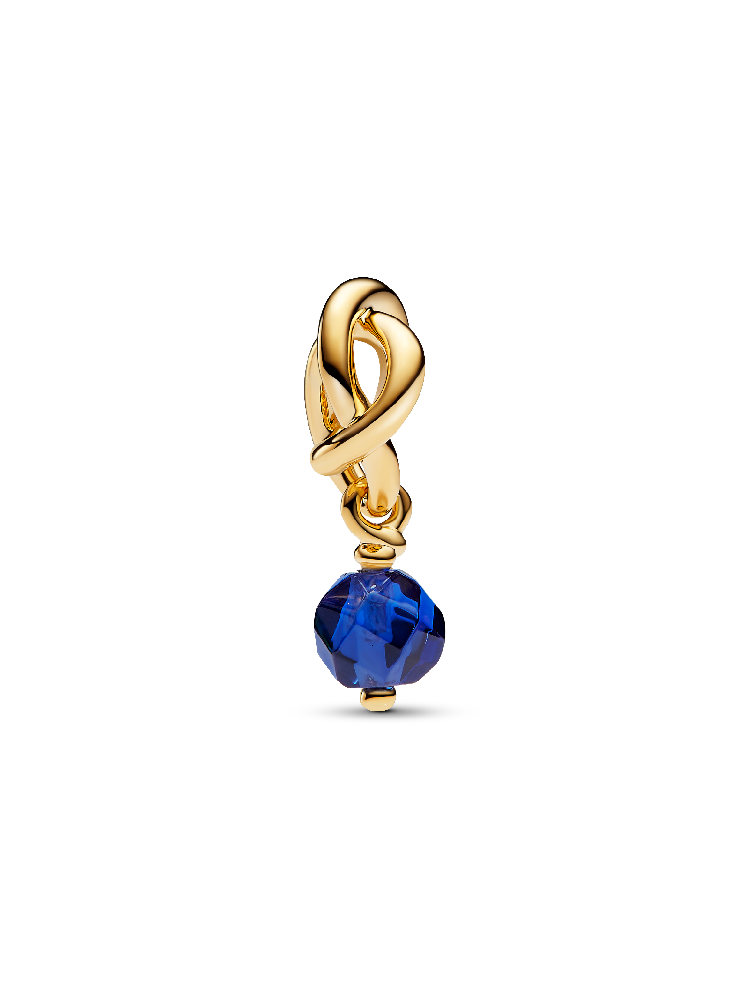 Wear a symbol of forever, that's personal to you. This 14k gold-plated dangle charm is made up of a triple knotted circle that intertwines to resemble an infinity sign. The twist carries a faceted princess blue man-made crystal, which dangles from the charm. Wear yours to add a drop of color to your carrier, or gift it to the one you want in your life forever.
