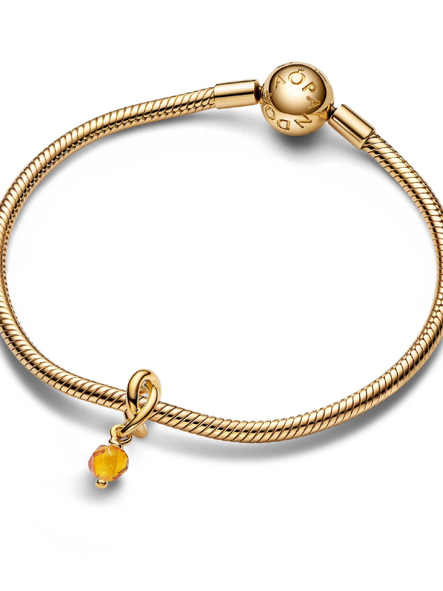 Wear a symbol of forever, that's personal to you. This 14k gold-plated dangle charm is made up of a triple knotted circle that intertwines to resemble an infinity sign. The twist carries a faceted honey-colored man-made crystal, which dangles from the charm. Wear yours to add a drop of color to your carrier, or gift it to the one you want in your life forever.