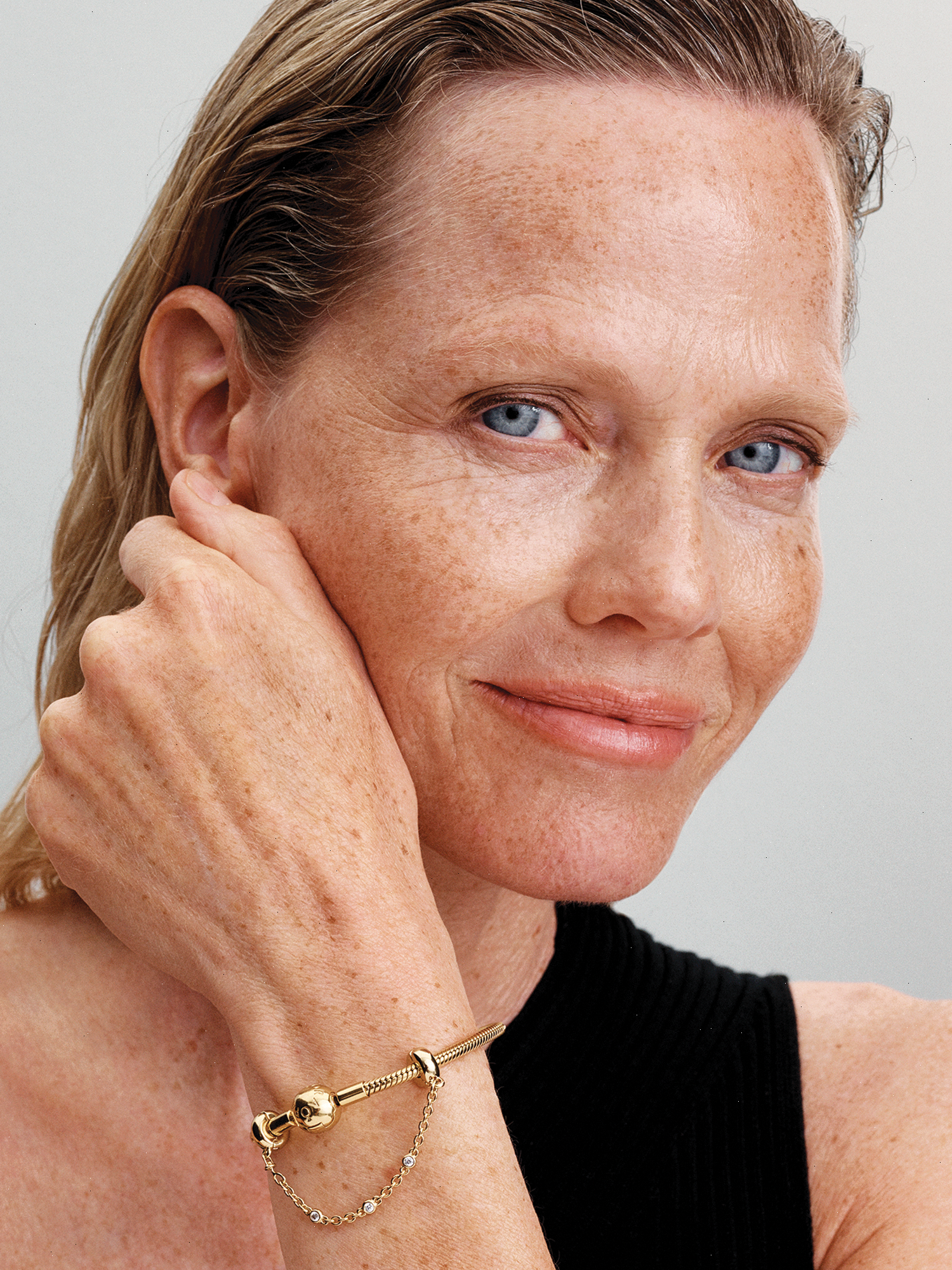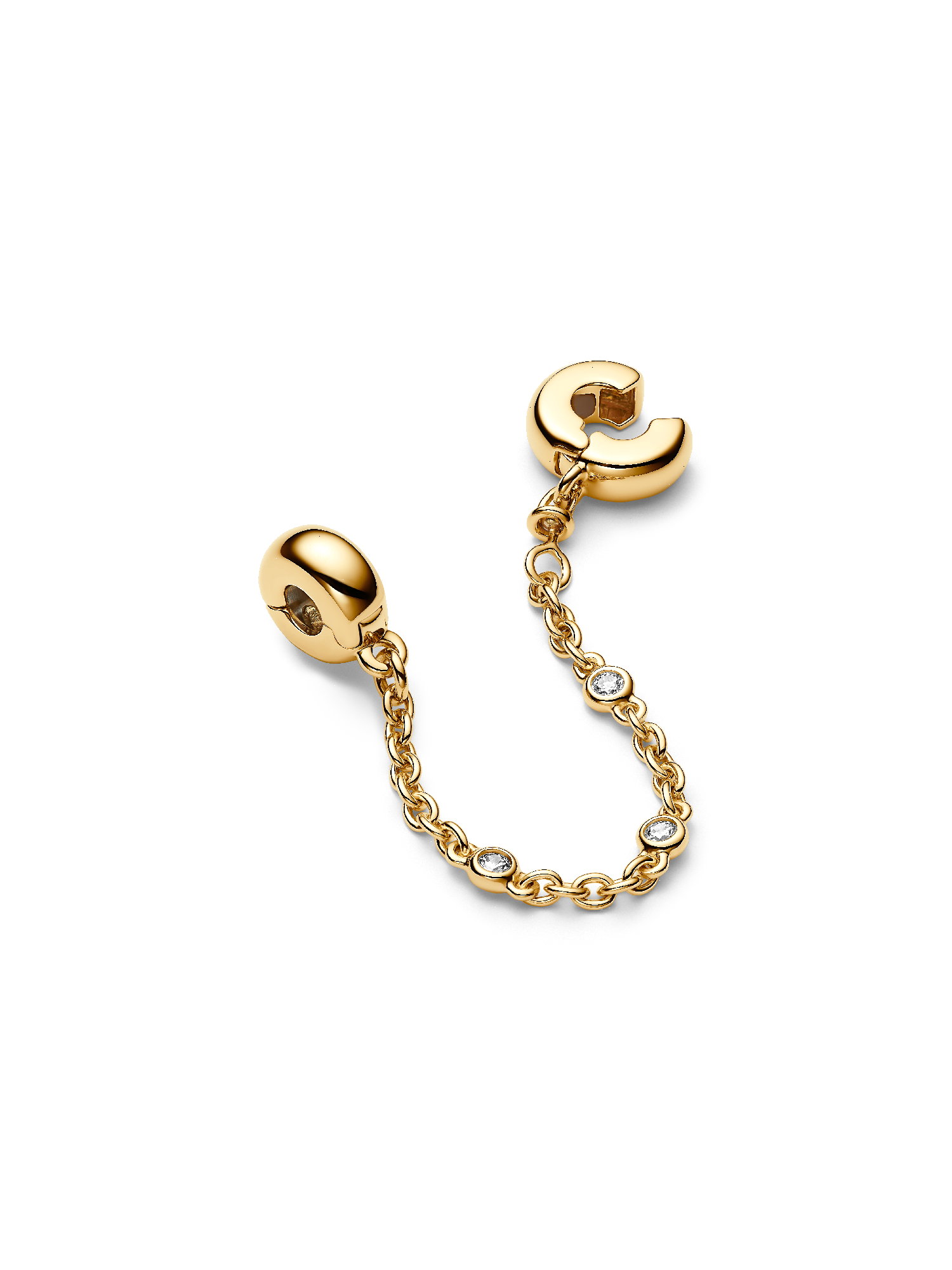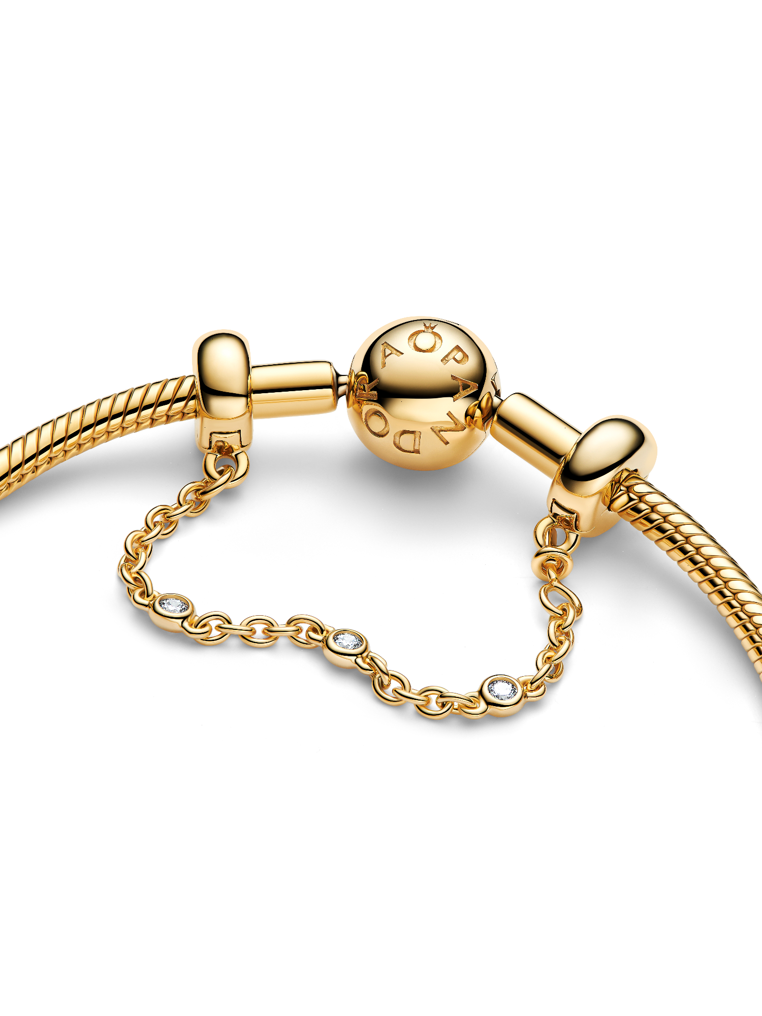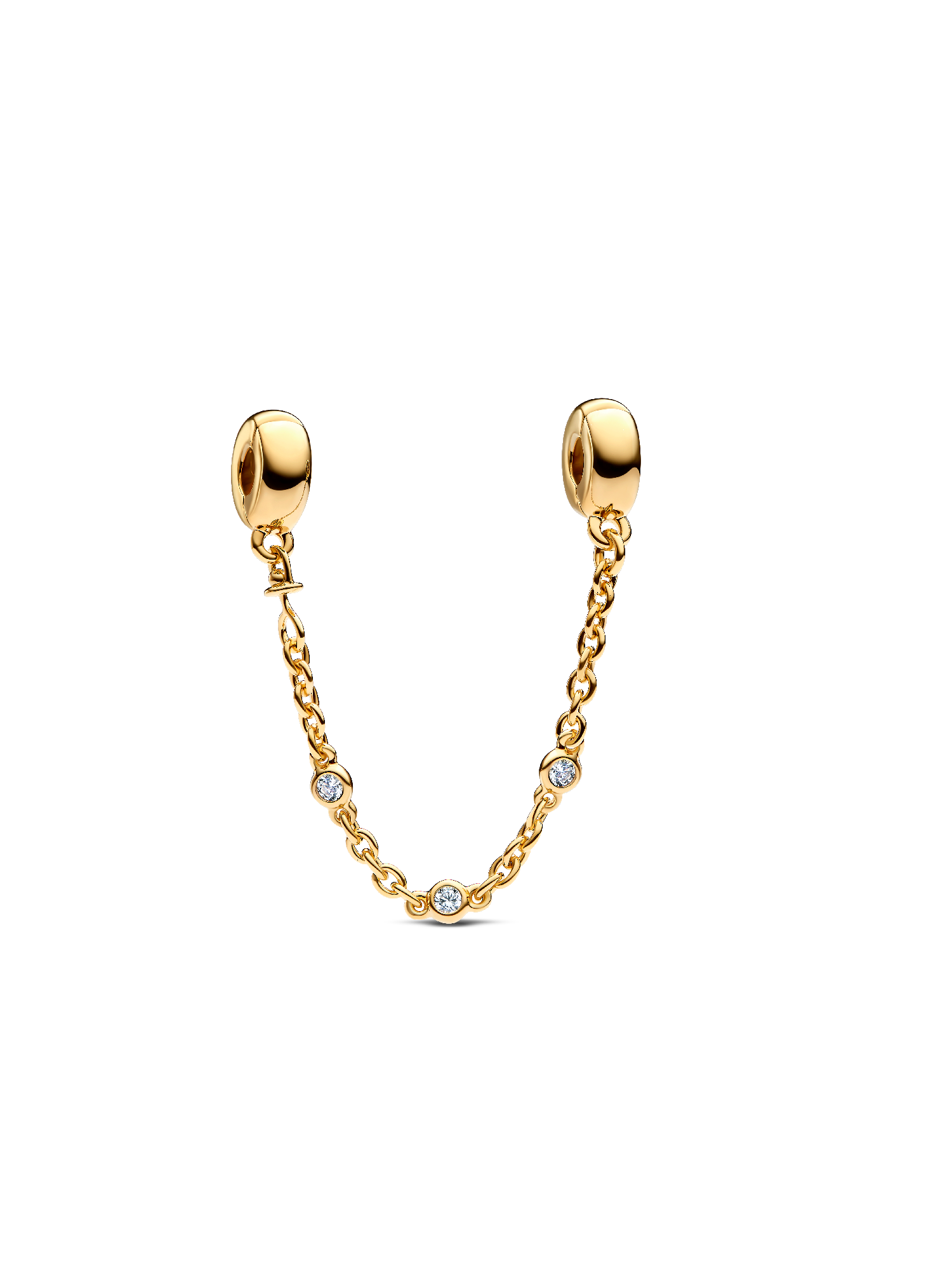 Keep your treasures safe with this 14k gold-plated safety chain. Each bail has threads inside to secure the charms on your Pandora Moments bracelet. It features three clear bezel-set stones on the chain to bring a touch of sparkle to your style. Perfect piece to add to your collection or to gift to the charm lover in your life.