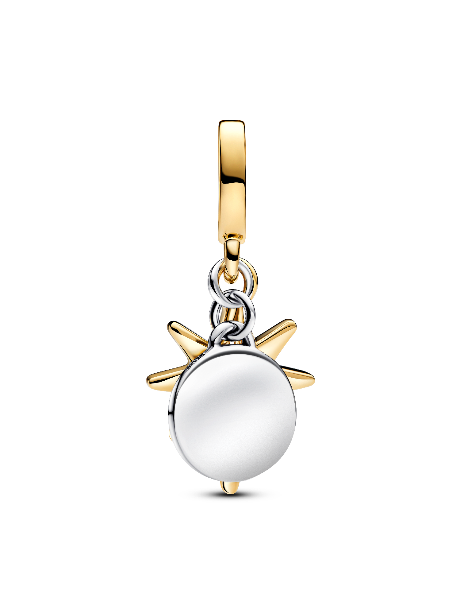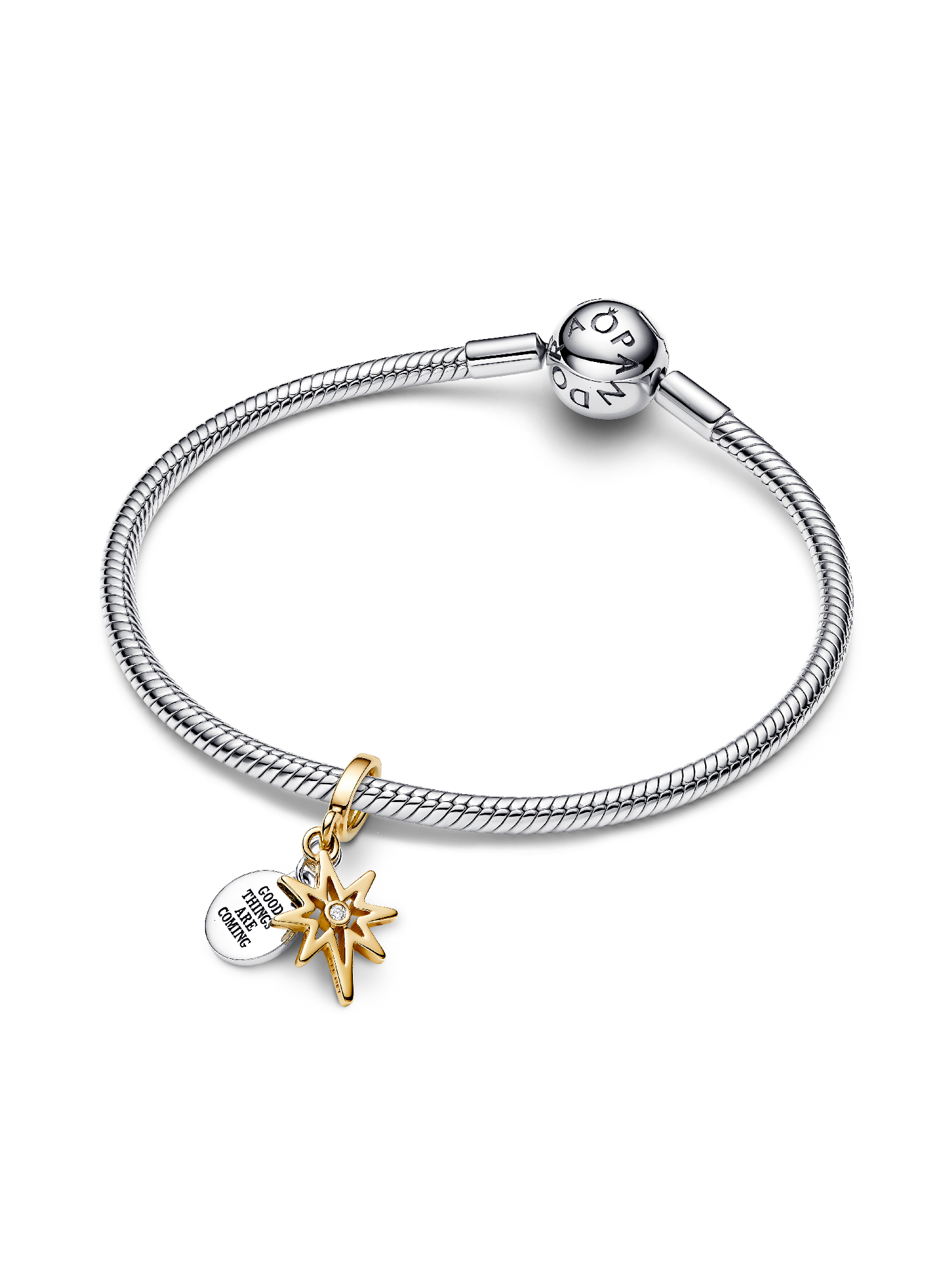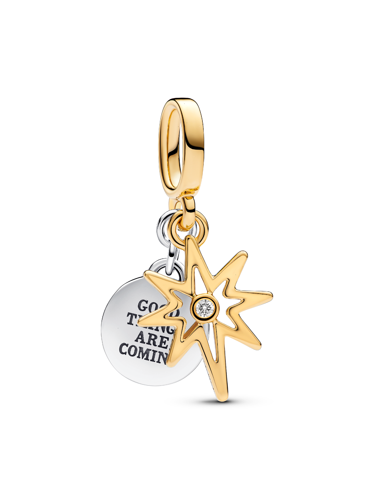 Shine a bright light everywhere you go with our Engravable North Star Lab-grown Diamond Dangle Charm. A 14k gold-plated North Star charm casts a warm glow with a radiant bezel-set lab-grown diamond at its centre. A sterling silver disc dangles next to it featuring the engraved message "GOOD THINGS ARE COMING" on one side, and a blank canvas on the other, ready to be engraved with your personal message.